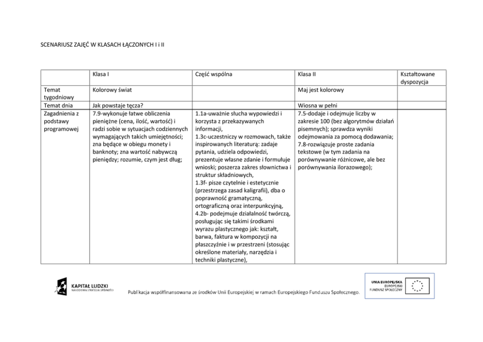 SCENARIUSZ ZAJĘĆ W KLASACH ŁĄCZONYCH I i II Klasa I Temat tygodniowy Temat dnia Zagadnienia z podstawy programowej Część wspólna Klasa II Kolorowy świat Maj jest kolorowy Jak powstaje tęcza? 7.9-wykonuje łatwe obliczenia pieniężne (cena, ilość, wartość) i radzi sobie w sytuacjach codziennych wymagających takich umiejętności; zna będące w obiegu monety i banknoty; zna wartość nabywczą pieniędzy; rozumie, czym jest dług; Wiosna w pełni 7.5-dodaje i odejmuje liczby w zakresie 100 (bez algorytmów działań pisemnych); sprawdza wyniki odejmowania za pomocą dodawania; 7.8-rozwiązuje proste zadania tekstowe (w tym zadania na porównywanie różnicowe, ale bez porównywania ilorazowego); 1.1a-uważnie słucha wypowiedzi i korzysta z przekazywanych informacji, 1.3c-uczestniczy w rozmowach, także inspirowanych literaturą: zadaje pytania, udziela odpowiedzi, prezentuje własne zdanie i formułuje wnioski; poszerza zakres słownictwa i struktur składniowych, 1.3f- pisze czytelnie i estetycznie (przestrzega zasad kaligrafii), dba o poprawność gramatyczną, ortograficzną oraz interpunkcyjną, 4.2b- podejmuje działalność twórczą, posługując się takimi środkami wyrazu plastycznego jak: kształt, barwa, faktura w kompozycji na płaszczyźnie i w przestrzeni (stosując określone materiały, narzędzia i techniki plastyczne), Kształtowane dyspozycja Cele operacyjne Uczeń:- wie, kiedy powstaje tęcza, - zna kolory tęczy, - rozwiązuje zadania z treścią, 5.4-współpracuje z innymi w zabawie, w nauce szkolnej i w sytuacjach życiowych; przestrzega reguł obowiązujących w społeczności dziecięcej oraz świecie dorosłych; wie, jak należy zachowywać się w stosunku do dorosłych i rówieśników (formy grzecznościowe); rozumie potrzebę utrzymywania dobrych relacji z sąsiadami w miejscu zamieszkania; jest chętny do pomocy, respektuje prawo innych do pracy i wypoczynku; 6.1- obserwuje i prowadzi proste doświadczenia przyrodnicze, analizuje je i wiąże przyczynę ze skutkiem; 10.3-cbierze udział w zabawach, minigrach i grach terenowych, zawodach sportowych, respektując reguły i podporządkowując się decyzjom sędziego, 10.3d- wie, jak należy zachować się w sytuacjach zwycięstwa i radzi sobie z porażkami w miarę swoich możliwości; Uczeń:- głośno czyta wiersz, - prawidłowo zapisuje spółgłoski miękkie w wybranych wyrazach, - aktywnie uczestniczy w ruchowych zabawach naśladowczych, - wykonuje obraz tęczy techniką „ mokre w mokrym” Pomoce dydaktyczne - dąży do wykonania zadania, - sprawnie wykonuje działania w zakresie 50, - wykonuje obraz tęczy techniką „ mokre w mokrym” Szarfy w 4 kolorach, kilka dużych obręczy, kartki z bloku akwarele, kartki ze znakami literowymi głosek miękkich, Szarfy w 4 kolorach, kilka dużych obręczy, kartki z bloku akwarele, płyta CD, latarka, Zabawa na dobry początek; „Rundka wstępna” Wszyscy siedzą w kręgu. Każdy uczeń uzupełnia zdanie nazwą jakiegoś koloru. Jestem w nastroju...(np. białym, zielonym, żółtym, czerwonym) i wyjaśnia , dlaczego. Przebieg zajęć Rozwiązywanie zadań: obliczenia pieniężne. Uczniowie wykonują ćwiczenia Z Naszego Elementarza cz.IV, s. 46,47. e. matematyczna e. polonistyczna: Czytanie przez nauczyciela tekstu z Naszego Elementarza cz. IV, s. 48. Kiedy powstaje tęcza? Jakie kolory ma tęcza? Sprawdzian umiejętności matematycznych: działania w zakresie 50. „ Wiosenna łąka” – czytanie wiersza B. Stępień. Nauczyciel wiesza na tablicy nazwy czynności wykonywanych przez zwierzęta w wierszu. Uczniowie wyszukują w Wykonanie doświadczenia: Uczeń świeci latarka na płytę CD, a drugi trzyma kartkę z bloku w odległości ok. 30 cm. Światło po odbiciu od płyty CD rozdziela się na różne kolory i widać je na kartce. Zabawa ruchowa : każde dziecko otrzymuje na kartce nazwę zwierzęcia , Nauczyciel mówi: Wyobraźcie sobie, że jesteście zwierzętami i zamieszkujecie łąkę. Jest noc, śpicie. Nagle zza lasu nieśmiało wyłania się słońce i budzi was ciepłymi promykami. Nauczyciel przerywa a dzieci naśladują zachowanie wylosowanego zwierzęcia . Przypomnienie sposobów zmiękczania głosek, wybrzmiewanie wyrazów, ustalanie spółgłosek miękkich. Zabawa; Połowa uczniów losuje wyrazy z lukami, połowa spółgłoski miękkie lub zmiękczone. Dzieci dobierają się w pary: pasująca spółgłoska miękka i tekście wykonawców czynności i zapisują ich nazwy na tablicy. Układanie i zapisanie 3 zdań z przepisanymi wyrazami wyraz z luką. Zapis powstałych wyrazów na tablicy. Zapis tematu: Maj jest kolorowy. Przepisanie wyrazów z tablicy. e. plastyczna: Malowanie techniką „ mokre w mokrym”: zamoczenie kartki wodą. Malowanie na niej farbami tęczy, obserwowanie łączenia się kolorów. Wystawa prac. e. ruchowa: Wyjście na podwórko szkolne . Odszukiwanie w otoczeniu jak największej liczby kolorów. Eksperyment: Robienie tęczy ze strumienia wody, obserwowanie kolorów Zabawy ruchowe: Wyścigi rzędów: Przeskoki przez obręcze, przechodzenie przez szarfy, biegi, skoki obunóż, na jednej nodze, czworakowanie. Układanie i zapisanie 6 zdań z przepisanymi wyrazami.
