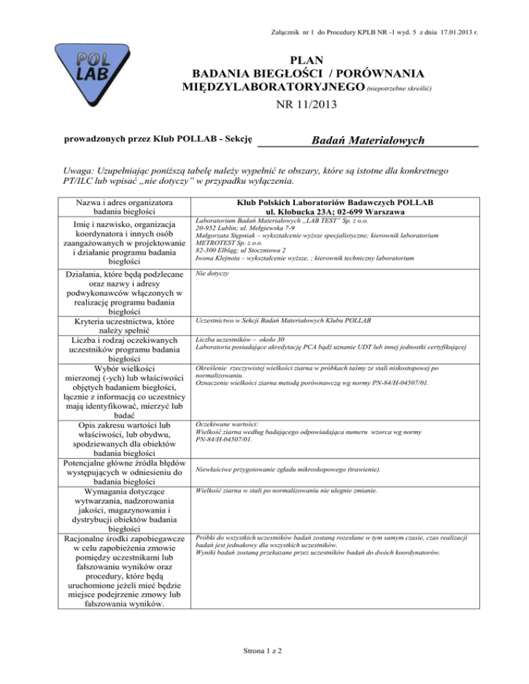 Załącznik nr 1 do Procedury KPLB NR -1 wyd. 5 z dnia 17.01.2013 r. PLAN BADANIA BIEGŁOŚCI / PORÓWNANIA MIĘDZYLABORATORYJNEGO (niepotrzebne skreślić) NR 11/2013 (wpisuje Sekretariat POLLAB) prowadzonych przez Klub POLLAB - Sekcję Badań Materiałowych Uwaga: Uzupełniając poniższą tabelę należy wypełnić te obszary, które są istotne dla konkretnego PT/ILC lub wpisać „nie dotyczy” w przypadku wyłączenia. Klub Polskich Laboratoriów Badawczych POLLAB ul. Kłobucka 23A; 02-699 Warszawa Nazwa i adres organizatora badania biegłości Imię i nazwisko, organizacja koordynatora i innych osób zaangażowanych w projektowanie i działanie programu badania biegłości Laboratorium Badań Materiałowych „LAB TEST” Sp. z o.o. 20-952 Lublin; ul. Mełgiewska 7-9 Małgorzata Stępniak – wykształcenie wyższe specjalistyczne; kierownik laboratorium METROTEST Sp. z o.o. 82-300 Elbląg; ul Stoczniowa 2 Iwona Klejnota – wykształcenie wyższe, ; kierownik techniczny laboratorium Działania, które będą podzlecane oraz nazwy i adresy podwykonawców włączonych w realizację programu badania biegłości Kryteria uczestnictwa, które należy spełnić Liczba i rodzaj oczekiwanych uczestników programu badania biegłości Wybór wielkości mierzonej (-ych) lub właściwości objętych badaniem biegłości, łącznie z informacją co uczestnicy mają identyfikować, mierzyć lub badać Opis zakresu wartości lub właściwości, lub obydwu, spodziewanych dla obiektów badania biegłości Potencjalne główne źródła błędów występujących w odniesieniu do badania biegłości Wymagania dotyczące wytwarzania, nadzorowania jakości, magazynowania i dystrybucji obiektów badania biegłości Racjonalne środki zapobiegawcze w celu zapobieżenia zmowie pomiędzy uczestnikami lub fałszowaniu wyników oraz procedury, które będą uruchomione jeżeli mieć będzie miejsce podejrzenie zmowy lub fałszowania wyników. Nie dotyczy Uczestnictwo w Sekcji Badań Materiałowych Klubu POLLAB Liczba uczestników – około 30 Laboratoria posiadające akredytację PCA bądź uznanie UDT lub innej jednostki certyfikującej Określenie rzeczywistej wielkości ziarna w próbkach taśmy ze stali niskostopowej po normalizowaniu. Oznaczenie wielkości ziarna metodą porównawczą wg normy PN-84/H-04507/01. Oczekiwane wartości: Wielkość ziarna według badającego odpowiadająca numeru wzorca wg normy PN-84/H-04507/01. Niewłaściwe przygotowanie zgładu mikroskopowego (trawienie). Wielkość ziarna w stali po normalizowaniu nie ulegnie zmianie. Próbki do wszystkich uczestników badań zostaną rozesłane w tym samym czasie, czas realizacji badań jest jednakowy dla wszystkich uczestników. Wyniki badań zostaną przekazane przez uczestników badań do dwóch koordynatorów. Strona 1 z 2 Załącznik nr 1 do Procedury KPLB NR -1 wyd. 5 z dnia 17.01.2013 r. Badania należy przeprowadzić zgodnie z wymaganiami normy PN-84/H-04507/01. Opis informacji, którą należy Wyniki badania uzupełnić o niepewność pomiaru dla k=2; p=0,95 dostarczyć uczestnikom oraz Wyniki badań należy przesłać na adres do dwóch koordynatorów w terminie do:. harmonogram realizacji kolejnych 30.07.2013 etapów programu Próbki do badań zostaną rozesłane do uczestników do:30.05.2013 Częstość lub daty dystrybucji Termin wykonania badań: 30.07.2013 obiektów badań biegłości do uczestników, ostateczne terminy przekazania wyników przez uczestników i, jeżeli zasadne, daty, kiedy uczestnicy powinni wykonać badania lub pomiary Próbki do badań należy przygotować zgodnie z instrukcją przekazaną każdemu uczestnikowi wraz Wszelkie informacje dotyczące z obiektem do badań. metod lub procedur, potrzebne uczestnikom do przygotowania materiału do badań i przeprowadzenia badań lub pomiarów Procedury dotyczące metod badań Dla potwierdzenia jednorodności materiału przygotowano 3 próbki do badań z różnych miejsc taśmy. lub pomiarów, które będą Badanie wielkości ziarna przeprowadzono w trzech akredytowanych laboratoriach w tym wykorzystane do badania zakresie. jednorodności i stabilności Rozrzut wyników dla badanych próbek wynosi: obiektów badania biegłości oraz, ±0,5 wzorca. jeżeli ma zastosowanie, określenie ich żywotności biologicznej Wzór sprawozdania z badań w załączeniu Przygotowanie jednolitych form sprawozdań, które będą stosować uczestnicy Analiza statystyczna na podstawie normy ISO 1352:2005(E). Dokładny opis analizy statystycznej, która będzie stosowana Wartość przypisana na podstawie wyników laboratoriów uczestniczących, szacowanie odpornej Źródło, spójność pomiarowa i średniej wartość według algorytmu A normy ISO 13528:2005 (E) niepewność pomiaru każdej wartości przypisanej Ocena rezultatów na podstawie wskaźnika Z Kryteria oceny rezultatów działania uczestników Opis danych, raportów pośrednich Nie przewiduje się raportów pośrednich lub informacji, które należy przekazać zwrotnie uczestnikom W raporcie z porównań międzylaboratoryjnych, przedstawione zostaną wyniki laboratoriów Określenie zakresu w jakim uczestniczących, wyniki analizy statystycznej oraz ocena biegłości każdego laboratorium. zostaną opublikowane wyniki uczestników i wnioski wynikające z programu badania biegłości Działania, które należy podjąć w Zostaną przygotowane więcej niż uczestników 5 odcinki taśmy do badań. wypadku zaginięcia lub uszkodzenia obiektów badania biegłości Koordynator Małgorzata Stępniak; Iwona Klejnota 13.04.2013 Weryfikator Bogusław Marciniak 15.04.2013 Przewodniczący/Członek Kolegium Sekcji Badań Materiałowych (wpisać właściwą) Bogusław Marciniak 15.04.2013 Krystyna Krzyśko, 12.05.2013 Prezes/Członek Zarządu Klubu POLLAB Strona 2 z 2