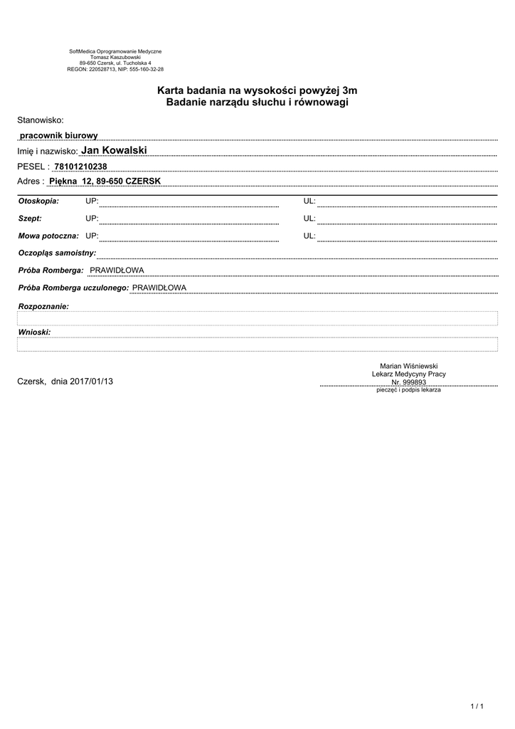 SoftMedica Oprogramowanie Medyczne Tomasz Kaszubowski 89-650 Czersk, ul. Tucholska 4 REGON: 220528713, NIP: 555-160-32-28 Karta badania na wysokości powyżej 3m Badanie narządu słuchu i równowagi Stanowisko: pracownik biurowy Imię i nazwisko: Jan Kowalski PESEL : 78101210238 Adres : Piękna 12, 89-650 CZERSK Otoskopia: UP: UL: Szept: UP: UL: Mowa potoczna: UP: UL: Oczopląs samoistny: Próba Romberga: PRAWIDŁOWA Próba Romberga uczulonego: PRAWIDŁOWA Rozpoznanie: Wnioski: Czersk, dnia 2017/01/13 Marian Wiśniewski Lekarz Medycyny Pracy Nr. 999893 pieczęć i podpis lekarza 1/1