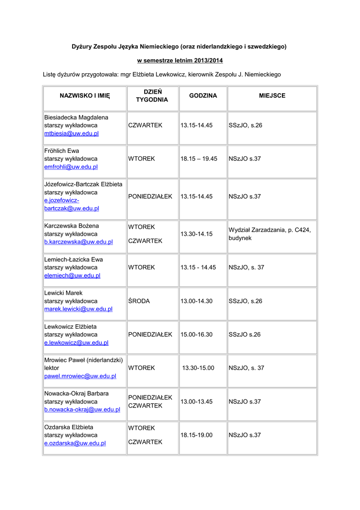 Dyżury Zespołu Języka Niemieckiego (oraz niderlandzkiego i szwedzkiego) w semestrze letnim 2013/2014 Listę dyżurów przygotowała: mgr Elżbieta Lewkowicz, kierownik Zespołu J. Niemieckiego NAZWISKO I IMIĘ DZIEŃ TYGODNIA GODZINA MIEJSCE Biesiadecka Magdalena starszy wykładowca [email protected] CZWARTEK 13.15-14.45 SSzJO, s.26 Fröhlich Ewa starszy wykładowca [email protected] WTOREK 18.15 – 19.45 NSzJO s.37 Józefowicz-Bartczak Elżbieta starszy wykładowca PONIEDZIAŁEK [email protected] 13.15-14.45 NSzJO s.37 Karczewska Bożena starszy wykładowca [email protected] 13.30-14.15 Wydział Zarzadzania, p. C424, budynek WTOREK CZWARTEK Lemiech-Łazicka Ewa starszy wykładowca [email protected] WTOREK 13.15 - 14.45 NSzJO, s. 37 Lewicki Marek starszy wykładowca [email protected] ŚRODA 13.00-14.30 SSzJO, s.26 Lewkowicz Elżbieta starszy wykładowca [email protected] PONIEDZIAŁEK 15.00-16.30 SSzJO s.26 Mrowiec Paweł (niderlandzki) lektor WTOREK [email protected] 13.30-15.00 NSzJO, s. 37 Nowacka-Okraj Barbara starszy wykładowca [email protected] 13.00-13.45 NSzJO s.37 18.15-19.00 NSzJO s.37 Ozdarska Elżbieta starszy wykładowca [email protected] PONIEDZIAŁEK CZWARTEK WTOREK CZWARTEK Parowenko Robert (szwedzki) adiunkt PIĄTEK [email protected] 14.45-16.15 NSzJO s.37 11.30-13.00 NSzJO s.37 18.15-19.00 NSzJO, s. 37 Sworowska Anna lektor (szwedzki, niemiecki) PIĄTEK [email protected] Prusińska Bożena starszy wykładowca [email protected] WTOREK CZWARTEK Raabe Joanna starszy wykładowca [email protected] PIĄTEK 13.15-14.45 SSzJO s.26 Stachurski Marcin lektor [email protected] PONIEDZIAŁEK 13.30-15.00 NSzJO, s. 37 Śmiechowska Jadwiga starszy wykładowca [email protected] WTOREK 13.00-14.30 NSzJO s.37 Zakrzewska Teresa starszy wykładowca [email protected] WTOREK CZWARTEK 18.15-19.00 NSzJO s.37 Zegadło Katarzyna wykładowca [email protected] CZWARTEK 16.30-18.00 NSzJO, s.37 Zielińska Hanna starszy wykładowca [email protected] Urlop NSzJO = „nowa” Szkoła Języków Obcych ul. Krakowskie Przedmieście 26/28, 00-927 Warszawa SszJO = „stara” Szkoła Języków Obcych ul. Nowy Świat 69, 00-927 Warszawa