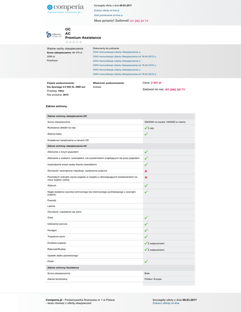 Szczegóły oferty z dnia 08.03.2017 Zobacz ofertę on-line Zrób porównanie on-line Masz pytania? Zadzwoń! 22 395 52 72 OC AC Premium Assistance Ważne cechy ubezpieczenia: Dokumenty do pobrania: Suma ubezpieczenia: 94 470 zł OWU Komunikacja Liberty Ubezpieczenia 2000 zł OWU komunikacja Liberty Ubezpieczenia od 16.04.2015 Kosztorys OWU Komunikacja Liberty Ubezpieczenia OWU komunikacja Liberty Ubezpieczenia od 16.04.2015 OWU Komunikacja Liberty Ubezpieczenia OWU komunikacja Liberty Ubezpieczenia od 16.04.2015 Pojazd, podsumowanie: Właściciel, podsumowanie: Kia Sportage 2.0 GDI XL 2WD aut Kobieta Przebieg: 10km Cena: 2 437 zł Zadzwoń do nas: 22 395 52 71 Rok produkcji: 2015 Zakres ochrony Zakres ochrony ubezpieczenia OC Suma ubezpieczenia Rozłożenie składki na raty 5000000 na osobie 1000000 w mieniu 2 raty Zielona karta Dodatkowe świadczenia w ramach OC Zakres ochrony ubezpieczenia AC Zderzenie z innym pojazdem Zderzenie z osobami, zwierzętami, lub przedmiotami znajdującymi się poza pojazdem Uszkodzenie przez osoby trzecie (wandalizm) Zamieszki, wewnętrzne niepokoje, wydarzenia wojenne Powstałych wskutek użycia pojazdu w związku z obowiązującymi świadczeniami na rzecz wojska i policji Wybuch Nagłe działanie czynnika termicznego lub chemicznego pochodzącego z zewnątrz pojazdu Powódź Lawina Osunięcie i zapadanie się ziemi Grad Uderzenie pioruna Huragan Trzęsienie ziemi Kradzież pojazdu Z wyłączeniami Rabunek/Rozbój Z wyłączeniami Upadek statku powietrznego Pożar Zakres ochrony Assistance Suma ubezpieczenia Brak Zakres terytorialny Polska i Europa Comperia.pl - Porównywarka finansowa nr 1 w Polsce - teraz również z ofertą ubezpieczeń Szczegóły oferty z dnia 08.03.2017 Zobacz ofertę on-line Szczegóły oferty z dnia 08.03.2017 Zobacz ofertę on-line Zrób porównanie on-line Masz pytania? Zadzwoń! 22 395 52 72 Wiek pojazdu do którego można wykupić ubezpieczenie Do 12 lat Rodzaj pojazdu na który można wykupić ubezpieczenie Samochody osobowe i ciężarowe Ograniczenia ze względu na sposób użytkowania pojazdu (np. taxi, nauka jazdy, rent a car) Nie są objęte ubezpieczeniem Opcje zawarcia Tylko z OC lub z OC i AC Usprawnienie pojazdu na miejscu zdarzenia Do wysokości 600 zł. (na terytorium Polski lub 500 euro (za granicą) oraz naprawa nie przekroczy 1 godziny Pomoc w razie awarii Pomoc w razie wypadku Limit odległości od miejsca zamieszkania 150 km od miejsca zdarzenia Miejsce holowania Do warsztatu lub do najbliższego miejsca czasowego postoju położonego w odległości nie większej niż 150 km od miejsca zdarzenia Samochód zastępczy Po wypadku i kradzieży (bez względu na odległość miejsca zdarzenia od miejsca zamieszkania), po awarii tylko w sytuacji gdy awaria nastąpiła w odległości co najmniej 50 km od miejsca zamieszkani Ubezpieczonego Złomowanie pojazdu Parkowanie pojazdu Do 4 dób do wysokości 50 zł. na terytorium Polski lub 30 euro za granicą . Świadczenie przysługuje tylko gdy unieruchomienie nastąpiło powyżej 50 km od miejsca zamieszkaniaUbezpieczonego Transport zastępczy/przewóz osób O ile unieruchomienie na skutek awarii lub wypadku miało miejsce w odległości 50 km od początku lub celu podróży Nocleg/zakwaterowanie Maksymalnie 1 doba, o ile unieruchomienie na skutek awarii lub wypadku miało miejsce w odległości 50 km od początku lub celu podróży Dodatkowe informacje Pomoc przy wymianie koła, holowanie pojazdu poszkodowanego, pomoc przy otwarciu pojazdu, dowóz paliwa lub pomoc w przypadku zatankowani niewłaściwego paliwa, pomoc w przypadku zagubienia lub uszkodzenia kluczyków, dostarczenie części zamiennych, odbiór pojazdu po naprawie, kierowca zastępczy, przewóz medyczny, opieka nad dziećmi dostawa leków Terytorium ochrony Terytorium ochrony ubezpieczenia AC Kraje Unii Europejskiej Algeria Albania Libia Maroko Mołdawia Białoruś Bez kradzieży i wandalizmu Rosja (część europejska) Czarnogóra Serbia Bośnia i Hercegowina Tunezja Comperia.pl - Porównywarka finansowa nr 1 w Polsce - teraz również z ofertą ubezpieczeń Szczegóły oferty z dnia 08.03.2017 Zobacz ofertę on-line Szczegóły oferty z dnia 08.03.2017 Zobacz ofertę on-line Zrób porównanie on-line Masz pytania? Zadzwoń! 22 395 52 72 Iran Turcja Izrael Ukraina Bez kradzieży i wandalizmu Wyłączenia Wyłączenia ubezpieczenia AC Udział własny w szkodzie Wprowadzony ( jego udział ustala się na etapie zawierania umowy) Amortyzacja za części Do 3 lat 20%; 3-5 lat 35%; 5-8 lat 45%; 8 lat i więcej 55% Rodzaj stacji naprawczej (ze względu na metodę naprawy) Warsztaty nieautoryzowane Rodzaj używanych części do naprawy Części zamienne o porównywalnej jakości Okres eksploatacji pojazdu w jakim można wykupić polisę AutoCasco Do 12 lat Minimalna szkoda (franszyza integralna) 200 zł. Szkoda została spowodowana wskutek rażącego niedbalstwa Nie wypłaci Kierowanie pojazdem w stanie nietrzeźwości, po zażyciu alkoholu, środków odurzających, substancji psychotropowych, lub jego pochodnych Nie wypłaci Kierujący pojazdem nie posiadał uprawnień do prowadzenia pojazdu Nie wypłaci Sprawca zbiegł lub oddalił się z miejsca zdarzenia nie wypłaci Pojazd nie miał ważnego przeglądu technicznego lub nie jest dopuszczony do ruchu Nie wypłaci Przywłaszczenie pojazdu Nie wypłaci Kradzież wyposażenia dodatkowego Uszkodzenie wyposażenia dodatkowego pojazdu Wada fabryczna pojazdu, jego naprawa, użytkowanie w sposób niezgodny z jego przeznaczeniem O ile nie umówiono się inaczej odpowiedzialność do 20% wartości pojazdu wskazanej w umowie Nie wypłaci Uszkodzenie lub zniszczenie ogumienia Chyba, że uszkodzenia takie powstały w wyniku aktu wandalizmu Konsumpcja sumy ubezpieczenia Suma ubezpieczenia obniża się o każdą kwotę wypłaconego odszkodowania Szyby Możliwość dokupienia ubezpieczenia szybowego Wartość pojazdu Z dnia szkody Zasada proporcji Dodatkowe wyłączenia W przyp
