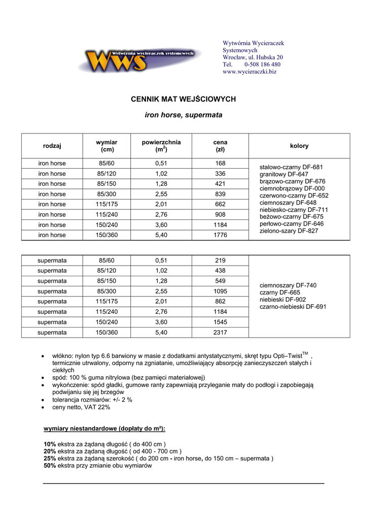 Wytwórnia Wycieraczek Systemowych Wrocław, ul. Hubska 20 Tel. 0-508 186 480 www.wycieraczki.biz CENNIK MAT WEJŚCIOWYCH iron horse, supermata rodzaj wymiar (cm) powierzchnia (m2) cena (zł) iron horse 85/60 0,51 168 iron horse 85/120 1,02 336 iron horse 85/150 1,28 421 iron horse 85/300 2,55 839 iron horse 115/175 2,01 662 iron horse 115/240 2,76 908 iron horse 150/240 3,60 1184 iron horse 150/360 5,40 1776 supermata 85/60 0,51 219 supermata 85/120 1,02 438 supermata 85/150 1,28 549 supermata 85/300 2,55 1095 supermata 115/175 2,01 862 supermata 115/240 2,76 1184 supermata 150/240 3,60 1545 supermata 150/360 5,40 2317 kolory stalowo-czarny DF-681 granitowy DF-647 brązowo-czarny DF-676 ciemnobrązowy DF-000 czerwono-czarny DF-652 ciemnoszary DF-648 niebiesko-czarny DF-711 beżowo-czarny DF-675 perłowo-czarny DF-646 zielono-szary DF-827 ciemnoszary DF-740 czarny DF-665 niebieski DF-902 czarno-niebieski DF-691 włókno: nylon typ 6.6 barwiony w masie z dodatkami antystatycznymi, skręt typu Opti–TwistTM , termicznie utrwalony, odporny na zgniatanie, umożliwiający absorpcję zanieczyszczeń stałych i ciekłych spód: 100 % guma nitrylowa (bez pamięci materiałowej) wykończenie: spód gładki, gumowe ranty zapewniają przyleganie maty do podłogi i zapobiegają podwijaniu się jej brzegów tolerancja rozmiarów: +/- 2 % ceny netto, VAT 22% wymiary niestandardowe (dopłaty do m²): 10% ekstra za żądaną długość ( do 400 cm ) 20% ekstra za żądaną długość ( od 400 - 700 cm ) 25% ekstra za żądaną szerokość ( do 200 cm - iron horse, do 150 cm – supermata ) 50% ekstra przy zmianie obu wymiarów