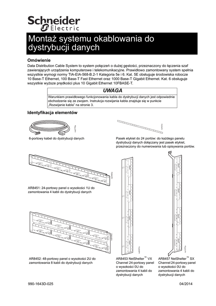 Montaż systemu okablowania do dystrybucji danych Omówienie Data Distribution Cable System to system połączeń o dużej gęstości, przeznaczony do łączenia szaf zawierających urządzenia komputerowe i telekomunikacyjne. Prawidłowo zamontowany system spełnia wszystkie wymogi normy TIA-EIA-568-B.2-1 Kategoria 5e i 6. Kat. 5E obsługuje środowiska robocze 10 Base-T Ethernet, 100 Base-T Fast Ethernet oraz 1000 Base-T Gigabit Ethernet. Kat. 6 obsługuje wszystkie wyższe prędkości plus 10 Gigabit Ethernet 10FBASE-T. UWAGA Warunkiem prawidłowego funkcjonowania kabla do dystrybucji danych jest odpowiednie obchodzenie się ze zwojem. Instrukcja rozwijania kabla znajduje się w punkcie „Rozwijanie kabla” na stronie 3. na0778a na0620a Identyfikacja elementów Pasek etykiet do 24 portów: do każdego panelu dystrybucji danych dołączany jest pasek etykiet, przeznaczony do numerowania lub opisywania portów. na0495a 6-portowy kabel do dystrybucji danych AR8452: 48-portowy panel o wysokości 2U do zamontowania 8 kabli do dystrybucji danych 990-1643D-025 AR8453 NetShelter™ VX Channel 24-portowy panel o wysokości 0U do zamontowania 4 kabli do dystrybucji danych na1075a na0497a na0496a AR8451: 24-portowy panel o wysokości 1U do zamontowania 4 kabli do dystrybucji danych AR8457 NetShelter™ SX Channel 24-portowy panel o wysokości 0U do zamontowania 4 kabli do dystrybucji danych 04/2014 Akcesoria do mocowania elementów Elementy połączeniowe (w zestawie) Typ panelu 0U 1U 2U Nakrętka koszyczkowa M6 2 4 4 Śruba z łbem krzyżowym M6 2 4 4 Śruba #12-24 0 4 4 Plastikowa podkładka sprężysta 2 4 4 Potrzebne narzędzia Narzędzie do nakrętek koszyczkowych Śrubokręt krzyżakowy (rozmiar 2) Nakrętki koszyczkowe Montaż: UWAGA Nakrętki koszyczkowe należy zakładać poziomo. Nie zakładać nakrętek koszyczkowych pionowo, tj. tak by boki nakrętki zaczepiały o górną i dolną krawędź kwadratowego otworu. 1. Zahaczyć jedną stronę nakrętki koszyczkowej o tylną krawędź otworu. Na ilustracji przedstawiono widok od wnętrza szafy. 2. Zaczepić narzędzie do zakładania nakrętek koszyczkowych o drugi bok nakrętki i pociągnąć, aby nakrętka zatrzasnęła się na swoim miejscu. Zdejmowanie: 1. Wykręcić śrubę z nakrętki. 2. Chwycić nakrętkę koszyczkową i mocno ścisnąć po jednej stronie, a następnie obrócić, aby wyjąć nakrętkę z prostokątnego otworu. 2 Montaż systemu okablowania do dystrybucji danych Rozwijanie kabla ns0594a Położyć jeden koniec kabla na podłodze i rozwinąć zwój, oddalając się od tego końca. Uwagi: 1. Rozwinąć zwój kabla. Wyciąganie kabla z boku zwoju może spowodować trwałe uszkodzenia i nieprawidłowe działanie kabla, a także utratę gwarancji. 2. Podczas prowadzenia i przeciągania kabli nie należy zginać ich z promieniem mniejszym niż 12,5 cm. 3. Nie zaciskać zbyt mocno opasek kablowych ani innych elementów mocujących. Zbyt ciasno założone elementy mocujące mogą spowodować uszkodzenie kabli. 4. Jeśli kable zostaną w przyszłości zdemontowane w celu przeniesienia w inne miejsce instalacji lub zmagazynowania, należy zwinąć je w ten sam sposób. Montaż panelu dystrybucji danych o wysokości 1U lub 2U Panele dystrybucji danych o wysokości 1U i 2U spełniają wymogi normy TIA-EIA-310-D i mogą być zamontowane na przednich lub tylnych prowadnicach szafy NetShelter lub innej standardowej szafy. Szafy z otworami niegwintowanymi W przypadku szaf z otworami niegwintowanymi (w tym także NetShelter) włożyć cztery nakrętki koszyczkowe (po dwie z każdej strony) w najwyższe i najniższe otwory wybranej pozycji montażowej w szafie. Przymocować panel dystrybucji danych za pomocą czterech śrub M6 i czterech plastikowych podkładek sprężystych (po dwie z każdej strony). ns0498a Szafy z otworami gwintowanymi Przymocować panel dystrybucji danych za pomocą tylu śrub M6 albo #12-24, ile będzie potrzebnych. Montaż systemu okablowania do dystrybucji danych 3 Głowice kablowe Aby zamontować: Wsunąć głowicę kablową między metalowe kołnierze mocujące, tak aby zatrzasnęły się trzy zaczepy (dwa po jednej stronie i jeden po drugiej stronie). Sprawdzić, czy głowica jest zamocowana, chwytając ją, a następnie lekko pociągając i popychając. Głowice kablowe można montować w układzie pionowym (kable prowadzone w górę lub w dół) albo w układzie poziomym (kable prowadzone w lewo lub w prawo). Zaczep Kołnierz mocujący ns0502a Aby wymontować: Delikatnie ścisnąć zaczep i pociągnąć za obudowę. Aby odłączyć głowicę kablową od metalowego kołnierza mocującego, nacisnąć dwa pozostałe zaczepy , a następnie wyciągnąć głowicę kablową . ns0506a Kołek do montażu bez narzędzi 4 Montaż systemu okablowania do dystrybucji danych Montaż paneli dystrybucji danych 0U Do każdego kanału bocznego z tyłu szafy NetShelter SX lub VX można zamontować maksymalnie cztery panele dystrybucji danych 0U (96 portów). Panele dystrybucji danych 0U pasują tylko do szaf NetShelter SX i VX. Panele dystrybucji danych 0U z okablowaniem kategorii 6 obsługują tylko po 72 porty w każdym kanale bocznym lub po 24 porty w każdym kanale bocznym, jeśli wzdłuż panelu zamontowana jest listwa zasilająca (PDU) do montażu w szafie. NetShelter VX NetShelter SX Kanały boczne ns0500b ns0500a Kanały boczne Montaż panelu AR8457 Panele można montować w lewym lub prawym kanale po dowolnej stronie szafy. W poniższym opisie procedury przedstawiono instalację w lewym kanale po lewej stronie. Kable można prowadzić także od góry lub od spodu szafy. W poniższej procedurze opisano konfigurację z kablami prowadzonymi od góry. 1. Zamontować nakrętki koszyczkowe w dwóch kwadratowych otworach kanału, naprzeciwko otworów montażowych paneli dystrybucji danych 0U. 2. Po zainstalowaniu głowic kablowych (zob. „Głowice kablowe” na stronie 4) zamontować panel dystrybucji danych 0U w kanal