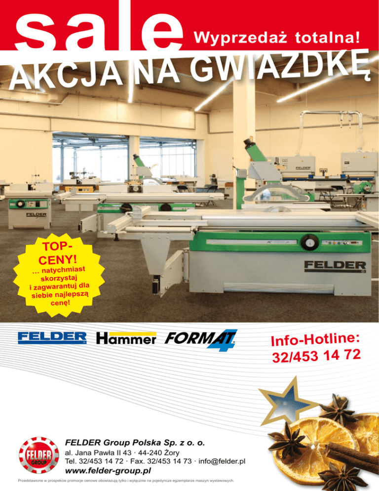 sale Ę K D Z A I W G A AKCJA N Wyprzedaż totalna! TOPCENY! … natychmiast skorzystaj i zagwarantuj dla siebie najlepszą cenę! Info-Hotline: 32/453 14 72 FELDER Group Polska Sp. z o. o. al. Jana Pawła II 43 · 44-240 Żory Tel. 32/453 14 72 · Fax. 32/453 14 73 · [email protected] www.felder-group.pl Przedstawione w prospekcie promocje cenowe obowiazują tylko i wyłącznie na pojedyncze egzemplarze maszyn wystawowych. www.felder.pl Szanowni Klienci, Kiedy w 2003 roku z pomocą firmy macierzystej Felder KG założyłem Felder Group Polska miałem wizję „osiągnąć z firmą Felder przodownictwo na polskim rynku“ i po 8 latach z satysfakcją mogę stwierdzić, że już niewiele dzieli nas od jej urzeczywistnienia. Tysiące sprzedanych maszyn potwierdzają jakość oraz serwis, który oferujemy. Z prawdopodobnie najbogatszą paletą produktów, w myśl motta „wszystko z jednej ręki i od jednego producenta“ oferujemy na rynku polskim dla każdego zakładu rzemieślniczego profesjonalne rozwiązania. Klientom, którzy nie boją się podjęcia samodzielnej działalności gospodarczej, proponujemy idealne koncepty wyposażenia zakładów i wspieramy ich naszym serwisem. Z dziewięciu punktów sprzedaży z salonami wystawowymi gwarantujemy bliskość do klienta. Na koniec roku wymieniamy maszyny w naszych wszystkich salonach wystawowych. Nasza wyprzedaż stanowi dla Państwa okazję zakupu nowej maszyny w bardzo konkurencyjnej cenie. Zainwestujcie Państwo na koniec roku lub zamieńcie „starą“ na nową i skorzystajcie z jednorazowej okazji. Na nadchodzący Nowy Rok 2012 życzę Państwu zdrowia, pomyślności oraz udanych interesów! Dziękuję za okazane nam zaufanie. Damian Bizon prokurent FELDER Group Polska TOP-ceny … na narzędzia i akcesoria wystawowe. Poproś o listę ze wszystkimi artykułami z wyprzedaży! Informacja telefoniczna: 32/453 14 72 Z serwisem włącznie Ceny maszyn z uruchomieniem i transportem. Szkolenie i odbiór maszyny po wykonaniu prób. Logiczne Wszystkie maszyny są dostępne od ręki lub w terminie wybranym przez Państwa z możliwością magazynowania! Fantastycznie! Skorzystajcie Państwo teraz z unikatowej wyprzedaży i szybko się zdecydujcie! Akcja promocyjna obowiązuje do wyczerpania zapasów! Finansowanie • Pytajcie Państwo o nasze możliwości finansowania! • Leasing, wynajem lub kredyt Ważne: • Wszystkie maszyny z wyprzedaży -z wyposażeniem specjalnym • Wszystkie maszyny z wyprzedaży -do indywidualnej optymalizacji! sale Wyprzedaż totalna! 01 Frezarka HAMMER F3 Moc silnika 5,5 KM (4,0 kW), Przełącznik kierunku obrotów, Przechylny agregat frezarki 90°–45°, 4 prędkości obrotowe: 3000/6000/8000/10.000 obr./min, Stół przesuwny do frezowania czopów i widlic 800 mm, Przykładnica frezarki „220” dla narzędzi o max. Ø 220 mm 03 Frezarka FELDER F 500 Professional Moc silnika 5,5 KM (4,0 kW), Przechylny agregat frezarki 90°–45°, 4 prędkości obrotowe: 3000/6000/8000/10.000 obr./min, Przykładnica frezarki „240” dla narzędzi o max. Ø 230 mm, System MULTI – precyzyjnego ustawiania przykładnicy frezarki 04 Frezarka FELDER F 700 Z Moc silnika 7,5 KM (5,5 kW), Przełącznik kierunku obrotów, 4 prędkości obrotowe: 3500/6500/8000/10.000 obr./min, Przechylny agregat frezarki 90°–45°, Pokrętło ręczne ze wskaźnikiem zegarowym dla przechyłu wrzeciona, System szybkiej zamiany wrzeciona, Przykładnica frezarki „240” dla narzędzi o maks. Ø 230 mm, System MULTI – precyzyjnego ustawiania przykładnicy frezarki, Stół przesuwny do frezowania czopów i widlic 1000 mm Cena katalogowa 13 110,00 zł netto Cena specjalna 00 zł netto 9 750, Państwo oszczędzają 00 3 360, zł netto Cena katalogowa 13 816,00 zł netto Cena specjalna na zapytanie u doradcy Cena katalogowa 22 550,00 zł netto Cena specjalna 00 zł netto 16 990, Państwo oszczędzają 00 5 560, zł netto Frezarki - w ekstremalnie dobrych cenach! 08 Frezarka FELDER F 900 Moc silnika 10 KM (7,5 kW), Przełącznik kierunku obrotów, 5 prędkości obrotowych: 3600/4500/6000/8000/10.000 obr./min, Przechylny agregat frezarki 90°–45°, Elektryczna regulacja wysokości wrzeciona z wyświetlaczem LED, Pokrętło ręczne ze wskaźnikiem zegarowym dla przechyłu wrzeciona, System szybkiej zamiany wrzeciona, Przykładnica frezarki „240” dla narzędzi o max. Ø 230 mm, System MULTI – precyzyjnego ustawiania przykładnicy frezarki, Stół przesuwny do frezowania czopów i widlic 1300 mm 10 Frezarka FORMAT-4 profil 45 Moc silnika 7,5 KM (5,5 kW), Przełącznik kierunku obrotów, Przechylny agregat frezarki 90°–45°, 5 prędkości obrotowych: 3500/4500/6500/8000/10.000 obr./min, Elektryczna regulacja wysokości i przechyłu wrzeciona z wyświetlaczami LED, System szybkiej zamiany wrzeciona, Przykładnica frezarki „250” dla narzędzi o maks. Ø 250 mm, System MULTI – precyzyjnego ustawiania przykładnicy frezarki, Stół przesuwny do frezowania czopów i widlic 1300 mm Cena specjalna 00 16 990, zł netto MER F3 rezarka HAM 01 F 04 Frezarka FELDER F 700 Z Przedstawione w prospekcie promocje cenowe obowiazują tylko i wyłącznie na pojedyncze egzemplarze maszyn wystawowych. Cena katalogowa 31 274,00 zł netto Cena specjalna 00 zł netto 25 990, Państwo oszczędzają 00 5 284, zł netto Cena katalogowa 40 536,00 zł netto Cena specjalna na zapytanie u doradcy -4 profil 45 10 Frezarka FORMAT InfoHotline: 32/453 14 72 Wyprzedaż na koniec roku 2011 Żory l Jasionka l Kiełpino l Ostrów Maz. l Września l Drawsko Pomorskie l Legnica l Piotrków Trybunalski l Lublin 01 Pilarka tarczowa HAMMER K3 winner Średnica tarczy piły 250–315 mm, Wysokość cięcia 104 mm, Moc silnika 4,0 KM (3,0 kW), Stół formatowy 1250 mm, Szerokość cięcia równoległego 800 mm z pełnym stołem, Przykładnica do skosów 900 mm 02 Pilarka formatowa HAMMER K3 winner comfort Średnica tarczy piły 250–315 mm, Wysokość cięcia 104 mm, Moc silnika 4 KM (3,