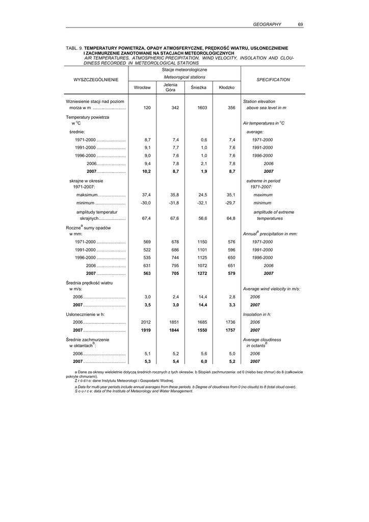GEOGRAPHY 69 TABL. 9. TEMPERATURY POWIETRZA, OPADY ATMOSFERYCZNE, PRĘDKOŚĆ WIATRU, USŁONECZNIENIE I ZACHMURZENIE ZANOTOWANE NA STACJACH METEOROLOGICZNYCH AIR TEMPERATURES, ATMOSPHERIC PRECIPITATION, WIND VELOCITY, INSOLATION AND CLOUDINESS RECORDED IN METEOROLOGICAL STATIONS Stacje meteorologiczne Meteorogical stations WYSZCZEGÓLNIENIE Wrocław Wzniesienie stacji nad poziom morza w m ........................... 120 Jelenia Góra 342 SPECIFICATION Śnieżka Kłodzko 1603 356 Temperatury powietrza w oC Station elevation above sea level in m Air temperatures in oC średnie: average: 1971-2000 ........................ 8,7 7,4 0,6 7,4 1971-2000 1991-2000 ........................ 9,1 7,7 1,0 7,6 1991-2000 1996-2000 ........................ 9,0 7,6 1,0 7,6 1996-2000 2006........................ 9,4 7,8 2,1 7,8 2006 2007........................ 10,2 8,7 1,9 8,7 2007 skrajne w okresie 1971-2007: extreme in period 1971-2007: maksimum....................... 37,4 35,8 24,5 35,1 maximum minimum ......................... -30,0 -31,8 -32,1 -29,7 minimum amplitudy temperatur skrajnych ...................... 67,4 67,6 56,6 64,8 amplitude of extreme temperatures a Roczne sumy opadów w mm: a Annual precipitation in mm: 1971-2000 ........................ 569 678 1150 576 1971-2000 1991-2000 ........................ 522 686 1101 596 1991-2000 1996-2000 ........................ 535 744 1125 650 1996-2000 2006 ........................ 631 795 1072 651 2006 2007 ........................ 563 705 1272 579 2007 2006 ................................... 3,0 2,4 14,4 2,8 2006 2007 ................................... 3,5 3,0 14,4 3,3 2007 2006 ................................... 2012 1851 1685 1736 2006 2007 ................................... 1919 1844 1550 1757 2007 Średnia prędkość wiatru w m/s: Average wind vielocity in m/s: Usłonecznienie w h: Insolation in h: Średnie zachmurzenie b w oktantach : Average cloudiness b in octants 2006 ................................... 5,1 5,2 5,6 5,0 2006 2007 ................................... 5,3 5,4 6,0 5,2 2007 a Dane za okresy wieloletnie dotyczą średnich rocznych z tych okresów. b Stopień zachmurzenia: od 0 (niebo bez chmur) do 8 (całkowicie pokryte chmurami). Ź r ó d ł o: dane Instytutu Meteorologii i Gospodarki Wodnej. a Data for multi-year periods include annual averages from these periods. b Degree of cloudiness from 0 (no clouds) to 8 (total cloud cover). S o u r c e: data of the Institute of Meteorology and Water Management.