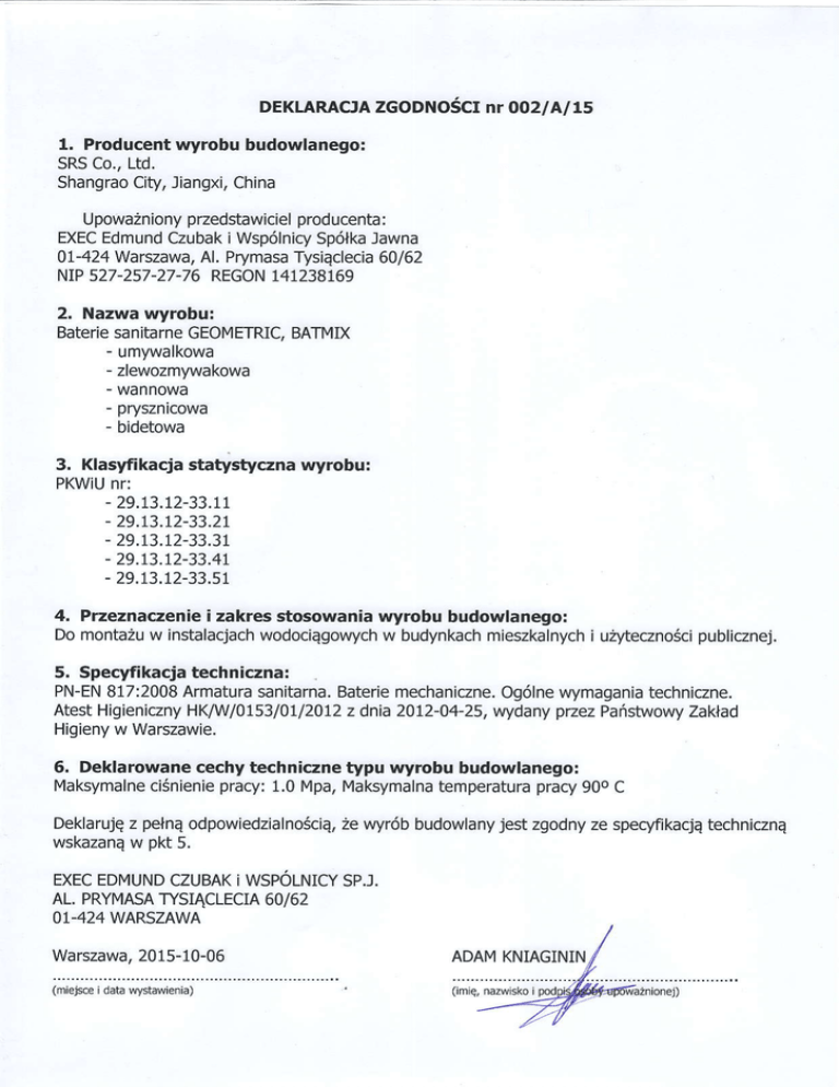 DEKLARACJA ZGODNOSCI nr OO2lA/15 L Producentwyrobu budowlanego: SRSCo.,Ltd. Shangrao City,Jiangxi, China przedstawiciel LJpowa2niony producenta: EXEC Edmund Czubak iWsp6lnicy Jawna Sp6lka 0L-424Watszawa, Al.Prymasa Tysiqclecia 60/62 NtP527-257-27-76REGON 141238169 2. Nazwawyrobu! Bateriesanitarne GEOMETRIC, BATI\4IX - umywatKowa - zlewozmvwaKowa - wannowa - orvsznrcowa - bidetowa 3, Klasyfikacja statystycznawyrobul PKWIU nr: - 29.13.12-33.17 - 29.r3.t2-33.2r - 29.13.12-33.31 - 29.1,3.72-33.4t - 29.13.12-33.51 4. Przeznaczenie i zakresstosowaniawyrobu budowlanego: Domonta2u w instalacjach publicznej. wodociEgowych w budynkach mieszkalnych i uzytecznoSci 5, Specyfikacjatechniczna: PN-EN 817:2008 Armatura sanitarna. Baterie mechaniczne. 096lnewymagania techniczne. AtestHigieniczny HKIW1075310L12072 przez z dnia2012-04-25, Pafstwowy Zaklad Wdany Higienyw Warszawie. 6. Deklarowanecechytechnicznetypu wyrobu budowlanego: pracy:1.0Mpa,Maksymalna l4aKymalne pracy900C ci6nienie temperatura jestzgodnyzespecyfikacjA Deklarujq z pelnqodpowiedzialnosciq, 2ewyr6bbudowlany technicznA pkt wskazanq w 5. EXEC EDN4UND CZUBAK i WSPOLNICY SP.J. AL.PRYIVIASA TYSIACLECIA 60/62 O1-424 WARSZAWA Warszawa, 2015-10-06 (miejsce I datalvystawrenra)