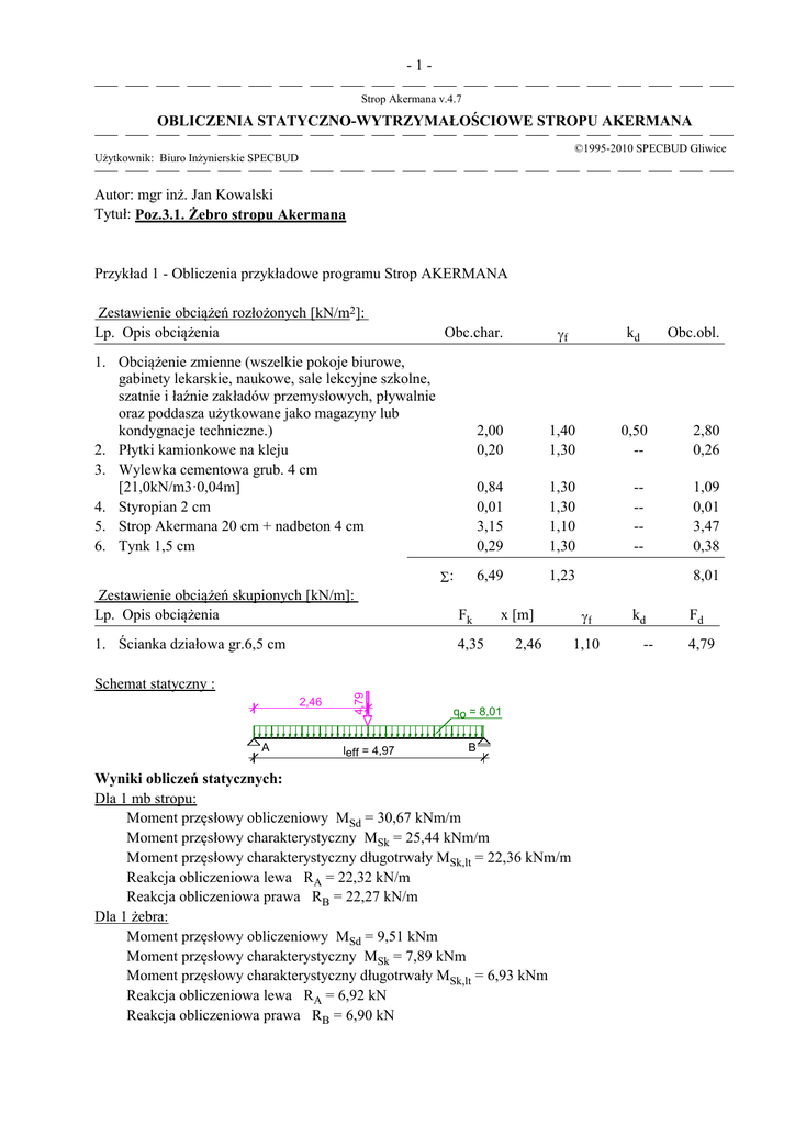 -1Strop Akermana v.4.7 OBLICZENIA STATYCZNO-WYTRZYMAŁOŚCIOWE STROPU AKERMANA ©1995-2010 SPECBUD Gliwice Użytkownik: Biuro Inżynierskie SPECBUD Autor: mgr inż. Jan Kowalski Tytuł: Poz.3.1. Żebro stropu Akermana Przykład 1 - Obliczenia przykładowe programu Strop AKERMANA Zestawienie obciążeń rozłożonych [kN/m2]: Lp. Opis obciążenia γf kd 2,00 0,20 1,40 1,30 0,50 -- 2,80 0,26 0,84 0,01 3,15 0,29 1,30 1,30 1,10 1,30 ----- 1,09 0,01 3,47 0,38 6,49 1,23 Obc.char. 1. Obciążenie zmienne (wszelkie pokoje biurowe, gabinety lekarskie, naukowe, sale lekcyjne szkolne, szatnie i łaźnie zakładów przemysłowych, pływalnie oraz poddasza użytkowane jako magazyny lub kondygnacje techniczne.) 2. Płytki kamionkowe na kleju 3. Wylewka cementowa grub. 4 cm [21,0kN/m3·0,04m] 4. Styropian 2 cm 5. Strop Akermana 20 cm + nadbeton 4 cm 6. Tynk 1,5 cm Σ: Zestawienie obciążeń skupionych [kN/m]: Lp. Opis obciążenia Fk 1. Ścianka działowa gr.6,5 cm 4,35 x [m] 2,46 2,46 A 4,79 Schemat statyczny : leff = 4,97 qo = 8,01 B Wyniki obliczeń statycznych: Dla 1 mb stropu: Moment przęsłowy obliczeniowy MSd = 30,67 kNm/m Moment przęsłowy charakterystyczny MSk = 25,44 kNm/m Moment przęsłowy charakterystyczny długotrwały MSk,lt = 22,36 kNm/m Reakcja obliczeniowa lewa RA = 22,32 kN/m Reakcja obliczeniowa prawa RB = 22,27 kN/m Dla 1 żebra: Moment przęsłowy obliczeniowy MSd = 9,51 kNm Moment przęsłowy charakterystyczny MSk = 7,89 kNm Moment przęsłowy charakterystyczny długotrwały MSk,lt = 6,93 kNm Reakcja obliczeniowa lewa RA = 6,92 kN Reakcja obliczeniowa prawa RB = 6,90 kN Obc.obl. 8,01 γf 1,10 kd -- Fd 4,79 -2Dane materiałowe : Strop Akermana: pustaki 20 cm, nadbeton grubości 4,0 cm Klasa betonu B25 (C20/25) → fcd = 13,33 MPa, fctd = 1,00 MPa, Ecm = 30,0 GPa Ciężar objętościowy betonu ρ = 24 kN/m3 Wilgotność środowiska RH = 80% Wiek betonu w chwili obciążenia 28 dni Współczynnik pełzania (obliczono) φ = 2,12 Stal zbrojeniowa główna A-III (34GS) → fyk = 410 MPa, fyd = 350 MPa, ftk = 500 MPa Stal zbrojeniowa strzemion A-0 (St0S-b) → fyk = 220 MPa, fyd = 190 MPa, ftk = 260 MPa Otulenie zbrojenia cnom = 20 mm Założenia obliczeniowe : Sytuacja obliczeniowa: Graniczna szerokość rys Graniczne ugięcie trwała wlim = 0,3 mm alim = leff/200 - jak dla stropów (tablica 8) Wymiarowanie wg PN-B-03264:2002 : Przęsło: Zginanie: (metoda uproszczona) Zbrojenie potrzebne As = 1,50 cm2. Przyjęto 1φ16 co 31 cm o As = 2,01 cm2 (ρ = 0,89%) Warunek nośności na zginanie: MSd = 9,51 kNm < MRd = 12,56 kNm (75,7%) Ścinanie: Zbrojenie konstrukcyjne strzemionami φ5 co max. 140 mm na całej długości stropu Warunek nośności na ścinanie: VSd = 6,92 kN < VRd1 = 12,22 kN (56,6%) SGU: Szerokość rys prostopadłych: wk = 0,172 mm < wlim = 0,3 mm (57,2%) Maksymalne ugięcie od MSk: a(MSk) = 21,98 mm < alim = 24,85 mm (88,5%) Szkic zbrojenia: - zbrojenie główne: 94 19 1φ16 co 62 cm l = 632 cm 519 1φ16 co 62 cm l = 632 cm 519 94 19 - rozmieszczenie strzemion: 24 35 x 13,5 = 473 473 523 koniec wydruku
