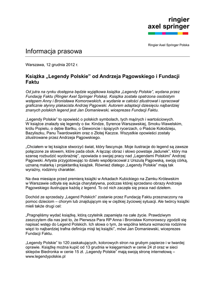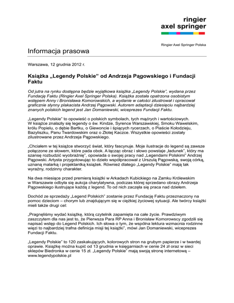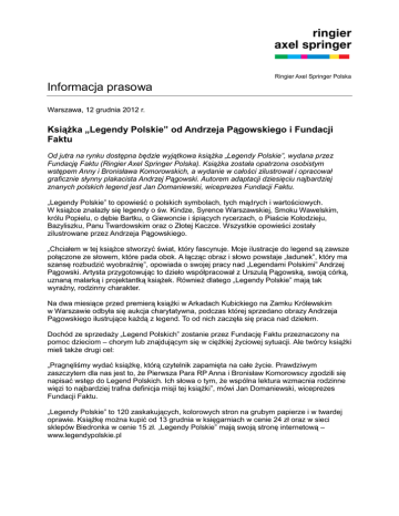 Ringier Axel Springer Polska Informacja prasowa Warszawa, 12 grudnia 2012 r. Książka „Legendy Polskie” od Andrzeja Pągowskiego i Fundacji Faktu Od jutra na rynku dostępna będzie wyjątkowa książka „Legendy Polskie”, wydana przez Fundację Faktu (Ringier Axel Springer Polska). Książka została opatrzona osobistym wstępem Anny i Bronisława Komorowskich, a wydanie w całości zilustrował i opracował graficznie słynny plakacista Andrzej Pągowski. Autorem adaptacji dziesięciu najbardziej znanych polskich legend jest Jan Domaniewski, wiceprezes Fundacji Faktu. „Legendy Polskie” to opowieść o polskich symbolach, tych mądrych i wartościowych. W książce znalazły się legendy o św. Kindze, Syrence Warszawskiej, Smoku Wawelskim, królu Popielu, o dębie Bartku, o Giewoncie i śpiących rycerzach, o Piaście Kołodzieju, Bazyliszku, Panu Twardowskim oraz o Złotej Kaczce. Wszystkie opowieści zostały zilustrowane przez Andrzeja Pągowskiego. „Chciałem w tej książce stworzyć świat, który fascynuje. Moje ilustracje do legend są zawsze połączone ze słowem, które pada obok. A łącząc obraz i słowo powstaje „ładunek”, który ma szansę rozbudzić wyobraźnię”, opowiada o swojej pracy nad „Legendami Polskimi” Andrzej Pągowski. Artysta przygotowując to dzieło współpracował z Urszulą Pągowską, swoją córką, uznaną malarką i projektantką książek. Również dlatego „Legendy Polskie” mają tak wyraźny, rodzinny charakter. Na dwa miesiące przed premierą książki w Arkadach Kubickiego na Zamku Królewskim w Warszawie odbyła się aukcja charytatywna, podczas której sprzedano obrazy Andrzeja Pągowskiego ilustrujące każdą z legend. To od nich zaczęła się praca nad dziełem. Dochód ze sprzedaży „Legend Polskich” zostanie przez Fundację Faktu przeznaczony na pomoc dzieciom – chorym lub znajdującym się w ciężkiej życiowej sytuacji. Ale twórcy książki mieli także drugi cel: „Pragnęliśmy wydać książkę, którą czytelnik zapamięta na całe życie. Prawdziwym zaszczytem dla nas jest to, że Pierwsza Para RP Anna i Bronisław Komorowscy zgodzili się napisać wstęp do Legend Polskich. Ich słowa o tym, że wspólna lektura wzmacnia rodzinne więzi to najbardziej trafna definicja misji tej książki”, mówi Jan Domaniewski, wiceprezes Fundacji Faktu. „Legendy Polskie” to 120 zaskakujących, kolorowych stron na grubym papierze i w twardej oprawie. Książkę można kupić od 13 grudnia w księgarniach w cenie 24 zł oraz w sieci sklepów Biedronka w cenie 15 zł. „Legendy Polskie” mają swoją stronę internetową – www.legendypolskie.pl Kontakt: Anna Gancarz-Luboń rzecznik prasowy Tel. +48 22 232 14 03 Kom. +48 500 121 967 [email protected] *** Ringier Axel Springer Polska istnieje na rynku od 1994 roku. Od 2010 roku firma jest częścią międzynarodowej spółki medialnej Ringier Axel Springer Media AG, która działa również w Czechach, na Słowacji i w Serbii. Portfolio wydawcy obejmuje FAKT, największą pod względem sprzedaży gazetę w Polsce, dwa dzienniki sportowe – ogólnopolski Przegląd Sportowy i regionalny Sport, a także tygodnik Newsweek Polska, miesięcznik biznesowy Forbes, czasopisma komputerowe (m.in. Komputer Świat) i motoryzacyjne (m.in. Auto Świat, Top Gear). Spółka posiada również ponad 20 serwisów internetowych, a wśród nich portale informacyjne, serwisy sportowe, lifestylowe, motoryzacyjne, komputerowe i e-commerce. Ringier Axel Springer Polska posiada także 49 proc. udziałów w spółce INFOR Biznes, wydawcy Dziennika Gazety Prawnej.