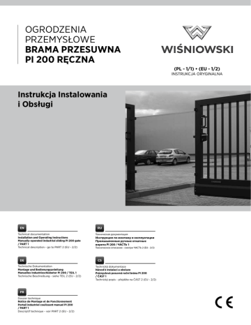 ogrodzenia Przemysłowe Brama przesuwna PI 200 ręczna (PL - 1/1) • (eu - 1/2) Instrukcja oryginalna Instrukcja Instalowania i Obsługi EN Technical documentation Installation and Operating Instructions Manually-operated industrial sliding PI 200 gate / PART 1 Technical description - go to PART 2 (EU - 2/2) de Technische Dokumentation Montage und Bedienungsanleitung Manuelles Industrieschiebetor PI 200 / TEIL 1 Technische Beschreibung - siehe TEIL 2 (EU - 2/2) fr Dossier technique Notice de Montage et de Fonctionnement Portail industriel coulissant manuel PI 200 / PART 1 Descriptif technique - voir Part 2 (EU - 2/2) ru Техническая документация Инструкция по монтажу и эксплуатации Промышленные ручные откатные ворота PI 200 / ЧАСТЬ 1 Техническое описание - смотри ЧАСТЬ 2 (EU - 2/2) CS Technická dokumentace Návod k instalaci a obsluze Průmyslová posuvná ruční brána PI 200 / ČÁST 1 Technický popis - přejděte na ČÁST 2 (EU - 2/2) pl Instrukcja Instalowania i Obsługi – Brama ogrodzeniowa przemysłowa PI 200 ręczna SPIS TREŚCI: 1. Informacje ogólne ........................................................................................... 2 2. Terminy i definicje wg normy .......................................................................... 2 3. Objaśnienia symboli ....................................................................................... 2 4. Opis konstrukcji i dane techniczne ................................................................. 3 4.1. Zastosowanie i przeznaczenie ............................................................. 3 5. Zalecenia montażowe .................................................................................... 3 6. Wymagane warunki montażu ....................................................................... 3 7. Warunki stosowania i zasady bezpieczeństwa ........................................... 3 8. Instrukcja instalowania ................................................................................... 3 8.1. Prace przygotowawcze ........................................................................ 3 8.2. Kontrola wstępna ................................................................................... 3 8.3. Montaż ................................................................................................... 3 8.4. Malowanie ............................................................................................. 3 8.5. Kolejność instalacji ................................................................................ 3 8.6. Obsługa ................................................................................................. 4 8.7. Regulacja bramy .................................................................................... 4 8.8. Kontrola bramy ...................................................................................... 4 9. Ochrona środowiska ...................................................................................... 4 10. Demontaż bramy ............................................................................................ 4 11. Instrukcja obsługi bramy ................................................................................. 4 11.1. Użytkowanie bramy ............................................................................... 4 12. Instrukcja bieżących konserwacji .................................................................. 4 Fundamentowanie bramy PI 200 .......................................................................... 6 Zbrojenie fundamentów ......................................................................................... 6 [A000001] 1. INFORMACJE OGÓLNE Montażu oraz regulacji bramy może dokonać co najmniej osoba KOMPETENTNA. [A000018] Niniejsza Instrukcja Instalowania jest dokumentacją przeznaczoną dla Profesjonalnych Instalatorów lub Osób Kompetentnych. Zawiera ona niezbędne informacje gwarantujące bezpieczne instalowanie bramy. Montaż i instalację przeprowadzić zgodnie z wymaganiami EN 13241-1. Bramę i jej oddzielne elementy składowe instalować zgodnie z Instrukcją Instalowania dostarczoną przez ”WIŚNIOWSKI” Sp. z o.o. S.K.A. Do instalowania bramy stosować tylko oryginalne elementy mocujące dostarczone wraz z bramą oraz elementy złączne (np. śruby, nakrętki, podkładki) zgodne z EN. Przed przystąpieniem do prac montażowych zapoznać się z całą instrukcją. Proszę przeczytać uważnie niniejszą instrukcję i stosować się do jej zaleceń. Prawidłowe działanie bramy jest uzależnione w znacznym stopniu od poprawnego jej zainstalowania. Instrukcja obejmuje montaż bramy z wyposażeniem standardowym oraz elementami dodatkowego wyposażenia. Zakres wyposażenia standardowego i opcjonalnego opisany jest w ofercie handlowej. [A000031] Opakowanie stosowane do elementów systemów ogrodzeniowych przeznaczone jest wyłącznie do zabezpieczenia podczas transportu. Nie przechowywać zapakowanych wyrobów na zewnątrz narażonych na niekorzystne oddziaływanie warunków atmosferycznych. Składowanie na zewnątrz, szczególnie w miejscach nasłonecznionych prowadzi do obniżenia walorów estetycznych powłoki malarskiej - ponieważ folia zabezpieczająca miejscowo skleja się z ogrodzeniem (wulkanizuje). Wyroby przechowywać na utwardzonej, niezapylonej suchej powierzchni płaskiej, nie zmieniającej swoich właściwości pod wpływem czynników zewnętrznych, w pomieszczeniach zamkniętych suchych i przewiewnych, w miejscu gdzie nie będą one narażone na działanie wszelkich innych czynników zewnętrznych, mogących powodować pogorszenie stanu przechowywanych elementów ogrodzeń posesyjnych i przemysłowych, podzespołów oraz opakowań. Niedopuszczalne jest magazynowanie i przechowywanie w pomieszczeniach zawilgoconych, zawierających opary szkodl