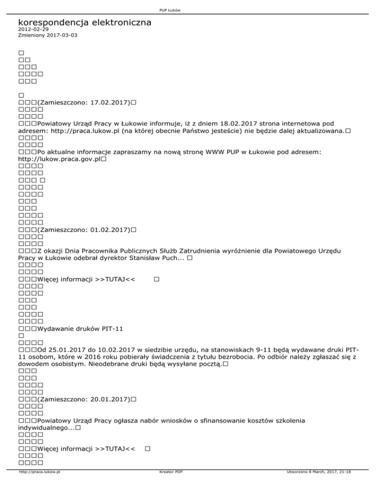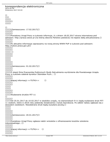PUP Łuków korespondencja elektroniczna 2012-02-29 Zmieniony 2017-03-03 (Zamieszczono: 17.02.2017) Powiatowy Urząd Pracy w Łukowie informuje, iż z dniem 18.02.2017 strona internetowa pod adresem: http://praca.lukow.pl (na której obecnie Państwo jesteście) nie będzie dalej aktualizowana. Po aktualne informacje zapraszamy na nową stronę WWW PUP w Łukowie pod adresem: http://lukow.praca.gov.pl (Zamieszczono: 01.02.2017) Z okazji Dnia Pracownika Publicznych Służb Zatrudnienia wyróżnienie dla Powiatowego Urzędu Pracy w Łukowie odebrał dyrektor Stanisław Puch... Więcej informacji >>TUTAJ<< Wydawanie druków PIT-11 Od 25.01.2017 do 10.02.2017 w siedzibie urzędu, na stanowiskach 9-11 będą wydawane druki PIT11 osobom, które w 2016 roku pobierały świadczenia z tytułu bezrobocia. Po odbiór należy zgłaszać się z dowodem osobistym. Nieodebrane druki będą wysyłane pocztą. (Zamieszczono: 20.01.2017) Powiatowy Urząd Pracy ogłasza nabór wniosków o sfinansowanie kosztów szkolenia indywidualnego... Więcej informacji >>TUTAJ<< http://praca.lukow.pl Kreator PDF Utworzono 8 March, 2017, 21:18 PUP Łuków (Zamieszczono: 20.01.2017) Powiatowy Urząd Pracy w Łukowie informuje, iż ogłasza nabór wniosków na bony szkoleniowe... Więcej informacji >>TUTAJ<< (Zamieszczono: 19.01.2017) Powiatowy Urząd Pracy w Łukowie ogłasza nabór ciągły wniosków na dofinansowanie wynagrodzenia za zatrudnienie skierowanego bezrobotnego, który ukończył 50 rok życia... Więcej informacji >>TUTAJ<< Zachęcamy do rejestrowania się w urzędzie pracy drogą elektroniczną lub składania elektronicznie wniosku o rejestrację. Jeżeli dysponujesz: - podpisem elektronicznym weryfikowanym za pomocą ważnego kwalifikowanego certyfikatu lub - profilem zaufanym elektronicznej platformy usług administracji publicznej (ePUAP) możesz samodzielnie zarejestrować się jako bezrobotny lub poszukujący pracy nie przychodząc do urzędu. Elektronicznej rejestracji dokonuje się na portalu www.praca.gov.pl Jeżeli nie dysponujesz żadną formą podpisu elektronicznego możesz złożyć elektronicznie wniosek o zarejestrowanie w powiatowym urzędzie pracy korzystając z portalu www.praca.gov.pl Wizyta w urzędzie pracy jest wówczas konieczna, ale dzięki samodzielnemu wprowadzeniu wymaganych danych skracasz maksymalnie czas wizyty w urzędzie. http://praca.lukow.pl Kreator PDF Utworzono 8 March, 2017, 21:18 PUP Łuków Ważna Informacja! Po dokonaniu elektronicznej rejestracji należy obowiązkowo zapoznać się z informacją wysłaną na podany przy rejestacji adres e-mail. Szczegółowe informacje znajdują się w zakładce „Rejestracja" Uwaga !!! Uprzejmie informujemy, że Powiatowy Urząd Pracy w Łukowie udziela odpowiedzi na korespondencję otrzymywaną pocztą elektroniczną, odpowiadającą wymogom określonym w art. 63 § 2 ustawy z dnia 14 czerwca 1960r. kodeks postępowania administracyjnego (tj. Dz. U. z 2013r. poz. 267 ze zm.), którego treść jest następująca: „Podanie powinno zawierać co najmniej wskazanie osoby, od której pochodzi, jej adres i żądanie oraz czynić zadość innym wymaganiom ustalonym w przepisach szczególnych.” W związku z powyższym treść kierowanej korespondencji powinna zawierać co najmniej wskazanie: - osoby (imienia i nazwiska) od której pochodzą, - adresu (kodu pocztowego, miejscowości, ulicy i nr domu), - przedmiotu sprawy, której dotyczy. http://praca.lukow.pl Kreator PDF Utworzono 8 March, 2017, 21:18