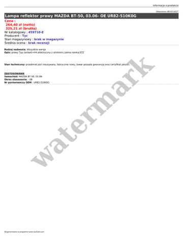 Informacje o produkcie Utworzono 08-03-2017 Lampa reflektor prawy MAZDA BT-50, 03.06- OE UR82-510K0G Cena : 264,40 zł (netto) 325,21 zł (brutto) Nr katalogowy : 459710-E Producent : Tyc Stan magazynowy : brak w magazynie Średnia ocena : brak recenzji Rodzaj nadwozia: Wszystkie wersje Opis: prawy Typ żarówki=H4,elektryczny z silnikiem,czarna ramka,ECE w at ZASTOSOWANIE Samochód: MAZDA BT-50, 03.06Okres stosowania: -.08 Nr porównawczy OEM: UR82-510K0G er m ar k Stan techniczny: przedmiot jest nieużywany, fabrycznie nowy, towar posiada gwarancję oraz certyfikat jakości. Wygenerowano w programie www.oscGold.com