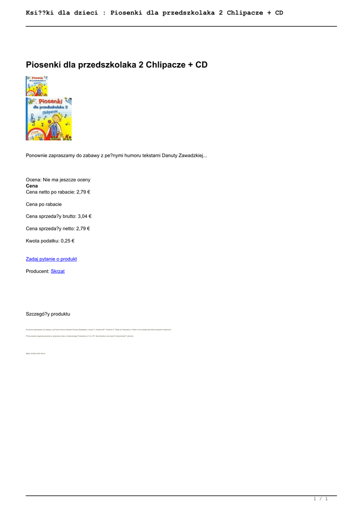 Ksi??ki dla dzieci : Piosenki dla przedszkolaka 2 Chlipacze + CD Piosenki dla przedszkolaka 2 Chlipacze + CD Ponownie zapraszamy do zabawy z pe?nymi humoru tekstami Danuty Zawadzkiej... Ocena: Nie ma jeszcze oceny Cena Cena netto po rabacie: 2,79 € Cena po rabacie Cena sprzeda?y brutto: 3,04 € Cena sprzeda?y netto: 2,79 € Kwota podatku: 0,25 € Zadaj pytanie o produkt Producent: Skrzat Szczegó?y produktu Ponownie zapraszamy do zabawy z pe?nymi humoru tekstami Danuty Zawadzkiej i muzyk? s. Adriany Mi?. Piosenki s? ?atwe do ?piewania, a ?wiat w nich opisany jest bliski wszystkim maluchom. P?yta zawiera nagrania piosenek w wykonaniu dzieci z krakowskiego Przedzkola nr 3 im. B?. Ojca Gwidona oraz wersj? instrumentaln? utworów. ISBN: 978-83-7437-507-8 1 / 1 Powered by TCPDF (www.tcpdf.org)