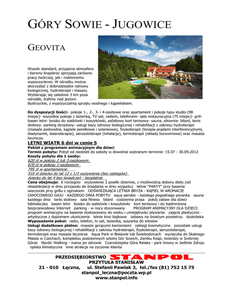 GÓRY SOWIE - JUGOWICE GEOVITA Wysoki standard, przyjazna atmosfera i barwny krajobraz sprzyjają zarówno pracy twórczej, jak i rodzinnemu wypoczynkowi. W ośrodku można skorzystać z dobrodziejstw odnowy biologicznej, hydroterapii i masaży. Wybierając się zaledwie 3 km poza ośrodek, trafimy nad jezioro Bystrzyckie, z wypożyczalnią sprzętu wodnego i kąpieliskiem. Do dyspozycji Gości:- pokoje 1-, 2-, 3- i 4-osobowe oraz apartament i pokoje typu studio (98 miejsc)- wszystkie pokoje z łazienką, TV sat, radiem, telefonem- sala restauracyjna (75 miejsc)- grillbasen letni- boisko do siatkówki i koszykówki, asfaltowy kort tenisowy- sauna, siłownia- bilard, tenis stołowy- parking strzeżony- usługi bazy odnowy biologicznej i rehabilitacji z zakresu hydroterapii (masaże podwodne, kąpiele perełkowe i solankowe), fizykoterapii (terapia prądami interferencyjnymi, diadynamik, laseroterapia), aerozoloterapii (inhalacje), termoterapii (okłady borowinowe) oraz masaże lecznicze. LETNI WIATR 6 dni w cenie 5 Pakiet z programem animacyjnym dla dzieci Termin pobytu: Pobyt od niedzieli do soboty w dowolnie wybranym terminie: 15.07 - 30.09.2012 Koszty pobytu dla 1 osoby: 620 zł w pokoju 2 lub 3-osobowym 670 zł w pokoju 1-osobowym 795 zł w apartamencie 510 zł dziecko do lat 12 z 1/2 wyżywienia (bez zabiegów) dziecko do lat 4 bez świadczeń - bezpłatnie Cena obejmuje: 6 noclegów wyżywienie 2 posiłki dziennie, z możliwością doboru diety (od obiadokolacji w dniu przyjazdu do śniadania w dniu wyjazdu) letnie "PARTY" przy basenie wieczorek przy grillu z ogniskiem ODŚWIEŻAJĄCA LETNIA BRYZA - KĄPIEL W AROMACIE OWOCOWEGO GAJU - KAŻDEGO DNIA POBYTU aqua aerobic - każdego pogodnego poranka sauna każdego dnia tenis stołowy sala fitness bilard codzienna prasa pokój zabaw dla dzieci biblioteczka basen letni boisko do siatkówki i koszykówki kort tenisowy i do badmintona bezprzewodowy Internet parking - w nocy dozorowany PROGRAM ANIMACYJNY DLA DZIECI: program animacyjny na basenie dostosowany do wieku i umiejętności pływania zajęcia plastyczno artystyczne z dyplomem ukończenia letnie kino bajkowe zabawy na świeżym powietrzu dyskoteka Wyposażenie pokoi: radio, telefon, tv sat, łazienka, suszarka do włosów Usługi dodatkowo płatne: masaże gorącymi kamieniami zabiegi kosmetyczne pozostałe usługi bazy odnowy biologicznej i rehabilitacji z zakresu hydroterapii, fizykoterapii, aerozoloterapii, termoterapii oraz masaże lecznicze Aqua Park w Bielawie lub Świebodzicach wycieczka do Skalnego Miasta w Czechach, kompleksu podziemnych sztolni Gór Sowich, Zamku Książ, twierdzy w Srebrnej Górze Nordic Walking - marsz po zdrowie Czarodziejska Góra Relaks - park linowy w Jedlinie Zdroju opłata klimatyczna inne atrakcje na życzenie klienta PRZEDSIĘBIORSTWO PRZYTUŁA STANISŁAW 21 - 010 Łęczna, ul. Stefanii Pawlak 3, tel./fax (81) 752 15 75 [email protected] www.stanpol.info