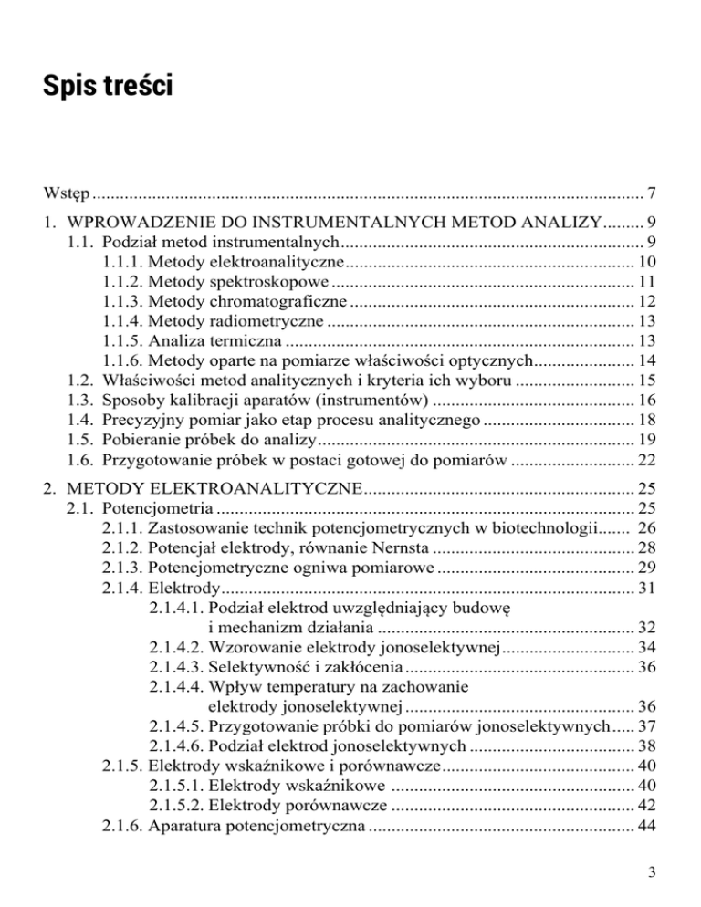 Spis treści Wstęp ........................................................................................................................ 7 1. WPROWADZENIE DO INSTRUMENTALNYCH METOD ANALIZY......... 9 1.1. Podział metod instrumentalnych .................................................................. 9 1.1.1. Metody elektroanalityczne ............................................................... 10 1.1.2. Metody spektroskopowe .................................................................. 11 1.1.3. Metody chromatograficzne .............................................................. 12 1.1.4. Metody radiometryczne ................................................................... 13 1.1.5. Analiza termiczna ............................................................................ 13 1.1.6. Metody oparte na pomiarze właściwości optycznych...................... 14 1.2. Właściwości metod analitycznych i kryteria ich wyboru .......................... 15 1.3. Sposoby kalibracji aparatów (instrumentów) ............................................ 16 1.4. Precyzyjny pomiar jako etap procesu analitycznego ................................. 18 1.5. Pobieranie próbek do analizy ..................................................................... 19 1.6. Przygotowanie próbek w postaci gotowej do pomiarów ........................... 22 2. METODY ELEKTROANALITYCZNE ........................................................... 25 2.1. Potencjometria ........................................................................................... 25 2.1.1. Zastosowanie technik potencjometrycznych w biotechnologii....... 26 2.1.2. Potencjał elektrody, równanie Nernsta ............................................ 28 2.1.3. Potencjometryczne ogniwa pomiarowe ........................................... 29 2.1.4. Elektrody .......................................................................................... 31 2.1.4.1. Podział elektrod uwzględniający budowę i mechanizm działania ........................................................ 32 2.1.4.2. Wzorowanie elektrody jonoselektywnej ............................. 34 2.1.4.3. Selektywność i zakłócenia .................................................. 36 2.1.4.4. Wpływ temperatury na zachowanie elektrody jonoselektywnej .................................................. 36 2.1.4.5. Przygotowanie próbki do pomiarów jonoselektywnych ..... 37 2.1.4.6. Podział elektrod jonoselektywnych .................................... 38 2.1.5. Elektrody wskaźnikowe i porównawcze .......................................... 40 2.1.5.1. Elektrody wskaźnikowe ..................................................... 40 2.1.5.2. Elektrody porównawcze ..................................................... 42 2.1.6. Aparatura potencjometryczna .......................................................... 44 3 Ćwiczenia .......................................................................................................... 46 2.2. Metody konduktometryczne ...................................................................... 65 2.2.1. Podstawy teoretyczne ...................................................................... 65 2.2.2. Ruchliwość jonów............................................................................ 69 2.2.3. Aparatura do pomiaru przewodności elektrolitycznej ..................... 70 2.2.4. Zastosowanie konduktometrii .......................................................... 72 2.2.4.1. Technika pomiarów bezpośrednich .................................... 72 2.2.4.2. Miareczkowanie konduktometryczne ................................. 75 2.2.4.3. Konduktometria bezkontaktowa (bezelektrodowa) ............ 79 Ćwiczenia ......................................................................................................... 79 3. METODY SPEKTROSKOPII CZĄSTECZKOWEJ ....................................... 97 3.1. Terminy stosowane w spektrofotometrii .................................................. 98 3.2. Widma elektronowe. Typy przejść elektronowych.................................... 99 3.3. Chromofory i auksochromy .................................................................... 102 3.4. Prawa absorpcji ....................................................................................... 103 3.5. Odstępstwa od praw absorpcji. Błędy pomiaru ....................................... 104 3.5.1. Czynniki chemiczne ....................................................................... 105 3.5.2. Czynniki aparaturowe .................................................................... 105 3.6. Techniki spektrofotometryczne ............................................................... 106 3.6.1. Metoda krzywej wzorcowej ........................................................... 107 3.6.2. Metoda algebraiczna ...................................................................... 108 3.6.3. Miareczkowanie spektrofotometryczne ......................................... 109 3.6.4. Metoda spektrofotometrii różnicowej ............................................ 110 3.7. Analiza ilościowa. Metody bezpośrednie i pośrednie ............................. 110 3.8. Wykonanie oznaczenia spektrofotometrycznego .................................... 111 3.8.1. Roztwory wzorcowe ..................................................................... 111 3.8.2. Przygotowanie krzywej wzorcowej ............................................... 112 3.8.3. Wykonanie pomiaru ....................................................................... 112 3.9. Nefelometria i turbidymetria ................................................................... 114 3.10.Aparatura, spektrofotometry UV-VIS ..................................................... 115 Ćwiczenia ........................................................................................................ 117 4. SPEKTROMETRIA ATOMOWA .....................................