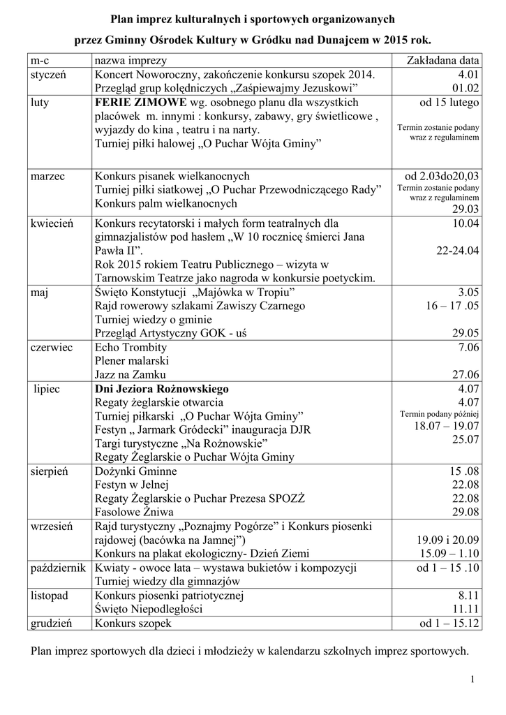 Plan imprez kulturalnych i sportowych organizowanych przez Gminny Ośrodek Kultury w Gródku nad Dunajcem w 2015 rok. m-c styczeń luty marzec nazwa imprezy Koncert Noworoczny, zakończenie konkursu szopek 2014. Przegląd grup kolędniczych „Zaśpiewajmy Jezuskowi” FERIE ZIMOWE wg. osobnego planu dla wszystkich placówek m. innymi : konkursy, zabawy, gry świetlicowe , wyjazdy do kina , teatru i na narty. Turniej piłki halowej „O Puchar Wójta Gminy” Konkurs pisanek wielkanocnych Turniej piłki siatkowej „O Puchar Przewodniczącego Rady” Konkurs palm wielkanocnych Konkurs recytatorski i małych form teatralnych dla gimnazjalistów pod hasłem „W 10 rocznicę śmierci Jana Pawła II”. Rok 2015 rokiem Teatru Publicznego – wizyta w Tarnowskim Teatrze jako nagroda w konkursie poetyckim. maj Święto Konstytucji „Majówka w Tropiu” Rajd rowerowy szlakami Zawiszy Czarnego Turniej wiedzy o gminie Przegląd Artystyczny GOK - uś czerwiec Echo Trombity Plener malarski Jazz na Zamku lipiec Dni Jeziora Rożnowskiego Regaty żeglarskie otwarcia Turniej piłkarski „O Puchar Wójta Gminy” Festyn „ Jarmark Gródecki” inauguracja DJR Targi turystyczne „Na Rożnowskie” Regaty Żeglarskie o Puchar Wójta Gminy sierpień Dożynki Gminne Festyn w Jelnej Regaty Żeglarskie o Puchar Prezesa SPOZŻ Fasolowe Żniwa wrzesień Rajd turystyczny „Poznajmy Pogórze” i Konkurs piosenki rajdowej (bacówka na Jamnej”) Konkurs na plakat ekologiczny- Dzień Ziemi październik Kwiaty - owoce lata – wystawa bukietów i kompozycji Turniej wiedzy dla gimnazjów listopad Konkurs piosenki patriotycznej Święto Niepodległości grudzień Konkurs szopek kwiecień Zakładana data 4.01 01.02 od 15 lutego Termin zostanie podany wraz z regulaminem od 2.03do20,03 Termin zostanie podany wraz z regulaminem 29.03 10.04 22-24.04 3.05 16 – 17 .05 29.05 7.06 27.06 4.07 4.07 Termin podany później 18.07 – 19.07 25.07 15 .08 22.08 22.08 29.08 19.09 i 20.09 15.09 – 1.10 od 1 – 15 .10 8.11 11.11 od 1 – 15.12 Plan imprez sportowych dla dzieci i młodzieży w kalendarzu szkolnych imprez sportowych. 1