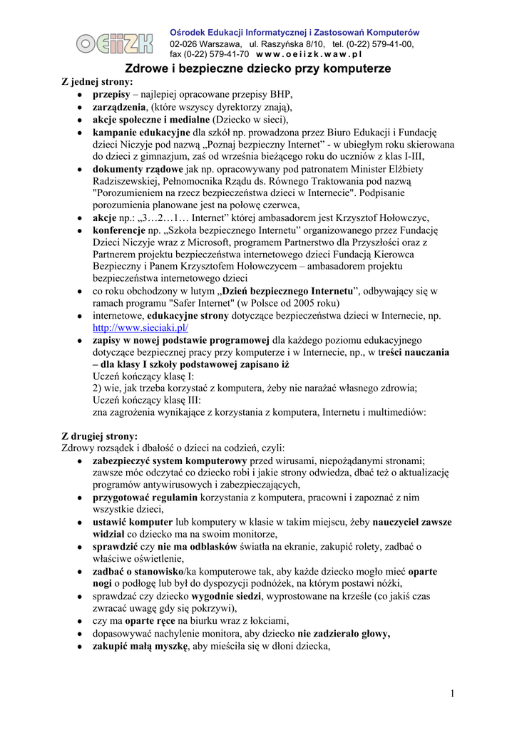 Ośrodek Edukacji Informatycznej i Zastosowań Komputerów 02-026 Warszawa, ul. Raszyńska 8/10, tel. (0-22) 579-41-00, fax (0-22) 579-41-70 w w w . o e i i z k . w a w . p l Zdrowe i bezpieczne dziecko przy komputerze Z jednej strony: przepisy – najlepiej opracowane przepisy BHP, zarządzenia, (które wszyscy dyrektorzy znają), akcje społeczne i medialne (Dziecko w sieci), kampanie edukacyjne dla szkół np. prowadzona przez Biuro Edukacji i Fundację dzieci Niczyje pod nazwą „Poznaj bezpieczny Internet” - w ubiegłym roku skierowana do dzieci z gimnazjum, zaś od września bieżącego roku do uczniów z klas I-III, dokumenty rządowe jak np. opracowywany pod patronatem Minister Elżbiety Radziszewskiej, Pełnomocnika Rządu ds. Równego Traktowania pod nazwą "Porozumieniem na rzecz bezpieczeństwa dzieci w Internecie". Podpisanie porozumienia planowane jest na połowę czerwca, akcje np.: „3…2…1… Internet” której ambasadorem jest Krzysztof Hołowczyc, konferencje np. „Szkoła bezpiecznego Internetu” organizowanego przez Fundację Dzieci Niczyje wraz z Microsoft, programem Partnerstwo dla Przyszłości oraz z Partnerem projektu bezpieczeństwa internetowego dzieci Fundacją Kierowca Bezpieczny i Panem Krzysztofem Hołowczycem – ambasadorem projektu bezpieczeństwa internetowego dzieci co roku obchodzony w lutym „Dzień bezpiecznego Internetu”, odbywający się w ramach programu "Safer Internet" (w Polsce od 2005 roku) internetowe, edukacyjne strony dotyczące bezpieczeństwa dzieci w Internecie, np. http://www.sieciaki.pl/ zapisy w nowej podstawie programowej dla każdego poziomu edukacyjnego dotyczące bezpiecznej pracy przy komputerze i w Internecie, np., w treści nauczania – dla klasy I szkoły podstawowej zapisano iż Uczeń kończący klasę I: 2) wie, jak trzeba korzystać z komputera, żeby nie narażać własnego zdrowia; Uczeń kończący klasę III: zna zagrożenia wynikające z korzystania z komputera, Internetu i multimediów: Z drugiej strony: Zdrowy rozsądek i dbałość o dzieci na codzień, czyli: zabezpieczyć system komputerowy przed wirusami, niepożądanymi stronami; zawsze móc odczytać co dziecko robi i jakie strony odwiedza, dbać też o aktualizację programów antywirusowych i zabezpieczających, przygotować regulamin korzystania z komputera, pracowni i zapoznać z nim wszystkie dzieci, ustawić komputer lub komputery w klasie w takim miejscu, żeby nauczyciel zawsze widział co dziecko ma na swoim monitorze, sprawdzić czy nie ma odblasków światła na ekranie, zakupić rolety, zadbać o właściwe oświetlenie, zadbać o stanowisko/ka komputerowe tak, aby każde dziecko mogło mieć oparte nogi o podłogę lub był do dyspozycji podnóżek, na którym postawi nóżki, sprawdzać czy dziecko wygodnie siedzi, wyprostowane na krześle (co jakiś czas zwracać uwagę gdy się pokrzywi), czy ma oparte ręce na biurku wraz z łokciami, dopasowywać nachylenie monitora, aby dziecko nie zadzierało głowy, zakupić małą myszkę, aby mieściła się w dłoni dziecka, 1 Ośrodek Edukacji Informatycznej i Zastosowań Komputerów 02-026 Warszawa, ul. Raszyńska 8/10, tel. (0-22) 579-41-00, fax (0-22) 579-41-70 w w w . o e i i z k . w a w . p l rozejrzeć się wokół stanowiska komputerowego, czy dziecko zaaferowane tym co robi, niczego nie strąci, nic na nie nie spadnie, o nic nie zahaczy, czy nie kłębią się gdzieś kable, lub wystają niezabezpieczone kontakty, co jakiś czas kazać dziecku pomrugać powiekami i spojrzeć poza ekran. nie zostawiać dziecka pracującego, bawiącego się bez nadzoru opiekuna, nauczyciela, wymuszać na dziecku przewidywany okres pracy/zabawy przy komputerze (im młodsze dziecko tym czas krótszy np. 15 min, nie dłużej niż godzinę lekcyjną dla dziecka w III klasie), koniecznie przeprowadzić lekcje dotyczącą bezpieczeństwa w Internecie i co jakiś czas do tego powracać, życzliwie rozmawiać na wszystkie tematy, które dziecko zainteresują, zaniepokoją lub poruszą, zawsze pamiętać, że dziecko przy komputerze to nie jest dziecko, które ma się na jakiś czas „z głowy”, tylko właśnie na nie się szczególnie zwraca swoją uwagę zawsze pamiętać, że przy komputerze ważne jest dziecko, a nie komputer, który jest tylko narzędziem jego pracy lub zabawy, zawsze sprawdzać (nauczyciele) wszystkie programy zanim da się je dziecku do pracy, zabawy; nawet te z rekomendacjami, czasem maja błędy, nie powtarzać co chwilę przy dziecku, że „ja się na tym niezbyt dobrze znam” i nie traktować komputera jak nie wiadomo jakie bóstwo (takie odruchy mają starsi nauczyciele), ale gdy dziecko coś samodzielnie zauważy i nas nauczy, to okazywać zadowolenie i wytwarzać poczucie, że wszyscy się od wszystkich zawsze czegoś możemy nauczyć. Komputer wraz z Internetem jest zebraną informacją, które ludzie tworzą od wieków i nikt jej nie ogarnie, ale należy z niej właściwie korzystać i to właśnie musi się odbywać pod kierunkiem nauczyciela. 2