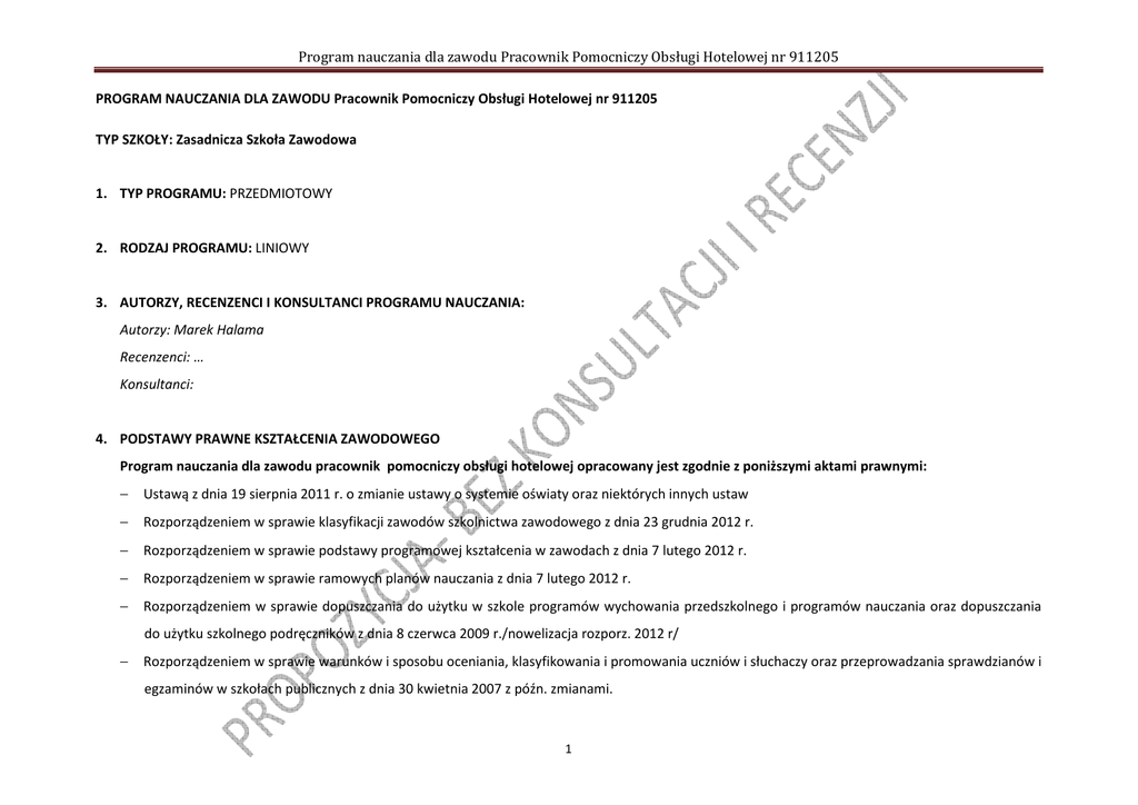 Program nauczania dla zawodu Pracownik Pomocniczy Obsługi Hotelowej nr 911205 PROGRAM NAUCZANIA DLA ZAWODU Pracownik Pomocniczy Obsługi Hotelowej nr 911205 TYP SZKOŁY: Zasadnicza Szkoła Zawodowa 1. TYP PROGRAMU: PRZEDMIOTOWY 2. RODZAJ PROGRAMU: LINIOWY 3. AUTORZY, RECENZENCI I KONSULTANCI PROGRAMU NAUCZANIA: Autorzy: Marek Halama Recenzenci: … Konsultanci: 4. PODSTAWY PRAWNE KSZTAŁCENIA ZAWODOWEGO Program nauczania dla zawodu pracownik pomocniczy obsługi hotelowej opracowany jest zgodnie z poniższymi aktami prawnymi: − Ustawą z dnia 19 sierpnia 2011 r. o zmianie ustawy o systemie oświaty oraz niektórych innych ustaw − Rozporządzeniem w sprawie klasyfikacji zawodów szkolnictwa zawodowego z dnia 23 grudnia 2012 r. − Rozporządzeniem w sprawie podstawy programowej kształcenia w zawodach z dnia 7 lutego 2012 r. − Rozporządzeniem w sprawie ramowych planów nauczania z dnia 7 lutego 2012 r. − Rozporządzeniem w sprawie dopuszczania do użytku w szkole programów wychowania przedszkolnego i programów nauczania oraz dopuszczania do użytku szkolnego podręczników z dnia 8 czerwca 2009 r./nowelizacja rozporz. 2012 r/ − Rozporządzeniem w sprawie warunków i sposobu oceniania, klasyfikowania i promowania uczniów i słuchaczy oraz przeprowadzania sprawdzianów i egzaminów w szkołach publicznych z dnia 30 kwietnia 2007 z późn. zmianami. 1 Program nauczania dla zawodu Pracownik Pomocniczy Obsługi Hotelowej nr 911205 − Rozporządzeniem w sprawie zasad udzielania i organizacji pomocy psychologiczno-pedagogicznej w publicznych przedszkolach, szkołach i placówkach z dnia 17 listopada 2010 r. − Rozporządzeniem w sprawie bezpieczeństwa i higieny w publicznych i niepublicznych szkołach i placówkach z dnia 31 grudnia 2002 r. z późn. zmianami. 5. CELE GŁÓWNE KSZTAŁCENIA ZAWODOWEGO Celem kształcenia zawodowego jest przygotowanie uczących się do życia w warunkach współczesnego świata, wykonywania pracy zawodowej i aktywnego funkcjonowania na zmieniającym się rynku pracy. Zadania szkoły i innych podmiotów prowadzących kształcenie zawodowe oraz sposób ich realizacji są uwarunkowane zmianami zachodzącymi w otoczeniu gospodarczo-społecznym, na które wpływają w szczególności: idea gospodarki opartej na wiedzy, globalizacja procesów gospodarczych i społecznych, rosnący udział handlu międzynarodowego, mobilność geograficzna i zawodowa, nowe techniki i technologie, a także wzrost oczekiwań pracodawców w zakresie poziomu wiedzy i umiejętności pracowników. W procesie kształcenia zawodowego ważne jest integrowanie i korelowanie kształcenia ogólnego i zawodowego, w tym doskonalenie kompetencji kluczowych nabytych w procesie kształcenia ogólnego, z uwzględnieniem niższych etapów edukacyjnych. Odpowiedni poziom wiedzy ogólnej powiązanej z wiedzą zawodową przyczyni się do podniesienia poziomu umiejętności zawodowych absolwentów szkół kształcących w zawodach, a tym samym zapewni im możliwość sprostania wyzwaniom zmieniającego się rynku pracy. W procesie kształcenia zawodowego są podejmowane działania wspomagające rozwój każdego uczącego się, stosownie do jego potrzeb i możliwości, ze szczególnym uwzględnieniem indywidualnych ścieżek edukacji i kariery, możliwości podnoszenia poziomu wykształcenia i kwalifikacji zawodowych oraz zapobiegania przedwczesnemu kończeniu nauki. Elastycznemu reagowaniu systemu kształcenia zawodowego na potrzeby rynku pracy, jego otwartości na uczenie się przez całe życie oraz mobilności edukacyjnej i zawodowej absolwentów ma służyć wyodrębnienie kwalifikacji w ramach poszczególnych zawodów wpisanych do klasyfikacji zawodów szkolnictwa zawodowego. 6. KORELACJA PROGRAMU NAUCZANIA DLA ZAWODU Pracownik Pomocniczy Obsługi Hotelowej 2 Program nauczania dla zawodu Pracownik Pomocniczy Obsługi Hotelowej nr 911205 Program nauczania dla zawodu pracownik pomocniczy obsługi hotelowej uwzględnia aktualny stan wiedzy o zawodzie ze szczególnym zwróceniem uwagi na nowe technologie i najnowsze koncepcje nauczania. Program uwzględnia także zapisy zadań ogólnych szkoły i umiejętności zdobywanych w trakcie kształcenia w szkole ponadgimnazjalnej umieszczonych w podstawach programowych kształcenia ogólnego, w tym: 1) umiejętność zrozumienia, wykorzystania i refleksyjnego przetworzenia tekstów, prowadząca do osiągnięcia własnych celów, rozwoju osobowego oraz aktywnego uczestnictwa w życiu społeczeństwa; 2) umiejętność wykorzystania narzędzi matematyki w życiu codziennym oraz formułowania sądów opartych na rozumowaniu matematycznym; 3) umiejętność wykorzystania wiedzy o charakterze naukowym do identyfikowania i rozwiązywania problemów, a także formułowania wniosków opartych na obserwacjach empirycznych dotyczących przyrody lub społeczeństwa; 4) umiejętność komunikowania się w języku ojczystym i w językach obcych; 5) umiejętność sprawnego posługiwania się nowoczesnymi technologiami informacyjnymi i komunikacyjnymi; 6) umiejętność wyszukiwania, selekcjonowania i krytycznej analizy informacji; 7) umiejętność rozpoznawania własnych potrzeb edukacyjnych oraz uczenia się; 8) umiejętność pracy zespołowej. W programie nauczania dla zawodu sprzedawca uwzględniono powiązania z kształceniem ogólnym polegające na wcześniejszym osiąganiu efektów kształcenia w zakresie przedmiotów ogólnokształcących stanowiących podbudowę dla kształcenia w zawodzie. Dotyczy to przede wszystkim takich przedmiotów jak: matematyka, a także podstawy przedsiębiorczości i edukację dla bezpieczeństwa. 7. INFORMACJA O ZAWODZIE Pracownik Pomocniczy Obsługi Hotelowej Pracownik pomocniczy obsługi hotelowej wykonuje prace pomocnicze związane z utrzymaniem porządku i obsługą gości w obiekcie świadczącym usługi hotelarskie i jego otoczeniu; wykonuje prace pomocnicze w hotelowej części obiektu, w gastronomicznej części obiek