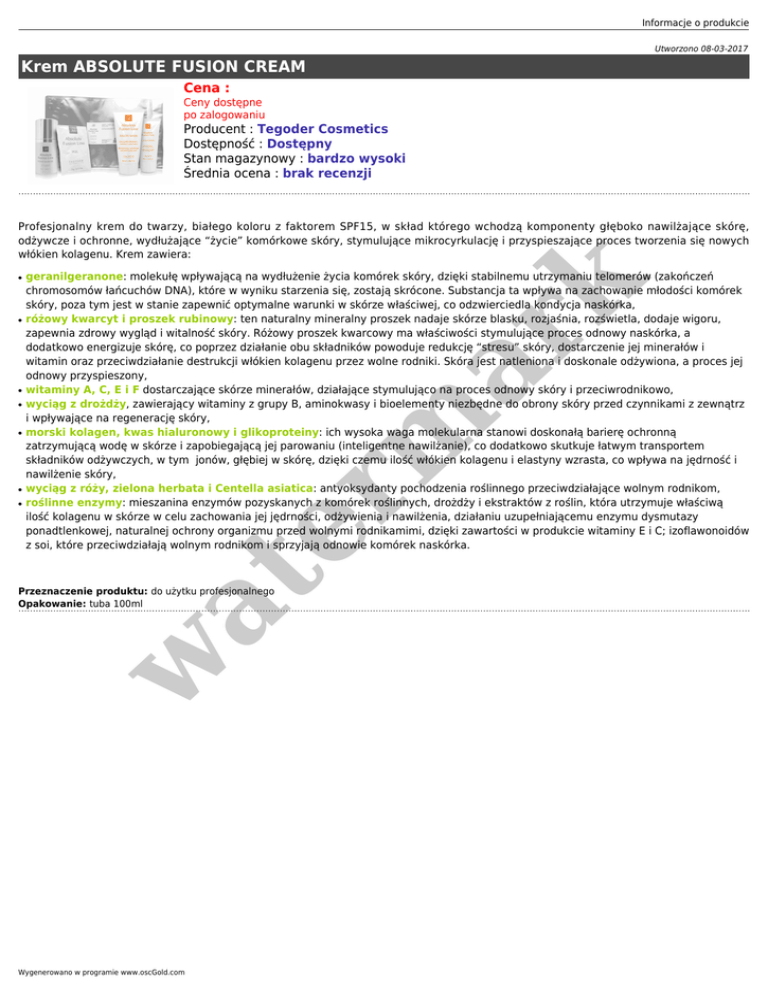 Informacje o produkcie Utworzono 08-03-2017 Krem ABSOLUTE FUSION CREAM Cena : Ceny dostępne po zalogowaniu Producent : Tegoder Cosmetics Dostępność : Dostępny Stan magazynowy : bardzo wysoki Średnia ocena : brak recenzji Profesjonalny krem do twarzy, białego koloru z faktorem SPF15, w skład którego wchodzą komponenty głęboko nawilżające skórę, odżywcze i ochronne, wydłużające “życie” komórkowe skóry, stymulujące mikrocyrkulację i przyspieszające proces tworzenia się nowych włókien kolagenu. Krem zawiera: ● ● ● ● ● at ● geranilgeranone: molekułę wpływającą na wydłużenie życia komórek skóry, dzięki stabilnemu utrzymaniu telomerów (zakończeń chromosomów łańcuchów DNA), które w wyniku starzenia się, zostają skrócone. Substancja ta wpływa na zachowanie młodości komórek skóry, poza tym jest w stanie zapewnić optymalne warunki w skórze właściwej, co odzwierciedla kondycja naskórka, różowy kwarcyt i proszek rubinowy: ten naturalny mineralny proszek nadaje skórze blasku, rozjaśnia, rozświetla, dodaje wigoru, zapewnia zdrowy wygląd i witalność skóry. Różowy proszek kwarcowy ma właściwości stymulujące proces odnowy naskórka, a dodatkowo energizuje skórę, co poprzez działanie obu składników powoduje redukcję “stresu” skóry, dostarczenie jej minerałów i witamin oraz przeciwdziałanie destrukcji włókien kolagenu przez wolne rodniki. Skóra jest natleniona i doskonale odżywiona, a proces jej odnowy przyspieszony, witaminy A, C, E i F dostarczające skórze minerałów, działające stymulująco na proces odnowy skóry i przeciwrodnikowo, wyciąg z drożdży, zawierający witaminy z grupy B, aminokwasy i bioelementy niezbędne do obrony skóry przed czynnikami z zewnątrz i wpływające na regenerację skóry, morski kolagen, kwas hialuronowy i glikoproteiny: ich wysoka waga molekularna stanowi doskonałą barierę ochronną zatrzymującą wodę w skórze i zapobiegającą jej parowaniu (inteligentne nawilżanie), co dodatkowo skutkuje łatwym transportem składników odżywczych, w tym jonów, głębiej w skórę, dzięki czemu ilość włókien kolagenu i elastyny wzrasta, co wpływa na jędrność i nawilżenie skóry, wyciąg z róży, zielona herbata i Centella asiatica: antyoksydanty pochodzenia roślinnego przeciwdziałające wolnym rodnikom, roślinne enzymy: mieszanina enzymów pozyskanych z komórek roślinnych, drożdży i ekstraktów z roślin, która utrzymuje właściwą ilość kolagenu w skórze w celu zachowania jej jędrności, odżywienia i nawilżenia, działaniu uzupełniającemu enzymu dysmutazy ponadtlenkowej, naturalnej ochrony organizmu przed wolnymi rodnikamimi, dzięki zawartości w produkcie witaminy E i C; izoflawonoidów z soi, które przeciwdziałają wolnym rodnikom i sprzyjają odnowie komórek naskórka. er m ar k ● w Przeznaczenie produktu: do użytku profesjonalnego Opakowanie: tuba 100ml Wygenerowano w programie www.oscGold.com