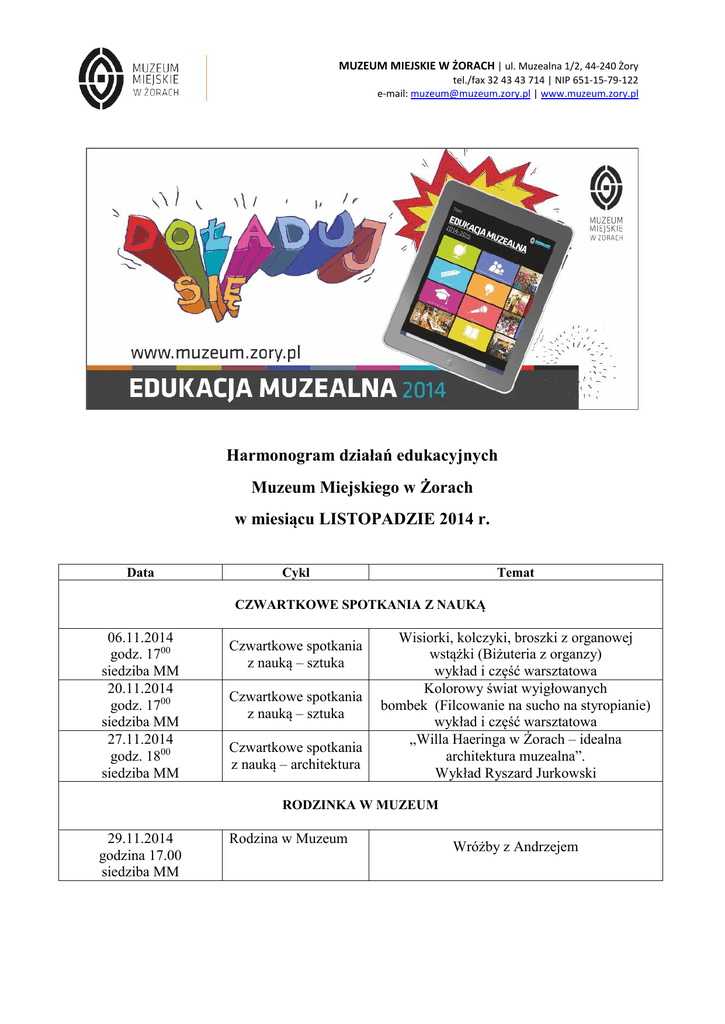 Harmonogram działań edukacyjnych Muzeum Miejskiego w Żorach
