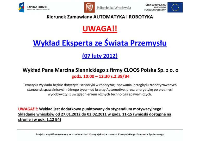 Kierunek Zamawiany AUTOMATYKA I ROBOTYKA UWAGA!! Wykład Eksperta ze Świata Przemysłu (07 luty 2012) Wykład Pana Marcina Siennickiego z firmy CLOOS Polska Sp. z o. o godz. 10:00 – 12:30 s.2.39/B4 Tematyka wykładu będzie dotyczyła: sensoryki w robotyzacji spawania, przeglądu zrobotyzowanych stanowisk spawalniczych różnego typu – od branży Automotive, przez energetykę po przemysł wydobywczy, z uwzględnieniem różnych technologii spawalniczych. UWAGA!!!: Wykład jest dodatkowo punktowany do stypendium motywacyjnego! Składanie wniosków od 27.01.2012 do 02.02.2011 w godz. 11-15 (wnioski dostępne na stronie i w pok. 1.12 B4)