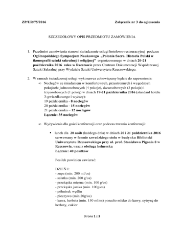 ZP/UR/75/2016 Załącznik nr 3 do ogłoszenia SZCZEGÓŁOWY OPIS PRZEDMIOTU ZAMÓWIENIA 1. Przedmiot zamówienia stanowi świadczenie usługi hotelowo-restauracyjnej podczas Ogólnopolskiego Sympozjum Naukowego „Polonia Sacra. Historia Polski w ikonografii sztuki sakralnej i religijnej” organizowanego w dniach 20-21 października 2016 roku w Rzeszowie przez Centrum Dokumentacji Współczesnej Sztuki Sakralnej przy Wydziale Sztuki Uniwersytetu Rzeszowskiego. 2. W ramach świadczonej usługi wykonawca zobowiązany będzie do zapewnienia: • Noclegów ze śniadaniem w komfortowych, przestronnych i wygodnych pokojach: jednoosobowych (4 pokoje), dwuosobowych (3 pokoje) i trzyosobowych (1 pokój) w dniach 19-21 października 2016 (standard hotelu 3-gwiazdkowego i wyższy): 19 października - 8 noclegów 20 października - 15 noclegów 21 października – 12 noclegów Łącznie: 35 noclegów • Wyżywienia dla gości konferencji oraz podczas trwania konferencji: lunch dla 20 osób (każdego dnia) w dniach 20 i 21 października 2016 serwowany w formie szwedzkiego stołu w budynku Biblioteki Uniwersytetu Rzeszowskiego przy ul. prof. Stanisława Pigonia 8 w Rzeszowie, wraz z obsługą kelnerską Łącznie: 40 posiłków Posiłek powinien zawierać: DZIEŃ I: - zupa (min. 200 ml/os) - sałatka (min. 200 g/os) - przekąska mięsna (min. 100 g/os) - przekąska jarska (min. 100g/os) - półmisek wędlin - pieczywo (min.20g/os) - kawa, herbata (min. 150 ml/os) ponadto mleko do kawy, cytrynę do herbaty, cukier Strona 1 z 3 DZIEŃ II: - zupa (min. 200 ml/os) - sałatka (preferowana propozycja jarska) (min. 200 g/os) - 2 rodzaje przekąsek mięsnych (min. 100 g/os każda) - przekąska jarska (min. 100g/os) - pieczywo (min.20g/os) - kawa, herbata (min. 150 ml/os) ponadto mleko do kawy, cytrynę do herbaty, cukier uroczysta kolacja dla 16 osób w dniu 21 października 2016 roku w Hotelu, w którym Wykonawca zapewnia noclegi (odległość hotelu od miejsca obrad konferencji (ul. prof. Pigonia 8) nie większa niż 10 km) Posiłek powinien zawierać: - przystawka (min.150g/os) - zupa (min. 200ml/os) - danie główne ( min. 200g/os) - deser (min. 150g/os) wraz z lampką wina (min. 100 ml/os) – do wyboru: czerwone i białe - kawa, herbata (min. 150 ml/os) ponadto mleko do kawy, cytrynę do herbaty, cukier - woda, soki (min. 250 ml/os) Uwaga: Wykonawca zobowiązany jest do przedstawienia szczegółowego opisu proponowanego menu. Proponowane dania nie mogą się powtarzać. • Serwisu kawowego dla 25 osób serwowany w sali konferencyjnej Biblioteki Uniwersytetu Rzeszowskiego przy ul. prof. Stanisława Pigonia 8 w Rzeszowie w przerwach odczytów w dniach 20 i 21 października 2016 (dwie przerwy dziennie) zawierającego 1 filiżankę kawy lub herbaty o pojemności min. 150 ml, mleko do kawy, cytrynę do herbaty, cukier, drobne ciasteczka w ilości min. 3 kg oraz wodę mineralną butelkowaną gazowaną i niegazowaną min. 0,5 l. / os. Powinna zostać również zapewniona obsługa do uzupełniania termosów z wrzątkiem, przekąsek oraz porządkowania stołów przed i w trakcie każdej z przerw. Posiłki serwowane na zastawie stołowej ceramicznej za sztućcami metalowymi- użyta zastawa powinna być czysta, nieuszkodzona i wysterylizowana. Wykonawca zapewni odpowiednią dekorację stołów, w tym obrusy wykonane z materiału i papierowe serwetki. Strona 2 z 3 (niedopuszczalne jest używanie naczyń i sztućców jednorazowych). Napoje zimne serwowane w naczyniach szklanych. Obsługa kelnerska wystąpi w schludnych strojach adekwatnych do wydarzenia. Inne wymagania zamawiającego: - odległość hotelu od miejsca obrad konferencji (ul. prof. Pigonia 8) nie większa niż 10 km - brak jakichkolwiek prac remontowych w hotelu - zapewnienia energii elektrycznej do oświetlenia pomieszczeń w hotelu i podczas uroczystej kolacji Zapewnienia w hotelu i podczas uroczystej kolacji odpowiedniej temperatury w zależności od pogody na zewnątrz. Zamawiający zastrzega sobie możliwość zmniejszenia liczby noclegów o max 20 % osób oraz posiłków na 5 dni przed datą rozpoczęcia realizacji przedmiotu zamówienia. Zamawiający zastrzega możliwość zmiany części menu na specjalną dietę (opcja wegetariańska i/lub bez wieprzowiny) w przypadku uczestnictwa w konferencji osób ze specjalną dietą żywieniową. Informacja o ewentualnej zmianie części menu zostanie przekazana Wykonawcy na 5 dni przed datą rozpoczęcia realizacji przedmiotu zamówienia. Płatność: Przelewem, po uprzednim podpisaniu umowy, w terminie do 30 dni od wystawienia faktury VAT Zamawiający zapłaci Wykonawcy wynagrodzenie za ilość osób zgłoszonych do korzystania z usługi obiadów/ kolacji oraz hotelu (nie dotyczy serwisu kawowego). Strona 3 z 3