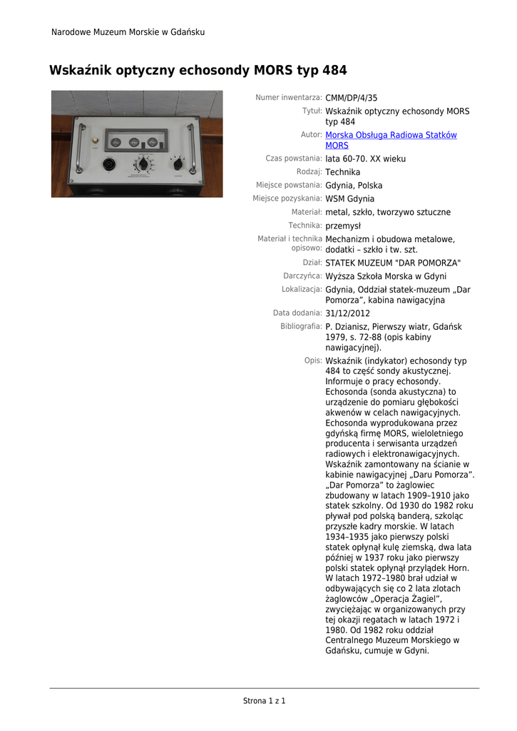 Narodowe Muzeum Morskie w Gdańsku Wskaźnik optyczny echosondy MORS typ 484 Numer inwentarza: CMM/DP/4/35 Tytuł: Wskaźnik optyczny echosondy MORS typ 484 Autor: Morska Obsługa Radiowa Statków MORS Czas powstania: lata 60-70. XX wieku Rodzaj: Technika Miejsce powstania: Gdynia, Polska Miejsce pozyskania: WSM Gdynia Materiał: metal, szkło, tworzywo sztuczne Technika: przemysł Materiał i technika Mechanizm i obudowa metalowe, opisowo: dodatki – szkło i tw. szt. Dział: STATEK MUZEUM "DAR POMORZA" Darczyńca: Wyższa Szkoła Morska w Gdyni Lokalizacja: Gdynia, Oddział statek-muzeum „Dar Pomorza”, kabina nawigacyjna Data dodania: 31/12/2012 Bibliografia: P. Dzianisz, Pierwszy wiatr, Gdańsk 1979, s. 72-88 (opis kabiny nawigacyjnej). Opis: Wskaźnik (indykator) echosondy typ 484 to część sondy akustycznej. Informuje o pracy echosondy. Echosonda (sonda akustyczna) to urządzenie do pomiaru głębokości akwenów w celach nawigacyjnych. Echosonda wyprodukowana przez gdyńską firmę MORS, wieloletniego producenta i serwisanta urządzeń radiowych i elektronawigacyjnych. Wskaźnik zamontowany na ścianie w kabinie nawigacyjnej „Daru Pomorza”. „Dar Pomorza” to żaglowiec zbudowany w latach 1909–1910 jako statek szkolny. Od 1930 do 1982 roku pływał pod polską banderą, szkoląc przyszłe kadry morskie. W latach 1934–1935 jako pierwszy polski statek opłynął kulę ziemską, dwa lata później w 1937 roku jako pierwszy polski statek opłynął przylądek Horn. W latach 1972–1980 brał udział w odbywających się co 2 lata zlotach żaglowców „Operacja Żagiel”, zwyciężając w organizowanych przy tej okazji regatach w latach 1972 i 1980. Od 1982 roku oddział Centralnego Muzeum Morskiego w Gdańsku, cumuje w Gdyni. Strona 1 z 1
