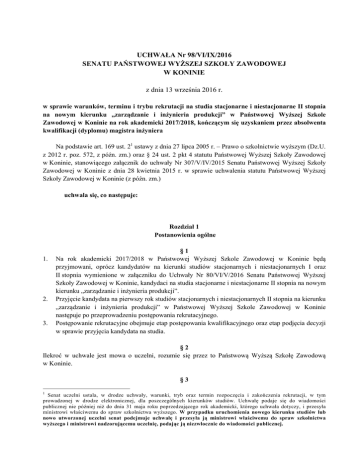 UCHWAŁA Nr 98/VI/IX/2016 SENATU PAŃSTWOWEJ WYŻSZEJ SZKOŁY ZAWODOWEJ W KONINIE z dnia 13 września 2016 r. w sprawie warunków, terminu i trybu rekrutacji na studia stacjonarne i niestacjonarne II stopnia na nowym kierunku „zarządzanie i inżynieria produkcji” w Państwowej Wyższej Szkole Zawodowej w Koninie na rok akademicki 2017/2018, kończącym się uzyskaniem przez absolwenta kwalifikacji (dyplomu) magistra inżyniera Na podstawie art. 169 ust. 21 ustawy z dnia 27 lipca 2005 r. – Prawo o szkolnictwie wyższym (Dz.U. z 2012 r. poz. 572, z późn. zm.) oraz § 24 ust. 2 pkt 4 statutu Państwowej Wyższej Szkoły Zawodowej w Koninie, stanowiącego załącznik do uchwały Nr 307/V/IV/2015 Senatu Państwowej Wyższej Szkoły Zawodowej w Koninie z dnia 28 kwietnia 2015 r. w sprawie uchwalenia statutu Państwowej Wyższej Szkoły Zawodowej w Koninie (z późn. zm.) uchwala się, co następuje: Rozdział 1 Postanowienia ogólne 1. 2. 3. §1 Na rok akademicki 2017/2018 w Państwowej Wyższej Szkole Zawodowej w Koninie będą przyjmowani, oprócz kandydatów na kierunki studiów stacjonarnych i niestacjonarnych I oraz II stopnia wymienione w załączniku do Uchwały Nr 80/VI/V/2016 Senatu Państwowej Wyższej Szkoły Zawodowej w Koninie, kandydaci na studia stacjonarne i niestacjonarne II stopnia na nowym kierunku „zarządzanie i inżynieria produkcji”. Przyjęcie kandydata na pierwszy rok studiów stacjonarnych i niestacjonarnych II stopnia na kierunku „zarządzanie i inżynieria produkcji” w Państwowej Wyższej Szkole Zawodowej w Koninie następuje po przeprowadzeniu postępowania rekrutacyjnego. Postępowanie rekrutacyjne obejmuje etap postępowania kwalifikacyjnego oraz etap podjęcia decyzji w sprawie przyjęcia kandydata na studia. §2 Ilekroć w uchwale jest mowa o uczelni, rozumie się przez to Państwową Wyższą Szkołę Zawodową w Koninie. §3 1 Senat uczelni ustala, w drodze uchwały, warunki, tryb oraz termin rozpoczęcia i zakończenia rekrutacji, w tym prowadzonej w drodze elektronicznej, dla poszczególnych kierunków studiów. Uchwałę podaje się do wiadomości publicznej nie później niż do dnia 31 maja roku poprzedzającego rok akademicki, którego uchwała dotyczy, i przesyła ministrowi właściwemu do spraw szkolnictwa wyższego. W przypadku uruchomienia nowego kierunku studiów lub nowo utworzonej uczelni senat podejmuje uchwałę i przesyła ją ministrowi właściwemu do spraw szkolnictwa wyższego i ministrowi nadzorującemu uczelnię, podając ją niezwłocznie do wiadomości publicznej. Postępowanie kwalifikacyjne na studia II stopnia na kierunku „zarządzanie i inżynieria produkcji” dotyczy: 1) kandydatów posiadających dyplom ukończenia studiów I stopnia, II stopnia albo jednolitych na kierunkach przynależących w całości lub w części do obszaru nauk społecznych lub obszaru nauk technicznych i zakończonych uzyskaniem kwalifikacji (dyplomów) innych, niż kwalifikacje inżyniera lub magistra inżyniera – w przypadku studiów trwających 4 semestry i mających minimalny wymiar 120 pkt ECTS; 2) kandydatów posiadających dyplom ukończenia studiów I stopnia, II stopnia albo jednolitych na kierunkach przynależących w całości lub w części do obszaru nauk społecznych lub obszaru nauk technicznych i zakończonych uzyskaniem kwalifikacji (dyplomów) inżyniera lub magistra inżyniera – w przypadku studiów trwających 3 semestry i mających minimalny wymiar 90 pkt ECTS. 1. 2. 1. 2. 1. 2. 3. 4. 5. §4 Obywatele polscy, którzy ukończyli szkołę wyższą za granicą, mogą ubiegać się o przyjęcie na pierwszy rok studiów II stopnia pod warunkiem posiadania zalegalizowanego lub opatrzonego apostille dyplomu lub innego dokumentu ukończenia uczelni za granicą, uprawniającego do podjęcia studiów II stopnia w państwie, w którym został wydany, uznanego za równorzędny z odpowiednim polskim dyplomem ukończenia studiów I stopnia albo jednolitych studiów magisterskich zgodnie z przepisami w sprawie nostryfikacji dyplomów ukończenia studiów wyższych uzyskanych za granicą, chyba że zostali zwolnieni na podstawie tych przepisów z postępowania nostryfikacyjnego, albo uznanego na podstawie umowy międzynarodowej za równorzędny z odpowiednim polskim dyplomem ukończenia studiów I stopnia, II stopnia albo jednolitych studiów magisterskich lub za uprawniający do podjęcia studiów II stopnia w Rzeczypospolitej Polskiej. W przypadkach, o których mowa w ust. 1, do obliczenia punktów rankingowych stosuje się przepisy Rozdziału 2 niniejszej uchwały. §5 Zasady podejmowania studiów przez cudzoziemców, w tym cudzoziemców legitymujących się dyplomem ukończenia w Polsce studiów wyższych, określają odrębne przepisy. Cudzoziemcy, którzy podejmują studia II stopnia na zasadach rekrutacji obowiązujących obywateli polskich, podlegają postępowaniu kwalifikacyjnemu zgodnie z zasadami rekrutacji na studia zawartymi w Rozdziale 2 niniejszej uchwały. §6 Przyjęcia na poszczególne formy studiów odbywają się w ramach ustalonej przez Senat uczelni liczby miejsc. Kandydat ubiegający się o przyjęcie na studia wnosi opłatę rekrutacyjną w wysokości określonej przez Rektora. Kandydat może ubiegać się o przyjęcie na więcej niż jeden kierunek lub formę studiów. W takim przypadku zobowiązany jest każdorazowo do złożenia odrębnego kompletu dokumentów oraz dokonania opłaty, o której mowa w ust. 2. Kandydat określa w systemie elektronicznej rekrutacji preferowaną kolejność kierunków i form studiów. W przypadku nieprzyjęcia na studia albo nieuruchomienia studiów na kierunku lub formie studiów preferowanej przez kandydata w pierwszej kolejności, kandydat będzie kwalifikowany na kolejno preferowane kierunki i formy studiów, z uwzględnieniem warunków rekrutacji na danym kierunku studiów. 2 6. Rektor, kierując się zasadą odpowiedzialności za jakość kształcenia oraz możl