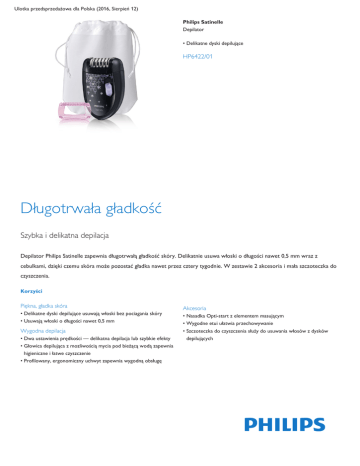 Ulotka przedsprzedażowa dla Polska (2016, Sierpień 12) Philips Satinelle Depilator • Delikatne dyski depilujące HP6422/01 Długotrwała gładkość Szybka i delikatna depilacja Depilator Philips Satinelle zapewnia długotrwałą gładkość skóry. Delikatnie usuwa włoski o długości nawet 0,5 mm wraz z cebulkami, dzięki czemu skóra może pozostać gładka nawet przez cztery tygodnie. W zestawie 2 akcesoria i mała szczoteczka do czyszczenia. Korzyści Piękna, gładka skóra • Delikatne dyski depilujące usuwają włoski bez pociagania skóry • Usuwają włoski o długości nawet 0,5 mm Wygodna depilacja • Dwa ustawienia prędkości — delikatna depilacja lub szybkie efekty • Głowica depilująca z mozliwością mycia pod bieżącą wodą zapewnia higieniczne i łatwe czyszczenie • Profilowany, ergonomiczny uchwyt zapewnia wygodną obsługę Akcesoria • Nasadka Opti-start z elementem masującym • Wygodne etui ułatwia przechowywanie • Szczoteczka do czyszczenia służy do usuwania włosów z dysków depilujących Satinelle Cechy Głowica depilująca z możliwością mycia pod bieżącą wodą Nasadka Opti-start z systemem masującym Wielofunkcyjna nasadka pozwala uzyskać maksymalny kontakt depilatora ze skórą i rozluźnienie skóry przed depilacją. Umożliwia również ustawienie depilatora pod odpowiednim kątem, zapewniając skuteczne usuwanie włosów podczas całego zabiegu. Wygodne etui Niewielkie etui ułatwia przechowywanie. Delikatne dyski depilujące Depilator jest wyposażony w głowicę depilującą z możliwością mycia. Głowicę można odłączyć i wyczyścić pod bieżącą wodą, co ułatwia zachowanie higieny. Depilator jest wyposażony w delikatne dyski depilujące, które usuwają włoski o długości nawet 0,5 mm bez pociągania skóry Szczoteczka do czyszczenia Wyjątkowe dyski depilujące Mała szczoteczka do czyszczenia służy do usuwania włosów z dysków depilujących. Wyjątkowe dyski depilujące usuwają włoski o długości nawet 0,5 mm. Ergonomiczny uchwyt Zaokrąglony kształt doskonale mieści się dłoni, co umożliwia wygodne zabiegi Dwa ustawienia prędkości Dodatkowe ustawienie wysokiej prędkości pozwala usunąć drobne i trudno dostępne włoski Specyfikacje Prosimy pamiętać, że jest to ulotka przedsprzedażowa. Treść ulotki jest zgodna z naszą najlepszą wiedzą w momencie publikacji i w odniesieniu do danego kraju (podane powyżej). Treść ulotki może ulec zmianie bez powiadomienia. Firma Philips nie ponosi odpowiedzialności za treść ulotki. Właściwości Delikatne dyski depilujące Wyjątkowe dyski depilujące 2 ustawienia prędkości Głowica depilująca z możliwością mycia Ergonomiczny uchwyt 2 lata gwarancji Tak Napięcie zasilacza Napięcie urządzenia Tak Wymiary opakowania Wysokość Szerokość Głębokość Waga netto Waga brutto EAN Liczba produktów w zestawie Kraj pochodzenia Kod towaru według Systemu Zharmonizowanego (HS) Tak Tak Tak Tak Akcesoria Nasadka Opti-start Szczoteczka do czyszczenia Wygodne etui z elementem masującym Tak Tak 18,50 cm 12,00 cm 6,00 cm 0,18 kg 0,25 kg 08710103624875 1 BA 851030 Karton zewnętrzny Długość Szerokość Wysokość Waga brutto EAN Liczba opakowań konsumenckich Dane techniczne Liczba punktów chwytania włosków Liczba dysków Liczba czynności wyrywania/sekundę — prędkość 1 Liczba czynności wyrywania/sekundę — prędkość 2 13 V / 400 mA 13 V 20 21 600 25,00 cm 13,00 cm 20,20 cm 1,16 kg 18710103624872 4 733 Dane wkrótce ulegną zmianie 2016, Sierpień 12 Version: 8.0.1 EAN: 08710103624875 © 2016 Koninklijke Philips Electronics N.V. Wszelkie prawa zastrzeżone Dane mogą ulec zmianie bez uprzedniego powiadomienia. Znak towarowy jest własnością Koninklijke Philips Electronics N.V. lub odpowiednich podmiotów . www.philips.com