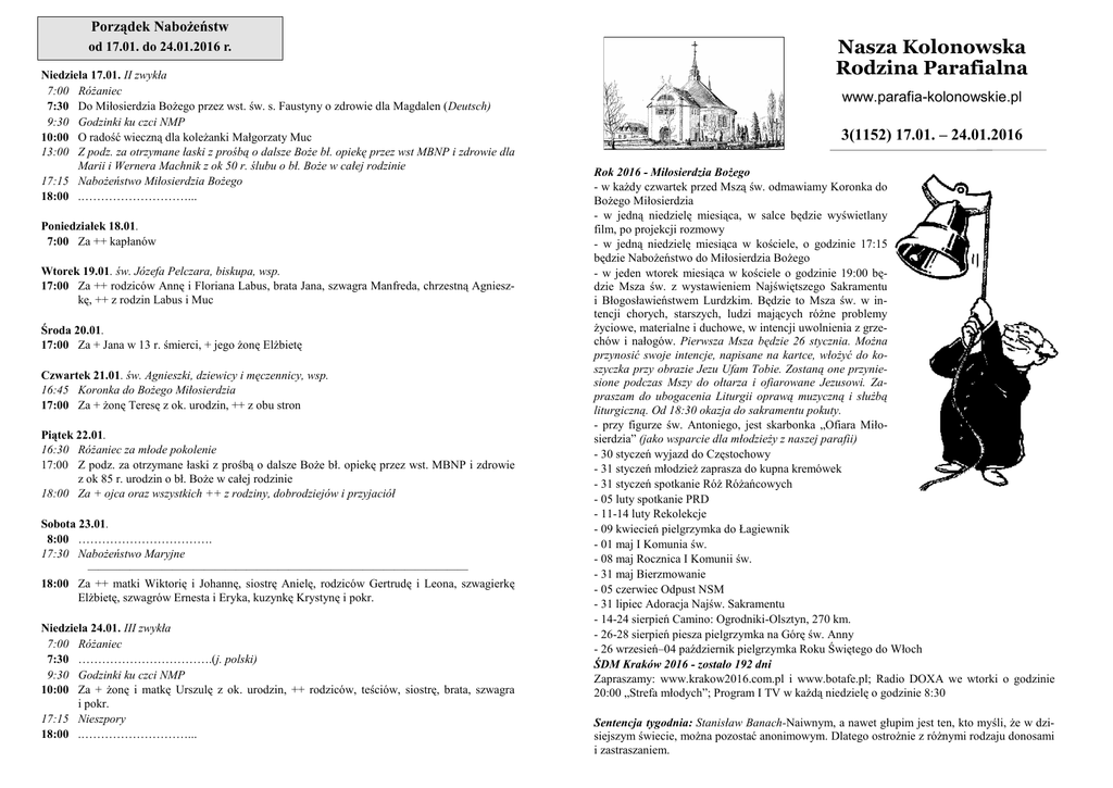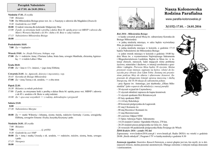 Porządek Nabożeństw od 17.01. do 24.01.2016 r. Niedziela 17.01. II zwykła 7:00 Różaniec 7:30 Do Miłosierdzia Bożego przez wst. św. s. Faustyny o zdrowie dla Magdalen (Deutsch) 9:30 Godzinki ku czci NMP 10:00 O radość wieczną dla koleżanki Małgorzaty Muc 13:00 Z podz. za otrzymane łaski z prośbą o dalsze Boże bł. opiekę przez wst MBNP i zdrowie dla Marii i Wernera Machnik z ok 50 r. ślubu o bł. Boże w całej rodzinie 17:15 Nabożeństwo Miłosierdzia Bożego 18:00 .………………………... Poniedziałek 18.01. 7:00 Za ++ kapłanów Wtorek 19.01. św. Józefa Pelczara, biskupa, wsp. 17:00 Za ++ rodziców Annę i Floriana Labus, brata Jana, szwagra Manfreda, chrzestną Agnieszkę, ++ z rodzin Labus i Muc Środa 20.01. 17:00 Za + Jana w 13 r. śmierci, + jego żonę Elżbietę Czwartek 21.01. św. Agnieszki, dziewicy i męczennicy, wsp. 16:45 Koronka do Bożego Miłosierdzia 17:00 Za + żonę Teresę z ok. urodzin, ++ z obu stron Piątek 22.01. 16:30 Różaniec za młode pokolenie 17:00 Z podz. za otrzymane łaski z prośbą o dalsze Boże bł. opiekę przez wst. MBNP i zdrowie z ok 85 r. urodzin o bł. Boże w całej rodzinie 18:00 Za + ojca oraz wszystkich ++ z rodziny, dobrodziejów i przyjaciół Sobota 23.01. 8:00 ……………………………. 17:30 Nabożeństwo Maryjne ———————————————————————————————————— 18:00 Za ++ matki Wiktorię i Johannę, siostrę Anielę, rodziców Gertrudę i Leona, szwagierkę Elżbietę, szwagrów Ernesta i Eryka, kuzynkę Krystynę i pokr. Niedziela 24.01. III zwykła 7:00 Różaniec 7:30 …………………………….(j. polski) 9:30 Godzinki ku czci NMP 10:00 Za + żonę i matkę Urszulę z ok. urodzin, ++ rodziców, teściów, siostrę, brata, szwagra i pokr. 17:15 Nieszpory 18:00 .………………………... Nasza Kolonowska Rodzina Parafialna www.parafia-kolonowskie.pl 3(1152) 17.01. – 24.01.2016 Rok 2016 - Miłosierdzia Bożego - w każdy czwartek przed Mszą św. odmawiamy Koronka do Bożego Miłosierdzia - w jedną niedzielę miesiąca, w salce będzie wyświetlany film, po projekcji rozmowy - w jedną niedzielę miesiąca w kościele, o godzinie 17:15 będzie Nabożeństwo do Miłosierdzia Bożego - w jeden wtorek miesiąca w kościele o godzinie 19:00 będzie Msza św. z wystawieniem Najświętszego Sakramentu i Błogosławieństwem Lurdzkim. Będzie to Msza św. w intencji chorych, starszych, ludzi mających różne problemy życiowe, materialne i duchowe, w intencji uwolnienia z grzechów i nałogów. Pierwsza Msza będzie 26 stycznia. Można przynosić swoje intencje, napisane na kartce, włożyć do koszyczka przy obrazie Jezu Ufam Tobie. Zostaną one przyniesione podczas Mszy do ołtarza i ofiarowane Jezusowi. Zapraszam do ubogacenia Liturgii oprawą muzyczną i służbą liturgiczną. Od 18:30 okazja do sakramentu pokuty. - przy figurze św. Antoniego, jest skarbonka „Ofiara Miłosierdzia” (jako wsparcie dla młodzieży z naszej parafii) - 30 styczeń wyjazd do Częstochowy - 31 styczeń młodzież zaprasza do kupna kremówek - 31 styczeń spotkanie Róż Różańcowych - 05 luty spotkanie PRD - 11-14 luty Rekolekcje - 09 kwiecień pielgrzymka do Łagiewnik - 01 maj I Komunia św. - 08 maj Rocznica I Komunii św. - 31 maj Bierzmowanie - 05 czerwiec Odpust NSM - 31 lipiec Adoracja Najśw. Sakramentu - 14-24 sierpień Camino: Ogrodniki-Olsztyn, 270 km. - 26-28 sierpień piesza pielgrzymka na Górę św. Anny - 26 wrzesień–04 październik pielgrzymka Roku Świętego do Włoch ŚDM Kraków 2016 - zostało 192 dni Zapraszamy: www.krakow2016.com.pl i www.botafe.pl; Radio DOXA we wtorki o godzinie 20:00 „Strefa młodych”; Program I TV w każdą niedzielę o godzinie 8:30 Sentencja tygodnia: Stanisław Banach-Naiwnym, a nawet głupim jest ten, kto myśli, że w dzisiejszym świecie, można pozostać anonimowym. Dlatego ostrożnie z różnymi rodzaju donosami i zastraszaniem. 3/2016 Pielgrzymka do Włoch - od 26.09. do 04.10. 2016 rok. Cena 1990 zł. DZIEŃ 1 Msza św. i wyjazd z Kolonowskiego we wczesnych godzinach rannych. Przejazd na obiadokolację i nocleg w okolicach Padwy. DZIEŃ 2 Śniadanie. Przejazd do Asyżu jednego z najbardziej urokliwych miast Włoch, miejsca urodzenia św. Franciszka i św. Klary. Nawiedzimy dwukondygnacyjną Bazylikę św. Franciszka z kryptą, w której złożono ciało Świętego. Freski, które zdobią bazylikę pozwolą nam zapoznać się z przełomowym malarstwem Giotta. Spacerując po mieście, poznamy wspaniale zachowany charakter epoki średniowiecza. Nawiedzimy również bazylikę Św. Klary, gdzie w kościele podziemnym pochowane są relikwie świętej. Udamy się do Bazyliki Matki Bożej Anielskiej z Porcjunkulą. Przejazd na obiadokolację i nocleg w okolicach Rzymu. DZIEŃ 3 Śniadanie. Przejazd do Rzymu. Udamy się do Watykanu. W zależności od obecności Ojca Świętego, weźmiemy udział w Audiencji Generalnej. Czas wolny na Placu Świętego Piotra. ulicą Via della Conciliazione przez most Świętego Anioła udamy się na zwiedzanie Rzymu barokowego: plac Navona, Schody Hiszpańskie, fontanna di Trevi. Ciekawą odmiennością od barokowego charakteru tej okolicy będzie starożytny Panteon. Na placu Hiszpańskim oddamy cześć Matce Bożej, której statua usytuowana jest na szczycie kolumny. Tu papież św. Jan Paweł II odmówił modlitwę: „Tobie, Matko Nasza, zawierzam losy ludzkości.” Następnie udamy się do bazyliki Santa Maria Maggiore Matki Bożej Śnieżnej. To jedna z Bazylik Większych, która zachowała swoją pierwotną formę. Powrót na obiadokolację i nocleg. DZIEŃ 4 Śniadanie. Przejazd do Rzymu. Udamy się do Watykanu. Zwiedzanie Bazyliki św. Piotra: przedsionek i drzwi święte, kaplica Piety Michała Anioła. W kaplicy św. Sebastiana pomodlimy się przy grobie Świętego Jana Pawła II. Zobaczymy także baldachim Berniniego, ołtarz główny. Zejśc
