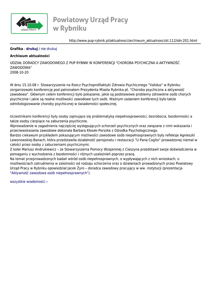 http://www.pup-rybnik.pl/aktualnosci/archiwum_aktualnosci/st:112/idn:201.html Grafika : drukuj / nie drukuj Archiwum aktualności UDZIAŁ DORADCY ZAWODOWEGO Z PUP RYBNIK W KONFERENCJI "CHOROBA PSYCHICZNA A AKTYWNOŚĆ ZAWODOWA" 2008-10-20 W dniu 15.10.08 r. Stowarzyszenie na Rzecz Psychoprofilaktyki Zdrowia Psychicznego "Validus" w Rybniku zorganizowało konferencję pod patronatem Prezydenta Miasta Rybnika pt. "Choroba psychiczna a aktywność zawodowa". Głównym celem konferencji było pokazanie, jakie są podstawowe problemy zdrowotne osób chorych psychicznie i jakie są realne możliwości zawodowe tych osób. Ważnym zadaniem konferencji było także odmitologizowanie choroby psychicznej w świadomości społecznej. Uczestnikami konferencji były osoby zajmujące się problematyką niepełnosprawności, bezrobocia, bezdomności a także osoby cierpiące na zaburzenia psychiczne. Wprowadzenie w zagadnienia najczęściej występujących schorzeń psychicznych oraz związane z nimi wskazania i przeciwwskazania zawodowe dokonała Barbara Kłosek-Porszke z Ośrodka Psychologicznego. Bardzo ciekawym przykładem pokazującym możliwości zawodowe osób niepełnosprawnych były refleksje Agnieszki Lewonowskiej-Banach, która przedstawiła działalność pensjonatu i restauracji "U Pana Cogito" prowadzonej niemal w całości przez osoby z zaburzeniami psychicznymi. Z kolei Mariusz Andrukiewicz – ze Stowarzyszenia Pomocy Wzajemnej z Cieszyna przedstawił swoje doświadczenia w pomaganiu z wychodzenia z bezdomności i różnych uzależnień poprzez pracę. Na temat przeprowadzonych badań wśród osób niepełnosprawnych, o wypływających z nich wnioskach, o możliwościach zatrudnienia w zależności od rodzaju schorzenia oraz o działaniach prowadzonych przez Powiatowy Urząd Pracy w Rybniku opowiedział Jacek Żyro – doradca zawodowy pracujący w ww. instytucji (prezentacja "Aktywność zawodowa osób niepełnosprawnych"). wszystkie wiadomości ›