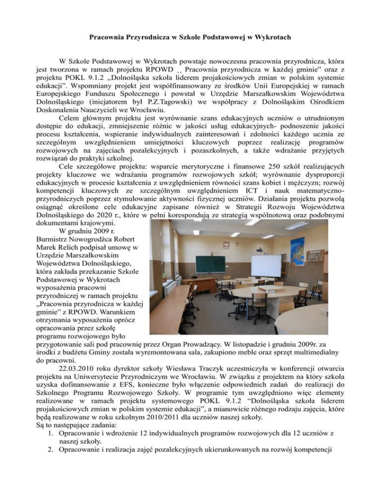 Pracownia Przyrodnicza w Szkole Podstawowej w Wykrotach W Szkole Podstawowej w Wykrotach powstaje nowoczesna pracownia przyrodnicza, która jest tworzona w ramach projektu RPOWD ¸¸ Pracownia przyrodnicza w każdej gminie” oraz z projektu POKL 9.1.2 ,,Dolnośląska szkoła liderem projakościowych zmian w polskim systemie edukacji”. Wspomniany projekt jest współfinansowany ze środków Unii Europejskiej w ramach Europejskiego Funduszu Społecznego i powstał w Urzędzie Marszałkowskim Województwa Dolnośląskiego (inicjatorem był P.Z.Tagowski) we współpracy z Dolnośląskim Ośrodkiem Doskonalenia Nauczycieli we Wrocławiu. Celem głównym projektu jest wyrównanie szans edukacyjnych uczniów o utrudnionym dostępie do edukacji, zmniejszenie różnic w jakości usług edukacyjnych- podnoszenie jakości procesu kształcenia, wspieranie indywidualnych zainteresowań i zdolności każdego ucznia ze szczególnym uwzględnieniem umiejętności kluczowych poprzez realizację programów rozwojowych na zajęciach pozalekcyjnych i pozaszkolnych, a także wdrażanie przyjętych rozwiązań do praktyki szkolnej. Cele szczegółowe projektu: wsparcie merytoryczne i finansowe 250 szkół realizujących projekty kluczowe we wdrażaniu programów rozwojowych szkół; wyrównanie dysproporcji edukacyjnych w procesie kształcenia z uwzględnieniem równości szans kobiet i mężczyzn; rozwój kompetencji kluczowych ze szczególnym uwzględnieniem ICT i nauk matematycznoprzyrodniczych poprzez stymulowanie aktywności fizycznej uczniów. Działania projektu pozwolą osiągnąć określone cele edukacyjne zapisane również w Strategii Rozwoju Województwa Dolnośląskiego do 2020 r., które w pełni korespondują ze strategią wspólnotową oraz podobnymi dokumentami krajowymi. W grudniu 2009 r. Burmistrz Nowogrodźca Robert Marek Relich podpisał umowę w Urzędzie Marszałkowskim Województwa Dolnośląskiego, która zakłada przekazanie Szkole Podstawowej w Wykrotach wyposażenia pracowni przyrodniczej w ramach projektu „Pracownia przyrodnicza w każdej gminie” z RPOWD. Warunkiem otrzymania wyposażenia oprócz opracowania przez szkołę programu rozwojowego było przygotowanie sali pod pracownię przez Organ Prowadzący. W listopadzie i grudniu 2009r. za środki z budżetu Gminy została wyremontowana sala, zakupiono meble oraz sprzęt multimedialny do pracowni. 22.03.2010 roku dyrektor szkoły Wiesława Traczyk uczestniczyła w konferencji otwarcia projektu na Uniwersytecie Przyrodniczym we Wrocławiu. W związku z projektem na który szkoła uzyska dofinansowanie z EFS, konieczne było włączenie odpowiednich zadań do realizacji do Szkolnego Programu Rozwojowego Szkoły. W programie tym uwzględniono więc elementy realizowane w ramach projektu systemowego POKL 9.1.2 “Dolnośląska szkoła liderem projakościowych zmian w polskim systemie edukacji”, a mianowicie różnego rodzaju zajęcia, które będą realizowane w roku szkolnym 2010/2011 dla uczniów naszej szkoły. Są to następujące zadania: 1. Opracowanie i wdrożenie 12 indywidualnych programów rozwojowych dla 12 uczniów z naszej szkoły. 2. Opracowanie i realizacja zajęć pozalekcyjnych ukierunkowanych na rozwój kompetencji kluczowych ze szczególnym uwzględnieniem TI i nauk matematyczno- przyrodniczych w kl. 4-6 : - kółko laboratoryjno-eksperymentalne ( 1 godz.) - kółko młodych odkrywców ( 1 godz.) - kółko matematycznoinformatyczne ( 1 godz.) 3. Udział uczniów w zajęciach pozaszkolnych realizujących międzyszkolne projekty edukacyjne. 4. Opracowanie i wdrożenie 1 zajęć wyrównawczych z matematyki. 5. Organizacja 3 wycieczek dydaktycznych po terenie Dolnego Śląska. 6. Organizacja 3 wyjazdów na warsztaty w Multicentrum. Otwarcie pracowni przyrodniczej w Szkole Podstawowej w Wykrotach, jeśli realizacja projektu będzie przebiegała zgodnie z planem, jest zaplanowana na wrzesień 2010r. Z pracowni tej będą mogli korzystać przede wszystkim uczniowie ze szkół podstawowych z terenu gminy Nowogrodziec w zakresie realizacji podstawy programowej z przedmiotu przyrody.