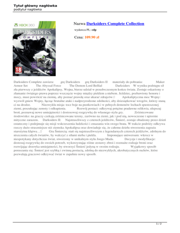 Tytuł główny nagłówka podtytuł nagłówka Nazwa Darksiders Complete Collection wydawca PL: cdp Cena: 109.90 zł Darksiders Complete zawiera: grę Darksiders grę Darksiders II materiały do pobrania: Maker Armor Set The Abyssal Force The Demon Lord Bellial Darksiders W wyniku podstępu sił zła pierwszy z jeźdźców Apokalipsy, Wojna, bierze udział w przedwczesnym końcu świata. Zostaje oskarżony o złamanie świętego prawa poprzez wszczęcie wojny między piekłem a niebem. Jeździec, pozbawiony honoru i mocy, musi powrócić na ziemię, aby poznać prawdę oraz ukarać zdrajców. Apokaliptyczna moc Wojny: wyzwól gniew Wojny, łącząc brutalne ataki i nadprzyrodzone zdolności, aby dziesiątkować wrogów, którzy staną ci na drodze. Niezwykła misja: tocz boje na pustkowiach i w pełnych demonów lochach spustoszonej ziemi, poszukując zemsty i odkupienia. Rozwój postaci: odkrywaj potężne pradawne relikwia, ulepszaj broń, poznawaj nowe umiejętności i dostosowuj rozgrywkę do własnego stylu gry. Zróżnicowane środowisko: na graczy czekają zróżnicowane tereny, zarówno na ziemi, jak i pod nią, nowoczesne i upiornie mityczne zarazem. Darksiders II: Najstraszliwszy z czterech jeźdźców, Śmierć, zostaje obudzony przez dzień ostateczny i podejmuje się misji wskrzeszenia ludzkości i zmazania win swego brata. W trakcie podróży odkrywa rzeczy dużo straszniejsze niż ziemska Apokalipsa oraz dowiaduje się, że całemu dziełu stworzenia zagraża starożytna klątwa… Gra Śmiercią: stań się najstraszliwszym z legendarnych czterech jeźdźców, zdolnym do niszczenia całych światów, by walczyć z siłami nieba i piekła. Imponujące uniwersum: wkrocz w niespotykany dotychczas świat, stworzony w unikalnym stylu Joego Mada. Decyzje i modyfikacje: dostosuj rozgrywkę do swoich potrzeb, wykorzystując różne zestawy zbroi i rozmaite rodzaje broni oraz rozwijając drzewka umiejętności, by stworzyć Śmierć jedyną w swoim rodzaju. Wyjątkowy sposób poruszania się: Śmierć jest szybką i zwinną postacią, zdolną do niezwykłych, akrobatycznych ruchów, które pozwalają graczowi odkrywać świat w zupełnie nowy sposób. 1/2 Tytuł główny nagłówka podtytuł nagłówka Nazwa Wartość Wydawca PL CDP.pl / CD Projekt Tryb gry Single Player Data premiery Kategoria wiekowa Wersja językowa Wymagania sprzętowe Format 18.04.2014 18+ ENG Konsola Xbox 360 DVD 2/2