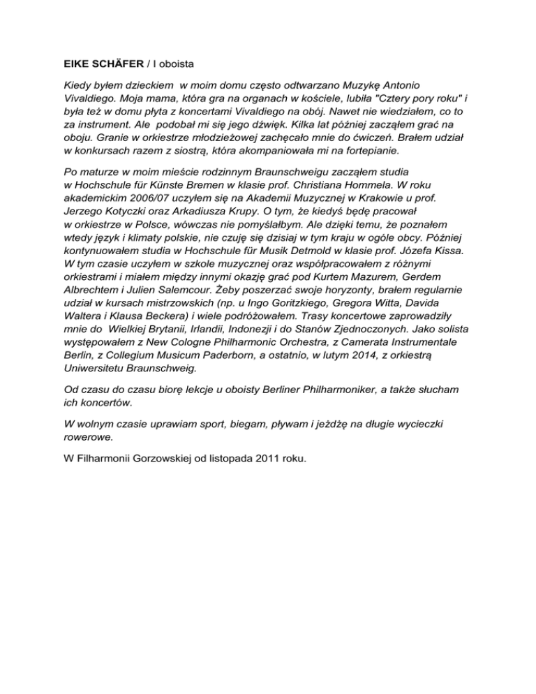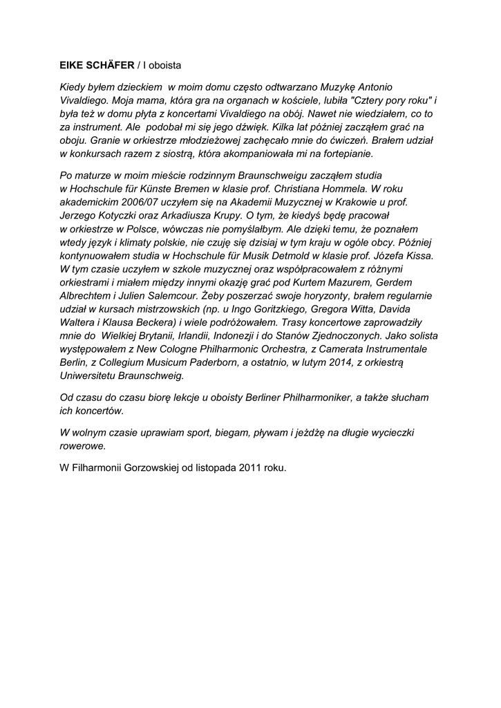 EIKE SCHÄFER / I oboista Kiedy byłem dzieckiem w moim domu często odtwarzano Muzykę Antonio Vivaldiego. Moja mama, która gra na organach w kościele, lubiła "Cztery pory roku" i była też w domu płyta z koncertami Vivaldiego na obój. Nawet nie wiedziałem, co to za instrument. Ale podobał mi się jego dźwięk. Kilka lat później zacząłem grać na oboju. Granie w orkiestrze młodzieżowej zachęcało mnie do ćwiczeń. Brałem udział w konkursach razem z siostrą, która akompaniowała mi na fortepianie. Po maturze w moim mieście rodzinnym Braunschweigu zacząłem studia w Hochschule für Künste Bremen w klasie prof. Christiana Hommela. W roku akademickim 2006/07 uczyłem się na Akademii Muzycznej w Krakowie u prof. Jerzego Kotyczki oraz Arkadiusza Krupy. O tym, że kiedyś będę pracował w orkiestrze w Polsce, wówczas nie pomyślałbym. Ale dzięki temu, że poznałem wtedy język i klimaty polskie, nie czuję się dzisiaj w tym kraju w ogóle obcy. Później kontynuowałem studia w Hochschule für Musik Detmold w klasie prof. Józefa Kissa. W tym czasie uczyłem w szkole muzycznej oraz współpracowałem z różnymi orkiestrami i miałem między innymi okazję grać pod Kurtem Mazurem, Gerdem Albrechtem i Julien Salemcour. Żeby poszerzać swoje horyzonty, brałem regularnie udział w kursach mistrzowskich (np. u Ingo Goritzkiego, Gregora Witta, Davida Waltera i Klausa Beckera) i wiele podróżowałem. Trasy koncertowe zaprowadziły mnie do Wielkiej Brytanii, Irlandii, Indonezji i do Stanów Zjednoczonych. Jako solista występowałem z New Cologne Philharmonic Orchestra, z Camerata Instrumentale Berlin, z Collegium Musicum Paderborn, a ostatnio, w lutym 2014, z orkiestrą Uniwersitetu Braunschweig. Od czasu do czasu biorę lekcje u oboisty Berliner Philharmoniker, a także słucham ich koncertów. W wolnym czasie uprawiam sport, biegam, pływam i jeżdżę na długie wycieczki rowerowe. W Filharmonii Gorzowskiej od listopada 2011 roku.
