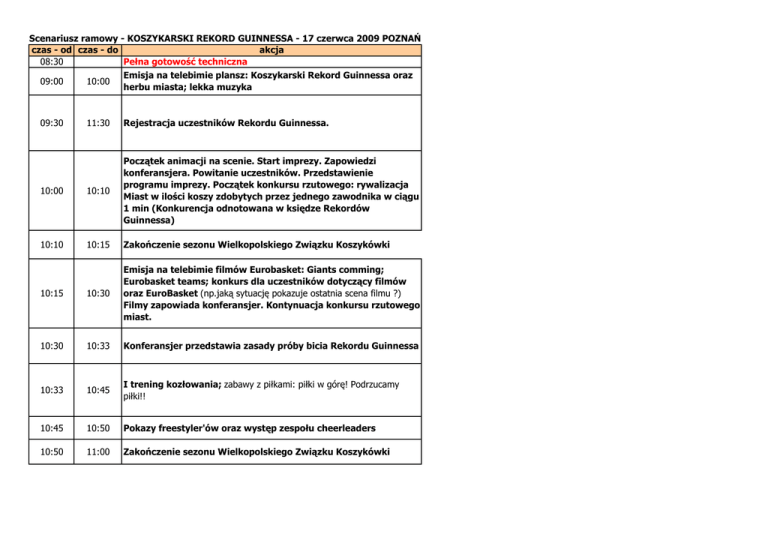 Scenariusz ramowy - KOSZYKARSKI REKORD GUINNESSA - 17 czerwca 2009 POZNAŃ czas - od czas - do akcja 08:30 Pełna gotowość techniczna Emisja na telebimie plansz: Koszykarski Rekord Guinnessa oraz 09:00 10:00 herbu miasta; lekka muzyka 09:30 11:30 Rejestracja uczestników Rekordu Guinnessa. 10:00 10:10 Początek animacji na scenie. Start imprezy. Zapowiedzi konferansjera. Powitanie uczestników. Przedstawienie programu imprezy. Początek konkursu rzutowego: rywalizacja Miast w ilości koszy zdobytych przez jednego zawodnika w ciągu 1 min (Konkurencja odnotowana w księdze Rekordów Guinnessa) 10:10 10:15 Zakończenie sezonu Wielkopolskiego Związku Koszykówki 10:15 10:30 Emisja na telebimie filmów Eurobasket: Giants comming; Eurobasket teams; konkurs dla uczestników dotyczący filmów oraz EuroBasket (np.jaką sytuację pokazuje ostatnia scena filmu ?) Filmy zapowiada konferansjer. Kontynuacja konkursu rzutowego miast. 10:30 10:33 Konferansjer przedstawia zasady próby bicia Rekordu Guinnessa 10:33 10:45 I trening kozłowania; zabawy z piłkami: piłki w górę! Podrzucamy piłki!! 10:45 10:50 Pokazy freestyler'ów oraz występ zespołu cheerleaders 10:50 11:00 Zakończenie sezonu Wielkopolskiego Związku Koszykówki 11:00 11:05 Trening skandowania: konferansjer: EuroBasket - Polska!!! uczestnicy: Warszawa 2009 !!!) oraz Zakończenie sezonu Wielkopolskiego Związku Koszykówki 11:05 11:35 Występ zespołu Norbi; Konferansjer przedstawia zespół - krótka wizytówka 11:35 11:40 II trening kozłowania 11:40 11:50 Występ freestylerów; zamknięcie Koszykarskiego konkursu miast. Ogłoszenie wyników z miast i ogłoszenie zwycięzcy. 11:50 11:55 Zakończenie sezonu Wielkopolskiego Związku Koszykówki 11:55 12:05 Zakończenie sezonu Wielkopolskiego Związku Koszykówki Mistrzowie Polski 12:05 12:20 Prezentacja na scenie gości specjalnych Rekordu Guinnessa (znani sportowcy, politycy, artyści). Krótkie wywiady z kaŜdą osobą. Goście mówią do uczestników kilka zdań (np.Witam Was! Cieszę się, Ŝe mogę wspólnie z wami uczestniczyć w tej wielkiej akcji!!!). 12:20 12:30 Trening kozłowania - ostatnia próba przed rekordem 12:30 12:35 Zapowiedź wejścia na ogólnopolską antenę telewizyjną TVP Info oraz występ zespołu cheerleaders. Przygotowanie do wejścia na wizję TVP. 12:35 12.42 12:44 Łączenie się miast na antenie TVP Info : zgłaszanie gotowości do Rekordu Guinnessa. Przygotowanie do Próby bicia Rekordu Guinnessa. 11,44:30 – , jingiel startowy z zegarem do startu 12:45 12:50 Próba pobicia Rekordu Guinnessa 12:50 12:55 Podsumowanie akcji: wystąpienia prezydenta, gwiazd sportu 13:55 Podsumowanie wyników Rekordu (konferansjer) - zakończenie imprezy - zaproszenie na Mistrzostwa EuroBasket 2009; New Champion comming soon…THE END