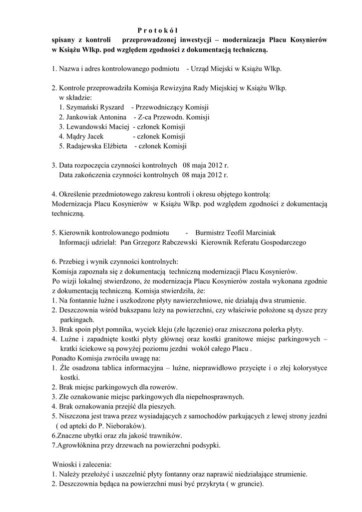 Protokół spisany z kontroli przeprowadzonej inwestycji – modernizacja Placu Kosynierów w Książu Wlkp. pod względem zgodności z dokumentacją techniczną. 1. Nazwa i adres kontrolowanego podmiotu - Urząd Miejski w Książu Wlkp. 2. Kontrole przeprowadziła Komisja Rewizyjna Rady Miejskiej w Książu Wlkp. w składzie: 1. Szymański Ryszard - Przewodniczący Komisji 2. Jankowiak Antonina - Z-ca Przewodn. Komisji 3. Lewandowski Maciej - członek Komisji 4. Mądry Jacek - członek Komisji 5. Radajewska Elżbieta - członek Komisji 3. Data rozpoczęcia czynności kontrolnych 08 maja 2012 r. Data zakończenia czynności kontrolnych 08 maja 2012 r. 4. Określenie przedmiotowego zakresu kontroli i okresu objętego kontrolą: Modernizacja Placu Kosynierów w Książu Wlkp. pod względem zgodności z dokumentacją techniczną. 5. Kierownik kontrolowanego podmiotu - Burmistrz Teofil Marciniak Informacji udzielał: Pan Grzegorz Rabczewski Kierownik Referatu Gospodarczego 6. Przebieg i wynik czynności kontrolnych: Komisja zapoznała się z dokumentacją techniczną modernizacji Placu Kosynierów. Po wizji lokalnej stwierdzono, że modernizacja Placu Kosynierów została wykonana zgodnie z dokumentacją techniczną. Komisja stwierdziła, że: 1. Na fontannie luźne i uszkodzone płyty nawierzchniowe, nie działają dwa strumienie. 2. Deszczownia wśród bukszpanu leży na powierzchni, czy właściwie położone są dysze przy parkingach. 3. Brak spoin płyt pomnika, wyciek kleju (złe łączenie) oraz zniszczona polerka płyty. 4. Luźne i zapadnięte kostki płyty głównej oraz kostki granitowe miejsc parkingowych – kratki ściekowe są powyżej poziomu jezdni wokół całego Placu . Ponadto Komisja zwróciła uwagę na: 1. Źle osadzona tablica informacyjna – luźne, nieprawidłowo przycięte i o złej kolorystyce kostki. 2. Brak miejsc parkingowych dla rowerów. 3. Złe oznakowanie miejsc parkingowych dla niepełnosprawnych. 4. Brak oznakowania przejść dla pieszych. 5. Niszczona jest trawa przez wysiadających z samochodów parkujących z lewej strony jezdni ( od apteki do P. Nieboraków). 6.Znaczne ubytki oraz zła jakość trawników. 7.Agrowłóknina przy drzewach na powierzchni podsypki. Wnioski i zalecenia: 1. Należy przełożyć i uszczelnić płyty fontanny oraz naprawić niedziałające strumienie. 2. Deszczownia będąca na powierzchni musi być przykryta ( w gruncie). 3. Należy na nowo ułożyć płyty pomnika bez szczelin, wymienić uszkodzoną płytę. 4. Przełożyć i uszczelnić kostkę płyty głównej i miejsc parkingowych oraz właściwie i estetycznie osadzić tablicę informacyjną. 5. Wyznaczyć miejsca i zamontować stojaki dla rowerów. 6. Właściwie oznakować (zgodnie z przepisami) miejsca parkingowe dla niepełnosprawnych. 7. Przenieść miejsca parkingowe (od apteki do P. Nieboraków) na prawą stronę jezdni oraz oznakować przejścia dla pieszych na całym placu. 8. Doprowadzić trawniki do właściwego stanu (wsiewka lub nowy siew). 9. Oznaczyć płytę główna placu zakazem wprowadzania psów. Książ Wlkp. 08 maja 2012 r. Podpisy członków Komisji 1. .................................................. 2. .................................................. ................................................................... /podpis kierownika kontrolowanego podmiotu/ 3. .................................................. 4. .................................................. 5. ..................................................