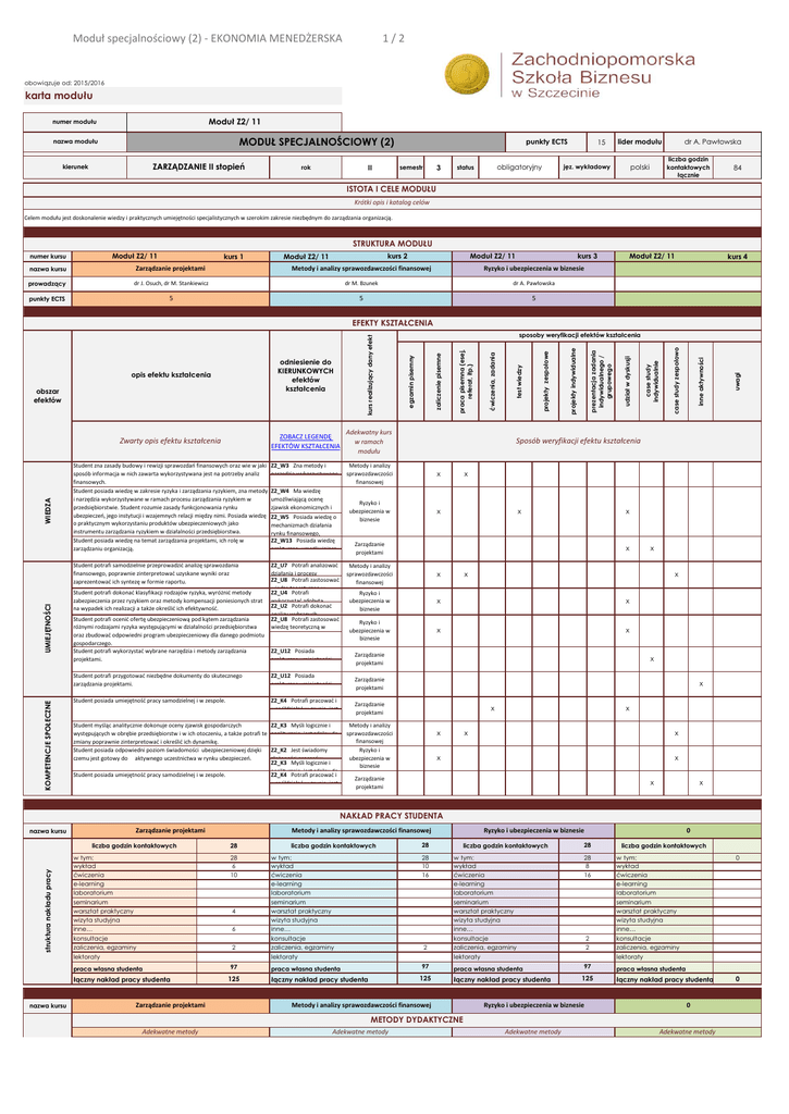 Moduł specjalnościowy (2) - EKONOMIA MENEDŻERSKA 1/2 obowiązuje od: 2015/2016 karta modułu Moduł Z2/ 11 numer modułu MODUŁ SPECJALNOŚCIOWY (2) nazwa modułu ZARZĄDZANIE II stopień kierunek II rok punkty ECTS 3 semestr obligatoryjny status 15 lider modułu polski jęz. wykładowy dr A. Pawłowska liczba godzin kontaktowych łącznie 84 ISTOTA I CELE MODUŁU Krótki opis i katalog celów Celem modułu jest doskonalenie wiedzy i praktycznych umiejętności specjalistycznych w szerokim zakresie niezbędnym do zarządzania organizacją. STRUKTURA MODUŁU Moduł Z2/ 11 numer kursu kurs 1 kurs 2 Moduł Z2/ 11 Moduł Z2/ 11 kurs 3 nazwa kursu Zarządzanie projektami Metody i analizy sprawozdawczości finansowej Ryzyko i ubezpieczenia w biznesie prowadzący dr J. Osuch, dr M. Stankiewicz dr M. Bzunek dr A. Pawłowska punkty ECTS 5 5 5 Moduł Z2/ 11 kurs 4 WIEDZA UMIEJĘTNOŚCI KOMPETENCJE SPOŁECZNE Student zna zasady budowy i rewizji sprawozdań finansowych oraz wie w jaki sposób informacja w nich zawarta wykorzystywana jest na potrzeby analiz finansowych. Student posiada wiedzę w zakresie ryzyka i zarządzania ryzykiem, zna metody i narzędzia wykorzystywane w ramach procesu zarządzania ryzykiem w przedsiębiorstwie. Student rozumie zasady funkcjonowania rynku ubezpieczeń, jego instytucji i wzajemnych relacji między nimi. Posiada wiedzę o praktycznym wykorzystaniu produktów ubezpieczeniowych jako instrumentu zarządzania ryzykiem w działalności przedsiębiorstwa. Student posiada wiedzę na temat zarządzania projektami, ich rolę w zarządzaniu organizacją. Z2_W3 Zna metody i narzędzia wykorzystywane Student potrafi samodzielnie przeprowadzić analizę sprawozdania finansowego, poprawnie zinterpretować uzyskane wyniki oraz zaprezentować ich syntezę w formie raportu. Z2_U7 Potrafi analizować działania i procesy Z2_U8 Potrafi zastosować wiedzę teoretyczną w Z2_U4 Potrafi wykorzystać zdobytą Z2_U2 Potrafi dokonać analizy wybranych Z2_U8 Potrafi zastosować wiedzę teoretyczną w określonym obszarze Student potrafi dokonać klasyfikacji rodzajów ryzyka, wyróżnić metody zabezpieczenia przez ryzykiem oraz metody kompensacji poniesionych strat na wypadek ich realizacji a także określić ich efektywność. Student potrafi ocenić ofertę ubezpieczeniową pod kątem zarządzania różnymi rodzajami ryzyka występującymi w działalności przedsiębiorstwa oraz zbudować odpowiedni program ubezpieczeniowy dla danego podmiotu gospodarczego. Student potrafi wykorzystać wybrane narzędzia i metody zarządzania projektami. Z2_W4 Ma wiedzę umożliwiającą ocenę zjawisk ekonomicznych i powiązań międzywiedzę o Z2_W5 Posiada mechanizmach działania rynku finansowego, Z2_W13 Posiada wiedzę praktyczną, umożliwiającą Z2_U12 Posiada praktyczne umiejętności, Student posiada umiejętność pracy samodzielnej i w zespole. Z2_K4 Potrafi pracować i współdziałać w grupie, jest Student myśląc analitycznie dokonuje oceny zjawisk gospodarczych występujących w obrębie przedsiębiorstw i w ich otoczeniu, a także potrafi te zmiany poprawnie zinterpretować i określić ich dynamikę. Student posiada odpowiedni poziom świadomości ubezpieczeniowej dzięki czemu jest gotowy do aktywnego uczestnictwa w rynku ubezpieczeń. Z2_K3 Myśli logicznie i analitycznie, jest zdolny do Student posiada umiejętność pracy samodzielnej i w zespole. Metody i analizy sprawozdawczości finansowej x Ryzyko i ubezpieczenia w biznesie x x x x x Metody i analizy sprawozdawczości finansowej x Ryzyko i ubezpieczenia w biznesie x x Ryzyko i ubezpieczenia w biznesie x x x x x Zarządzanie projektami x Zarządzanie projektami x Zarządzanie projektami x Metody i analizy sprawozdawczości finansowej Ryzyko i ubezpieczenia w biznesie Z2_K2 Jest świadomy złożoności procesów Z2_K3 Myśli logicznie i analitycznie, jest zdolny do Z2_K4 Potrafi pracować i współdziałać w grupie, jest uwagi inne aktywności case study zespołowo case study indywidualnie udział w dyskusji prezentacja zadania indywidualnego / grupowego projekty indywidualne projekty zespołowe Sposób weryfikacji efektu kształcenia Zarządzanie projektami Z2_U12 Posiada praktyczne umiejętności, Student potrafi przygotować niezbędne dokumenty do skutecznego zarządzania projektami. test wiedzy Adekwatny kurs w ramach modułu ćwiczenia, zadania ZOBACZ LEGENDĘ EFEKTÓW KSZTAŁCENIA praca pisemna (esej, referat, itp.) Zwarty opis efektu kształcenia obszar efektów zaliczenie pisemne odniesienie do KIERUNKOWYCH efektów kształcenia sposoby weryfikacji efektów kształcenia egzamin pisemny opis efektu kształcenia kurs realizujący dany efekt EFEKTY KSZTAŁCENIA x x x x x x Zarządzanie projektami x x NAKŁAD PRACY STUDENTA nazwa kursu Zarządzanie projektami struktura nakładu pracy liczba godzin kontaktowych w tym: wykład ćwiczenia e-learning laboratorium seminarium warsztat praktyczny wizyta studyjna inne… konsultacje zaliczenia, egzaminy Metody i analizy sprawozdawczości finansowej 28 28 6 10 4 6 2 lektoraty w tym: wykład ćwiczenia e-learning laboratorium seminarium warsztat praktyczny wizyta studyjna inne… konsultacje zaliczenia, egzaminy 28 28 10 16 2 lektoraty praca własna studenta łączny nakład pracy studenta nazwa kursu liczba godzin kontaktowych Zarządzanie projektami 97 125 Ryzyko i ubezpieczenia w biznesie liczba godzin kontaktowych w tym: wykład ćwiczenia e-learning laboratorium seminarium warsztat praktyczny wizyta studyjna inne… konsultacje zaliczenia, egzaminy 0 28 28 8 16 2 2 lektoraty 97 praca własna studenta 125 łączny nakład pracy studenta w tym: wykład ćwiczenia e-learning laboratorium seminarium warsztat praktyczny wizyta studyjna inne… konsultacje zaliczenia, egzaminy 0 lektoraty praca własna studenta łączny nakład pracy studenta Metody i analizy sprawozdawczości finansowej liczba godzin kontaktowych 97 125 praca własna studenta łączny nakład pracy studenta Ryz