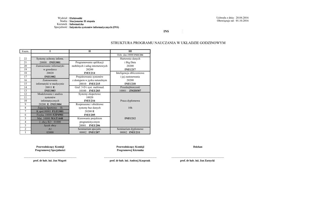 Wydział : Studia : Kierunek : Specjalność : Uchwała z dnia: 20.04.2016 Obowiązuje od: 01.10.2016 Elektroniki Stacjonarne II stopnia Informatyka Inżynieria systemów informatycznych (INS) INS STRUKTURA PROGRAMU NAUCZANIA W UKŁADZIE GODZINOWYM h\sem. I II III Ochr. dan.10000 INEU204 22 21 20 19 18 17 16 15 14 13 12 11 10 9 8 7 6 5 4 3 2 1 Systemy ochrony inform. 20000 INEU001 Zastosowanie informatyki w gosodarce 20020 INEU002 Zastosowanie informatyki w medycynie 20011 E INEU003 Modelowanie i analiza systemów informatycznych 20200 E INEU004 Zajęcia Sportowe 1h K.społ.00001 FLEU001 Fizyka 10000 FZP4901 Mat. 10000 MAT1440 J. obcy B2+ 01000 Język obcy A1 03000 Programowanie apilikacji mobilnych i usług internetowych 20200 INEU214 Projektowanie systemów z dostępem w jęzku naturalnym 20010 INEU215 Graf. 3-D i syst. multimed. 10100 INEU203 Systemy ekspertowe 10020 INEU216 Rozproszone i obiektowe systemy baz danych 20200 E INEU205 Kierowanie projektem programistycznym 20001 INEU206 Seminarium specjaln. 00002 INEU207 Hurtownie danych i Big Data 20200 INEU217 Inteligencja obliczeniowa i jej zastosowania 20200 INEU218 Przedsiębiorczość 10001 ZMZ0387 Praca dyplomowa 10h INEU212 Seminarium dyplomowe 00002 INEU211 Przewodniczący Komisji Programowej Specjalności Przewodniczący Komisji Programowej Kierunku Dziekan .................................................................. .................................................................. .................................................................. prof. dr hab. inż. Jan Magott prof. dr hab. inż. Andrzej Kasprzak prof. dr hab. inż. Jan Zarzycki Wydział : Studia : Kierunek : Specjalność : Uchwała z dnia: 20.04.2016 Obowiązuje od: 01.10.2016 Elektroniki Stacjonarne II stopnia Informatyka Inżynieria systemów informatycznych (INS) INS STRUKTURA PROGRAMU NAUCZANIA W UKŁADZIE PUNKTOWYM ECTS\ sem. 30 29 28 27 26 25 24 23 22 21 20 19 18 17 16 15 14 13 12 11 10 9 8 7 6 5 4 3 2 1 I II III Systemy ochrony informacji 2 Programowanie aplikacji mobilnych i usług internetowych 5 Systemy ekspertowe 4 Ochrona danych 2 Zastosowanie informatyki w gospodarce 6 Zastosowanie informatyki w medycynie 7 Modelowanie i analiza systemów informatycznych 7 Zajęcia sportowe 1 Komunikacja społeczna 2 Fizyka 1 Matematyka 1 Język obcy B2+ 1 Język obcy A1 2 Hurtownie danych i Big Data 4 Projektowanie systemów z dostępem w języku naturalnym 5 Grafika 3-D i systemy multimedialne 3 Rozproszone i obiektowe systemy baz danych 6 Inteligencja obliczeniowa i jej zastosowania 6 Przedsiębiorczość 3 Praca dyplomowa 12 Kierowanie projektem programistycznym 5 Seminarium specjaln. 2 Seminarium dyplomowe 3 Przewodniczący Komisji Programowej Specjalności Przewodniczący Komisji Programowej Kierunku Dziekan .................................................................. .................................................................. .................................................................. prof. dr hab. inż. Jan Magott prof. dr hab. inż. Andrzej Kasprzak prof. dr hab. inż. Jan Zarzycki