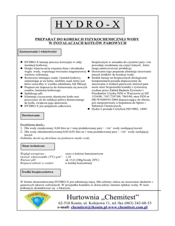 HYDRO-X PREPARAT DO KOREKCJI FIZYKOCHEMICZNEJ WODY W INSTALACJACH KOTŁÓW PAROWYCH Zastosowanie i właściwości HYDRO-X hamuje procesy korozyjne w całej instalacji kotłowej. Dzięki właściwością wiązania tlenu i dwutlenku węgla wody, wspomaga tworzenie magnetytowej warstwy ochronnej. Roztwarza istniejące osady i kamień kotłowy, zamieniając je na luźny, mobilny osad, który jest łatwo usuwalny w wyniku odmulania, lub filtracji. Preparat nie dopuszcza do formowania się nowych osadów, kamienia kotłowego. Stabilizuje pH. Eliminuje czyszczenie chemiczne kotła oraz przyczynia sie do redukcji paliwa dostarczanego do kotła, zwiększa jego sprawność. HYDRO-X jest prepartem całkowicie bezpiecznym w stosunku do czystości pary i nie powoduje uwalniania się części lotnych , które mogą zanieczyszczać produkcję. Dozowanie tego preparatu eliminuje stosowanie innych środków do korekcji wody. Środek bazuje na bezpiecznych ekologicznie komponentach posiada dopuszczenie do stosowania w kotłach parowych, których para może mieć bezpośredni kontakt z żywnością wydane przez Zakład Badania Żywności i Przedmitów Użytku PZH w Warszawie nr HŻ 1534/00, 7107,7397/00, 7865/00, atest PZH nr HK/W/0489/01/2004 dopuszczający do obrotu, jest zarejestrowany u Inspektora do Spraw i Substacji Chemicznych. Hydro-x posiada Certyficat ISO 9002, 14001 Dawkowanie Przybliżone dawki : 1. Dla wody zmiękczonej: 0,04 litra na 1 tonę produkowanej pary / ~1m3 wody zasilającej kocioł. 2. Dla wody zdemineralizowanej:0,02-0,03 litra na 1 tonę produkowanej pary / ~1m3 wody zasilającej kocioł. Dokładne dawki są określane na podstawie analiz wody. Dane techniczne Wygląd zewnętrzny : Gestość właściwa(dla 250C) g/m3 : Wartosć pH: Rozpuszczalność w wodzie: ciecz o kolorze bursztynowym 1,18 ok 13,8 (100g/lwody 200C) w każdej koncentracji Środki bezpieczeństwa W formie skoncentrowanej HYDRO-X jest substancją żrącą. Dla ochrony zaleca sie stosowanie okularów i gumowych rękawic ochronnych. W przypadku kontaktu ze skórą należy starnnie spłukać wodą. W razie połknięcia skontaktować się z lekarzem. Hurtownia „Chemitest” 62-510 Konin, ul. Kolejowa 11, tel./fax (063) 242-68-53 e-mail: [email protected],www.chemitest.com.pl