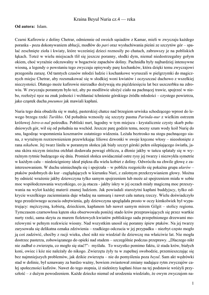 Kraina Beyul Nuria cz.4 — reka Od autora: Islam. Czarni Kafirowie z doliny Chetrar, odmiennie od swoich sąsiadów z Kamar, mieli w zwyczaju każdego poranka - poza dokonywaniem ablucji, modłów do pari oraz wysłuchiwania pieśni ze szczytów gór – spalać zeschnięte zioła i kwiaty, które wcześniej dzieci roznosiły po chatach, zabrawszy je na pobliskich łąkach. Toteż w wielu miejscach tlił się jeszcze poranny, słodki dym, niemal niedostrzegalny gołym okiem, choć wyraźnie odczuwalny w bogactwie zapachów doliny. Pachnidła były najbardziej intensywne wiosną, a legendy o powstaniu tego zwyczaju opisywały parę kochanków, która dzięki temu zwyczajowi przegoniła zarazę. Od tamtych czasów młodzi ludzie i kochankowe wyruszali w pielgrzymki do magicznych miejsc Chetrar, aby rozsmakować się w słodkiej woni kwiatów i oczyszczać duchowo z wszelkiej nieczystości. Dlatego może kafirowie nierzadko dożywają stu pięćdziesięciu lat bez uszczerbku na zdrowiu. W zwyczaju porannym było też, aby po modlitwie ułożyć ciało na pachnącej trawie, spojrzeć w niebo, rozłożyć ręce na znak jedności i wchłaniać tchnienie górskiego źródła młodości – czystego powietrza, jako cząstek ducha pneumos jak mawiali kapłani. Nuria tego dnia obudziła się w małej, pasterskiej chatce nad brzegiem urwiska schodzącego wprost do lewego brzegu rzeki Turikho. Od południa wznosiły się szczyty pasma Parinda-nur z wielkim ostrzem królowej Istro-o-nal pośrodku. Pobliski nurt, łagodny w tym miejscu - krystalicznie czysty skarb południowych gór, wił się od południa na wschód. Jeszcze parę godzin temu, nocny szum wody koił Nurię do snu, łagodząc wspomnienia koszmarów ostatniego widzenia. Leżała beztrosko na stogu pachnącego siana, z wyraźnym rozrzewnieniem przewlekając liliowe dzwonki w swoje kręcone włosy – nieosłonięte z rana nikabem. Jej twarz lśniła w porannym słońcu jak biały szczyt górski pełen oślepiającego światła, jasna skóra niczym śnieżna otchłań dodawała powagi obliczu, a dłonie jakby w tańcu splatały się w wyraźnym rytmie budzącego się dnia. Promień słońca uwidaczniał ostre rysy jej twarzy i niezwykła symetrie w każdym calu – niedościgniony ideał piękna dla wielu kobiet z doliny. Odwróciła na chwile głowę z zainteresowaniem. W duchu uśmiechnęła się i spojrzała – w pobliżu rozgościło się pokaźna grupa ułarów – ptaków podobnych do kur –zaglądających w kierunku Nuri, z zalotnym przekrzywianiem głowy. Można by odnieść wrażenie jakby dziewczyna tylko samym spojrzeniem lub może aż spojrzeniem miała w sobie moc współodczuwania wszystkiego, co ją otacza - jakby iskry w jej oczach miały magiczną moc przeszywania na wylot każdej materii znanej ludziom. Jak powiadali starożytni kapłani buddyjscy, tylko odkrycie wszelkiego zaciemniania daje władzę na samsarą i nawet cała naturą rzeczy. Wielu doświadczyło tego przedziwnego uczucia odrętwienia, gdy dziewczyna spoglądała prosto w oczy kimkolwiek był wypatrujący: mężczyzną, kobietą, dzieckiem, kapłanem lub nawet samym mirem Gilgit – stolicy regionu. Tymczasem czarnowłosa kątem oka obserwowała poniżej stado krów przeprawiających się przez wartkie nurty rzeki, sama skryta za murem fioletowych kwiatów pobliskiego sadu przepełnionego drzewami morelowymi w pełnym rozkwicie wiosny. Nad wszystkim unosił się poranny śpiew ptaków. Na jej twarzy zarysowała się delikatna oznaka zdziwienia – rzadkiego odczucia w jej przypadku – niezbyt często mogło ją coś zadziwić, choćby z racji wieku, choć nikt nie wiedział ile dziewczę ma właściwie lat. Nie mogła dostrzec pasterza, zobowiązanego do opieki nad stadem – szczególnie podczas przeprawy. „Dlaczego nikt nie zadbał o zwierzęta, co mogło się stać?”- myślała. To wszystko pomimo faktu, iż stada krów, białych koni, owiec i kóz nie należały do nikogo. Zwierzęta żyły tu w zupełnej swobodzie, przemieszczając się bez najmniejszych problemów, jak dzikie zwierzęta – nie do pomyślenia poza beyul. Sam akt wędrówki stad w dolinie, był uznawany za bardzo ważny, bowiem zwiastował zmiany nadające rytm zwyczajów całej społeczności kafirów. Nawet do tego stopnia, iż niektórzy kapłani bitan na tej podstawie wróżyli przyszłość – z dużym powodzeniem. Każde dziecko niemal od urodzenia wiedziało, że owym zwyczajom na1 leży się szacunek i oddanie, będąc przekonanym, iż w każdym z tych zwierząt mogą mieszkać pradawni ich przodkowie. Dlatego ów brak pasterza wydał się jej tym bardziej zwiastunem nadchodzącej zmiany, nieoczekiwanej zawieruchy, czasów ostatecznych lub może gorszych rzeczy, o których jej się nie śniło. Krótko rozważyła w myślach jak bardzo może to rozgniewać Warendre i Gyisa – bogów chroniących bydło. Tymczasem wilgotne i chłodne powietrze poranka przepełnione zapachem siana, spływało z gór w cieplejsze parowy, drążąc zalotnie doliny pogrążane jeszcze w mroku – a to wszystko na powitanie dnia jakby na życzenie. Mierząc się z majestatem gór, dziewczyna nabrawszy głęboko powietrza do płuc, zmrużyła delikatnie oczy w ekstazie. Przywykła do zwyczaju, gdy chłonie niewidzialne piękno do swego wnętrza, w dreszczu emocji wypełniając się najdrobniejszą nutą melodii życia – granej może przez niewidzialnych pari sekretnie wzdłuż ciągnących się rajskich dolin rzeki Turikho – czuła się szczęśliwa. Była wszak wyrocznią, nie tylko w oczach ludzi z dolin, ale i wobec samej siebie. Nuria rzadko zbliżała się do osad ludzkich, jako że jej nizaryckie pochodzenie, nikab skrywający twarz, odróżniał ją od innych, nieufnych i podejrzliwych spojrzeń niepozbawionych jednak szacunku i swoistego lęku. Nizaryci byli bardzo starym odłamem ismailitów, wywodzący się od imama Nizara, syna Al-Afdala. Legendy o nich wiodą do górskiej t