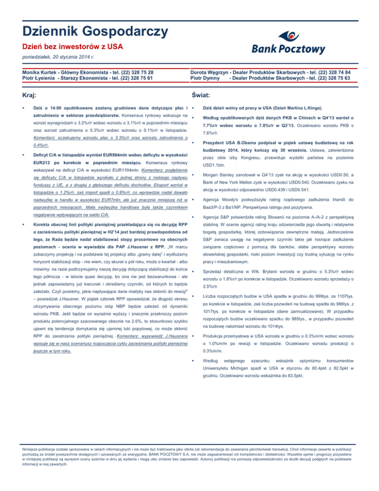 Dziennik Gospodarczy Dzień bez inwestorów z USA poniedziałek, 20 stycznia 2014 r. Monika Kurtek - Główny Ekonomista - tel. (22) 328 75 28 Piotr Łysienia - Starszy Ekonomista - tel. (22) 328 75 61 Dorota Węgrzyn - Dealer Produktów Skarbowych - tel. (22) 328 74 84 Piotr Dymny - Dealer Produktów Skarbowych - tel. (22) 328 75 63 Kraj: Świat: Dziś o 14:00 opublikowane zostaną grudniowe dane dotyczące płac i zatrudnienia w sektorze przedsiębiorstw. Konsensus rynkowy wskazuje na wzrost wynagrodzeń o 3.2%r/r wobec wzrostu o 3.1%r/r w poprzednim miesiącu Dziś dzień wolny od pracy w USA (Dzień Martina L.Kinga). Według opublikowanych dziś danych PKB w Chinach w Q4’13 wzrósł o 7.7%r/r wobec wzrostu o 7.8%r/r w Q3’13. Oczekiwano wzrostu PKB o oraz wzrost zatrudnienia o 0.3%r/r wobec wzrostu o 0.1%r/r w listopadzie. 7.6%r/r. Komentarz: oczekujemy wzrostu płac o 3.3%r/r oraz wzrostu zatrudnienia o 0.4%r/r. Prezydent USA B.Obama podpisał w piątek ustawę budżetową na rok budżetowy 2014, który kończy się 30 września. Ustawa, zatwierdzona Deficyt C/A w listopadzie wyniósł EUR984mln wobec deficytu w wysokości EUR213 po korekcie w poprzednim przez obie izby Kongresu, przewiduje wydatki państwa na poziomie miesiącu. Konsensus rynkowy USD1.1bln. wskazywał na deficyt C/A w wysokości EUR1104mln. Komentarz: pogłębienie się deficytu C/A w listopadzie wynikało z jednej strony z niskiego napływu Bank of New York Mellon zysk w wysokości USD0.540. Oczekiwano zysku na funduszy z UE, a z drugiej z głębszego deficytu dochodów. Eksport wzrósł w akcję w wysokości odpowiednio USD0.439 i USD0.541. listopadzie o 1.2%r/r, zaś import spadł o 0.8%r/r, co wprawdzie nadal dawało nadwyżkę w handlu w wysokości EUR7mln, ale już znacznie mniejszą niż w poprzednich miesiącach. Mała nadwyżka handlowa była także czynnikiem negatywnie wpływającym na saldo C/A. Morgan Stanley zanotował w Q4’13 zysk na akcję w wysokości USD0.50, a Agencja Moody's podwyższyła rating rządowego zadłużenia Irlandii do Baa3/P-3 z Ba1/NP. Perspektywa ratingu jest pozytywna. Agencja S&P potwierdziła rating Słowenii na poziomie A-/A-2 z perspektywą Korekta obecnej linii polityki pieniężnej przekładająca się na decyzję RPP stabilną. W ocenie agencji rating kraju odzwierciedla jego otwartą i relatywnie o zacieśnieniu polityki pieniężnej w H2’14 jest bardziej prawdopodobna od bogatą gospodarkę, której zobowiązania zewnętrzne maleją. Jednocześnie tego, że Rada będzie nadal stabilizować stopy procentowe na obecnych S&P zwraca uwagę na negatywne czynniki takie jak rosnące zadłużenie poziomach - ocenia w wywiadzie dla PAP J.Hausner z RPP. „W marcu związane częściowo z pomocą dla banków, słabe perspektywy wzrostu zobaczymy projekcję i na podstawie tej projekcji albo „gramy dalej” i wydłużamy słoweńskiej gospodarki, niski poziom inwestycji czy trudną sytuację na rynku horyzont stabilizacji stóp - nie wiem, czy akurat o pół roku, może o kwartał - albo pracy i mieszkaniowym. mówimy: na razie podtrzymujemy naszą decyzję dotyczącą stabilizacji do końca tego półrocza - w istocie quasi decyzję, bo ona nie jest bezwarunkowa - ale Sprzedaż detaliczna w Wlk. Brytanii wzrosła w grudniu o 5.3%r/r wobec wzrostu o 1.8%r/r po korekcie w listopadzie. Oczekiwano wzrostu sprzedaży o jednak zapowiadamy już kierunek i określamy czynniki, od których to będzie 2.5%r/r. zależało. Czyli powiemy, jakie napływające dane miałyby nas skłonić do rewizji" – powiedział J.Hausner. W piątek członek RPP opowiedział, że długość okresu po korekcie w listopadzie, zaś liczba pozwoleń na budowę spadła do 986tys. z utrzymywania obecnego poziomu stóp NBP będzie zależeć od dynamiki 1017tys. po korekcie w listopadzie (dane zannualizowane). W przypadku wzrostu PKB. Jeśli będzie on wyraźnie wyższy i znacznie przekroczy poziom rozpoczętych budów oczekiwano spadku do 985tys., w przypadku pozwoleń produktu potencjalnego szacowanego obecnie na 2.6%, to stosunkowo szybko na budowę natomiast wzrostu do 1014tys. ujawni się tendencja domykania się ujemnej luki popytowej, co może skłonić RPP do zaostrzenia polityki pieniężnej. Komentarz: wypowiedź J.Hausnera Liczba rozpoczętych budów w USA spadła w grudniu do 999tys. ze 1107tys. Produkcja przemysłowa w USA wzrosła w grudniu o 0.3%m/m wobec wzrostu wpisuje się w nasz scenariusz rozpoczęcia cyklu zacieśniania polityki pieniężnej o 1.0%m/m po rewizji w listopadzie. Oczekiwano wzrostu produkcji o jeszcze w tym roku. 0.3%m/m. Według wstępnego szacunku wskaźnik optymizmu konsumentów Uniwersytetu Michigan spadł w USA w styczniu do 80.4pkt z 82.5pkt w grudniu. Oczekiwano wzrostu wskaźnika do 83.5pkt. Niniejsza publikacja została opracowana w celach informacyjnych i nie może być traktowana jako oferta lub rekomendacja do zawierania jakichkolwiek transakcji. Choć informacje zawarte w publikacji pochodzą ze źródeł powszechnie dostępnych i uznawanych za wiarygodne, BANK POCZTOWY S.A. nie może zagwarantować ich kompletności i dokładności. Wszelkie opinie i prognozy przywołane w niniejszej publikacji są wyrazem oceny autorów w dniu jej wydania i mogą ulec zmianie bez zapowiedzi. Autorzy publikacji ni e ponoszą odpowiedzialności za skutki decyzji podjętych na podstawie informacji w niej zawartych. RYNEK FX/FI Rynek walutowy (FX) Dane Rynkowe Po otwarciu na poziomie 4.1688/EUR złoty w pierwszej części piątkowej sesji umocnił się w kierunku Rynek FX Kurs zamkn. 1D zm YTD 4.1560/EUR, jednak w drugiej części sesji wytracił zyski i ostatecznie zakończył dzień na poziomie 4.1645/EUR EUR-PLN 4,1645 0,00 0,01 oraz 3.0753/USD. Krajowe dane dotyczące bilansu obrotów bieżących okazały się zbliżone do oczekiwań USD-PLN 3,0753 0,02 0,06 rynkowych i nie miały większego wpływu na notowania PLN. Mieszane dane z amerykańskiego rynku CHF-PLN EUR-USD 3,3787