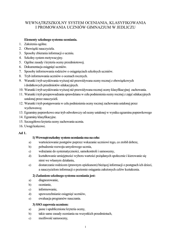 WEWNĄTRZSZKOLNY SYSTEM OCENIANIA, KLASYFIKOWANIA I PROMOWANIA UCZNIÓW GIMNAZJUM W JEDLICZU Elementy szkolnego systemu oceniania. 1. Założenia ogólne. 2. Obowiązki nauczyciela. 3. Sposoby zbierania informacji o uczniu. 4. Szkolny system motywacyjny. 5. Ogólne zasady i kryteria oceny przedmiotowej. 6. Dokumentacja osiągnięć uczniów. 7. Sposoby informowania rodziców o osiągnięciach szkolnych uczniów. 8. Tryb informowania uczniów o ocenach rocznych. 9. Warunki i tryb uzyskiwania wyższej niż przewidywana oceny rocznej z obowiązkowych i dodatkowych przedmiotów edukacyjnych. 10. Warunki i tryb uzyskiwania wyższej niż przewidywana rocznej oceny klasyfikacyjnej zachowania. 11. Warunki i tryb przeprowadzania sprawdzianu w celu podniesienia oceny rocznej z zajęć edukacyjnych ustalonej przez nauczycieli. 12. Warunki i tryb postępowania w celu podniesienia oceny rocznej zachowania ustalonej przez wychowawcę. 13. Egzaminy poprawkowe oraz tryb odwoławczy od oceny ustalonej w wyniku egzaminu poprawkowego 14. Egzaminy klasyfikacyjne. 15. Szczegółowe kryteria oceny zachowania ucznia. 16. Uwagi końcowe. Ad 1. 1) Wewnątrzszkolny system oceniania ma na celu: a) wartościowanie postępów poprzez wskazanie uczniowi tego, co zrobił dobrze, b) pobudzenie rozwoju umysłowego ucznia, c) wdrażanie do systematyczności, samokontroli i samooceny, d) kształtowanie umiejętności wyboru wartości pożądanych społecznie i kierowanie się nimi we własnym działaniu, e) dostarczanie rodzicom (prawnym opiekunom) bieżącej informacji o postępach ich dzieci, a nauczycielom informacji o poziomie osiągania założonych celów kształcenia. a) b) c) d) e) 2) Zadaniem szkolnego systemu oceniania jest: diagnozowanie, ocenianie, informowanie, upowszechnianie osiągnięć uczniów, ewaluacja programów nauczania. 3) SSO zapewnia uczniom: a) jasne i upublicznione kryteria oceny, b) takie same zasady oceniania na wszystkich przedmiotach, c) możliwość samooceny, 1 obiektywizm, wspieranie kreatywności w procesie uczenia się. 4) SSO zapewnia rodzicom: a) prostotę systemu, b) jawność kryteriów oceniania, c) możliwość częstej informacji zwrotnej o postępach ucznia. d) e) 5) SSO zapewnia nauczycielom: a) różnorodność źródeł informacji o uczniu, b) łatwość stosowanych metod, form i technik oceniania. Ad 2. Nauczyciel zobowiązany jest do: 1) zapoznania uczniów ze szkolnym systemem oceniania, 2) przedstawienia kryteriów oceny w sposób zrozumiały dla ucznia i jego rodzica (prawnego opiekuna), 3) stosowania różnorodnych form oceniania, 4) umożliwienia uczniom samooceny, 5) obiektywnej oceny, 6) ujawniania oceny uczniowi, rodzicom (prawnym opiekunom) i wskazania kierunku poprawy, 7) uzasadnienia ustalonej oceny w sposób określony w statucie, 8) udostępnienia do wglądu rodzicom (prawnym opiekunom) pisemnych prac ucznia bez możliwości kserowania. Ad 3. Zbieranie informacji o uczniu: 1) obserwacja ciągła na różnych płaszczyznach życia szkolnego, 2) rozmowy z rodzicami (prawnymi opiekunami), 3) samoocena, 4) indywidualna rozmowa z uczniem. Ad 4. 1. Konkursy i olimpiady (przedmiotowe, artystyczne, sportowe, związane z działalnością na rzecz środowiska). 2. System nagradzania: a) wyróżnienie na apelu, b) nagrody rzeczowe, c) dyplomy, d) tytuły nadawane uczniom, np. najlepszy chemik roku szkolnego, mistrz ortografii, e) wpisy do „Złotej Księgi” i „Księgi Szczególnych Osiągnięć”, f) listy gratulacyjne dla rodziców. Warunki przyznawania listów gratulacyjnych. List gratulacyjny otrzymują: a) rodzice uczniów klas III, którzy w trzyletnim cyklu kształcenia mieli wzorową ocenę zachowania, b) rodzice uczniów klas III, którzy mają zachowanie bardzo dobre lub wzorowe oraz szczególne 2 osiągnięcia typu: średnia z przedmiotów co najmniej 4,75 i co najmniej bardzo dobra ocena zachowania lub najlepiej zdany egzamin gimnazjalny lub najmniejsza liczba opuszczonych godzin lekcyjnych w ciągu trzech lat nauki w gimnazjum ze wszystkich uczniów klas trzecich danego rocznika lub laureat konkursu na szczeblu wojewódzkim lub wyższym. c) co roku rodzice, opiekunowie, dziadkowie, za zaangażowanie w życie szkoły: sponsor, juror, organizator imprez kulturalnych, czynny członek trójek klasowych. Rada pedagogiczna zastrzega sobie prawo przyznania takiego listu w innym szczególnym przypadku. Ad 5. 1) Rok szkolny dzieli się na dwa półrocza. Termin klasyfikacji śródrocznej i rocznej ustala się rokrocznie i podaje do publicznej wiadomości nie później niż w pierwszym tygodniu września. 2) Ocenianiu podlegają: a) osiągnięcia edukacyjne ucznia, b) zachowanie ucznia. 3) Oceniamy ucznia za: a) wiadomości, b) przyrost wiedzy, c) wkład pracy, d) umiejętności (praktyczne, komunikacyjne), e) zaangażowanie, f) systematyczność i pilność w nauce i wykonywaniu obowiązków szkolnych, g) własną twórczość, h) przestrzeganie norm współżycia społecznego i zasad kulturalnego zachowania. 4) Ocenianie bieżące z zajęć edukacyjnych ma na celu monitorowanie pracy ucznia oraz przekazywanie uczniowi informacji o jego osiągnięciach edukacyjnych pomagających w uczeniu się, poprzez wskazanie, co uczeń robi dobrze, co i jak wymaga poprawy oraz jak powinien dalej się uczyć. 5) Oceny bieżące i klasyfikacyjne roczne (półroczne), ustala się w stopniach według następującej skali: a) oceny pozytywne: stopień celujący - 6, stopień bardzo dobry - 5, stopień dobry - 4, stopień dostateczny - 3, stopień dopuszczający - 2, b) oceny negatywne: stopień niedostateczny -1. 6) Dopuszcza się przy ocenach cząstkowych i półrocznych stosowanie plusów i minusów. Plus podnosi wartość oceny o 0,5, minus obniża wartość oceny o 0,25. 7) Dopuszcza się wpisywanie w e – dzienniku „zero”, które nie jest traktowane jak ocena i ma 3 charakter informacyjny. Informuje o nieprzystąpieniu ucznia do zaliczenia danej partii materiału. 8) Ka