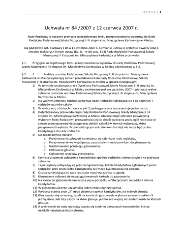 S tr ona |1 Uchwała nr 84 /2007 z 12 czerwca 2007 r. Rady Rodziców w sprawie przyjęcia szczegółowego trybu przeprowadzania wyborów do Rady Rodziców Paostwowej Szkoły Muzycznej I i II stopnia im. Mieczysława Karłowicza w Mielcu. Na podstawie Art. 4 ustawy z dnia 11 kwietnia 2007 r. o zmianie ustawy o systemie oświaty oraz o zmianie niektórych innych ustaw (Dz. U. nr 80, poz. 542) Rada Rodziców Paostwowej Szkoły Muzycznej I i II stopnia im. Mieczysława Karłowicza w Mielcu uchwala: §1 Przyjęcie szczegółowego trybu przeprowadzania wyborów do rady Rodziców Paostwowej Szkoły Muzycznej I i II stopnia im. Mieczysława Karłowicza w Mielcu określonego w § 2. §2 1. Rodzice uczniów Paostwowej Szkoły Muzycznej I i II stopnia im. Mieczysława Karłowicza w Mielcu wybierają swoich przedstawicieli do Rady Rodziców Paostwowej Szkoły Muzycznej I i II stopnia im. Mieczysława Karłowicza w Mielcu w sposób następujący: 1) W terminie ustalonym przez Dyrektora Paostwowej Szkoły Muzycznej I i II stopnia im. Mieczysława Karłowicza w Mielcu zwoływane jest we wrześniu 2007 r. pierwsze walne zebranie rodziców uczniów Paostwowej Szkoły Muzycznej I i II stopnia im. Mieczysława Karłowicza w Mielcu. 2) Na walnym zebraniu rodzice wybierają Radę Rodziców składającą się z co najmniej 7 rodziców uczniów szkoły. 3) W wyborach, o których mowa w pkt 2, jednego ucznia reprezentuje jeden rodzic. 4) Dotychczasowy przewodniczący rady Rodziców Paostwowej Szkoły Muzycznej I i II stopnia im. Mieczysława Karłowicza w Mielcu otwiera częśd zebrania poświęconą wyborom Rady Rodziców i przewodniczy jej do chwili wybrania przez ogół rodziców ze swego grona przewodniczącego oraz dwóch członków komisji wyborczej, która przeprowadzi wybory. Przewodniczącym ani członkom komisji nie może byd osoba kandydująca do rady rodziców. 5) Do zadao komisji należy: a. Przyjmowania zgłoszeo kandydatur na członków rady rodziców, b. Przyjmowanie we współpracy z pozostałymi rodzicami kart do głosowania, c. Nadzorowanie przebiegu głosowania, d. Obliczanie głosów, e. Ogłoszenie wyników głosowania. 6) Komisja przyjmuje zgłoszenia kandydatów spośród rodziców, którzy przybyli na pierwsze zebranie. 7) Tajne wybory odbywają się przy nieograniczonej liczbie kandydatów zgłoszonych przez rodziców, przy czym liczba kandydatów nie może byd mniejsza niż siedem. 8) Osoba kandydująca do rady rodziców musi wyrazid na to zgodę. 9) Głosowanie odbywa się na przygotowanych kartach do głosowania. 10) Na karcie do głosowania umieszcza się w porządku alfabetycznym nazwiska i imiona kandydatów. 11) W głosowaniu bierze udział tylko jeden rodzic danego ucznia. 12) Wyborca stawia znak „X” obok siedmiu nazwisk kandydatów, na których głosuje. 13) Głos uważa się za ważny, jeżeli na karcie do głosowania wyborca wskazał znakiem X jedną, dwie, lub trzy osoby na które głosuje, jednak nie więcej niż siedem osób na których głosuje. 14) A wybranych do rady rodziców uważa się siedmiu pierwszych kandydatów, którzy uzyskali największe liczby głosów. S tr ona |2 2. Przebieg czynności, o których mowa w ust. 1, dokumentuje protokół sporządzony przez jednego z członków komisji wyborczej, a podpisany przez jej pełen skład. 3. Protokół z wyborów, o których mowa w ust. 2 dotychczasowy przewodniczący rady Rodziców przekazuje Dyrektorowi, a następnie Dyrektor przekazuje protokół Przewodniczącemu nowej Rady Rodziców. 4. Pierwsze posiedzenia rady Rodziców zwołuje Dyrektor Szkoły w dniu wyborów. 5. Dyrektor Szkoły otwiera pierwsze posiedzenie Rady Rodziców i przewodniczy mu do chwili wybrania przez ogół członków Rady Rodziców ze swego grona przewodniczącego zebrania, który kieruje dalszą częścią obrad. §3 Wykonanie uchwały powierza się Dyrektorowi Paostwowej Szkoły Muzycznej I i II stopnia im. Mieczysława Karłowicza w Mielcu. §4 Uchwała wchodzi w życie z dniem podjęcia.