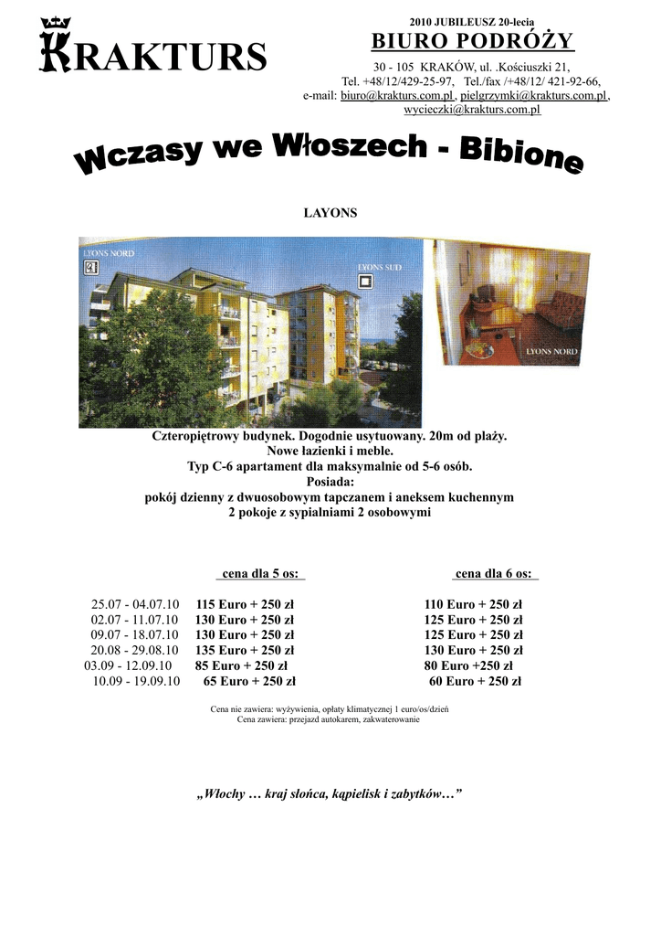2010 JUBILEUSZ 20-lecia RAKTURS BIURO PODRÓŻY 30 - 105 KRAKÓW, ul. .Kościuszki 21, Tel. +48/12/429-25-97, Tel./fax /+48/12/ 421-92-66, e-mail: [email protected] , [email protected], [email protected] LAYONS Czteropiętrowy budynek. Dogodnie usytuowany. 20m od plaży. Nowe łazienki i meble. Typ C-6 apartament dla maksymalnie od 5-6 osób. Posiada: pokój dzienny z dwuosobowym tapczanem i aneksem kuchennym 2 pokoje z sypialniami 2 osobowymi cena dla 5 os: 25.07 - 04.07.10 02.07 - 11.07.10 09.07 - 18.07.10 20.08 - 29.08.10 03.09 - 12.09.10 10.09 - 19.09.10 115 Euro + 250 zł 130 Euro + 250 zł 130 Euro + 250 zł 135 Euro + 250 zł 85 Euro + 250 zł 65 Euro + 250 zł cena dla 6 os: 110 Euro + 250 zł 125 Euro + 250 zł 125 Euro + 250 zł 130 Euro + 250 zł 80 Euro +250 zł 60 Euro + 250 zł Cena nie zawiera: wyżywienia, opłaty klimatycznej 1 euro/os/dzień Cena zawiera: przejazd autokarem, zakwaterowanie „Włochy … kraj słońca, kąpielisk i zabytków…”