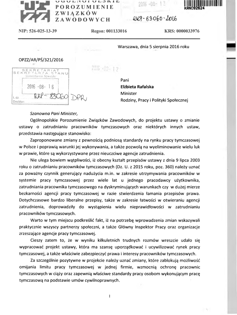 V U V/ U V/ I U llllllllllllllll L/ O I \ 1 L POROZUMIENIE ZWIĄZKÓW ZAWODOWYCH NIP: 526-025-13-39 KPN092624 W Regon: 001133016 - 62. o G O ' i o l i ) KRS: 0000033976 Warszawa, dnia 5 sierpnia 2016 roku OPZZ/AR/PŚ/321/2016 S E K R E T A R I AT S E K R E T A R 7A STANU Pani Elżbieta Rafalska Minister Rodziny, Pracy i Polityki Społecznej ! 2016 - 08- 16 j L.dz...... DocMan m t. t m o î> p p j Szanowna Pani Minister, Ogólnopolskie Porozumienie Związków Zawodowych, do projektu ustawy o zmianie ustawy o zatrudnianiu pracowników tymczasowych oraz niektórych innych ustaw, przedstawia następujące stanowisko: Zaproponowane zmiany z pewnością podniosą standardy na rynku pracy tymczasowej w Polsce i poprawią warunki jej wykonywania, a także pozwolą na wyeliminowanie wielu luk w prawie, które są wykorzystywane przez nieuczciwe agencje zatrudnienia. Nie ulega bowiem wątpliwości, iż obecny kształt przepisów ustawy z dnia 9 lipca 2003 roku o zatrudnianiu pracowników tymczasowych (Dz. U. z 2015 roku, poz. 360) należy uznać za poważny czynnik generujący nadużycia m.in. w zakresie utrzymywania pracowników w systemie pracy tymczasowej przez wiele lat u jednego pracodawcy użytkownika, zatrudniania pracownika tymczasowego na dyskryminujących warunkach czy w dużej mierze bezkarności agencji pracy tymczasowej w razie stwierdzenia łamania przepisów prawa. Dotychczasowe bardzo liberalne przepisy, także w zakresie łatwości w otwieraniu agencji zatrudnienia, doprowadziły do wystąpienia wielu nieprawidłowości w zatrudnianiu pracowników tymczasowych. Warto w tym miejscu podkreślić fakt, iż na potrzebę wprowadzenia zmian wskazywali praktycznie wszyscy partnerzy społeczni, a także Główny Inspektor Pracy oraz organizacje zrzeszające agencje pracy tymczasowej. Cieszy zatem to, że w wyniku kilkuletnich trudnych rozmów wreszcie udało się wypracować projekt ustawy, która ma szansę uporządkować i ucywilizować rynek pracy tymczasowej, a także właściwie zabezpieczyć prawa i interesy pracowników tymczasowych. Za szczególnie pozytywne w projekcie należy uznać zmiany, które zablokują możliwość omijania limitu pracy tymczasowej w jednej firmie, wzmocnią ochronę pracownic tymczasowych w ciąży oraz zapewnią właściwe standardy pracy osobom wykonującym pracę tymczasową na podstawie umów cywilnoprawnych. 1 Pozytywnie należy ocenić również wprowadzenie nowych regulacji określających odpowiedzialność wykroczeniową agencji pracy tymczasowej i pracodawcy użytkownika. W wyniku tych zmian poprawi się skuteczność i efektywność działań kontrolnych prowadzonych przez Państwową Inspekcję Pracy, która mając na uwadze skalę nieprawidłowości w zatrudnianiu tymczasowym, wielokrotnie postulowała rozszerzenie katalogu wykroczeń z tytułu naruszenia przepisów przedmiotowej ustawy. Zasadne są również zmiany wprowadzane do ustawy z dnia 20 kwietnia 2004 roku o promocji zatrudnienia i instytucjach rynku pracy (Dz. U. z 2016 roku, poz. 645, 691 i 868), które zobowiązują agencje zatrudnienia do posiadania stosownego zabezpieczenia finansowego w formie gwarancji bankowej lub ubezpieczeniowej oraz dają marszałkowi województwa prawo monitorowania spraw związanych z opłacaniem składek na ubezpieczenie społeczne. Takie rozwiązania powinny sprzyjać wyeliminowaniu z rynku pracy nieuczciwych podmiotów, których jedynym celem działania jest chęć szybkiego zysku kosztem zatrudnionych pracowników. Z poważaniem Wiceprzewodpićai jPZZ Andrzej Radzikowski 2