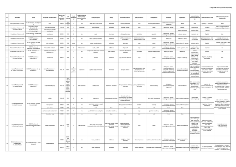 Załącznik nr 4c (opis budynków) Lp. Placówka Adres budynek - przeznaczenie powierzch nia całkowita (w m2) rok budowy ilość kondygna cji podpiwniczenie/ kondygnacje poniżej poziomu "0" ściany budynku stropy konstrukcja dachu pokrycie dachu rodzaj dachu instalacje 1 Pszczyński Zarząd Edukacji 43-200 Pszczyna, ul. Zdrojowa 4 biuro 368,50 lata osiemdzie siąte 2 nie cegła pełna ściany nośne drewniane dźwigary drewniane papa spadzisty jednostronnie elektryczne,wodociągowe, odgromowe Przedszkole Publiczne nr 2 im Juliana Tuwima budynek przedszkola 1125,00 1967 1 częściowe beton/żelbeton żelbetowe dźwigary stalowe papa płaski elektryczna, gazowa, 2 43-200 Pszczyna ul. Zamenhofa 12 43-200 Pszczyna ul.Poniatowskiego 5 3 Przedszkole Publiczne nr 4 43-200 Pszczyna, ul. Narcyzów 30 przedszkole 280,00 1969 2 tak cegła drewniane dźwigary drewniane dachówka spadzisty elektryczna, gazowa, wodociągowa, odgromowa 4 Przedszkole Publiczne nr 7 43-200 Pszczyna, ul. Staromiejska 41 Przedszkola 302,55 2005 3 tak beton wylewany na mokro żelbetowe kształtowniki stalowe w stropodachu dachówka bitumiczna, 1xpapa na płytach OSB spadzisty 5 Przedszkole Publiczne nr 8 43-200 Pszczyna, ul. Jana Kupca 1 cele oswiatowe 600,00 1962 parter tak cegła , pustaki żelbeton żelbetowe akermany papa 6 Przedszkole Publiczne nr 10 43-229 Ćwiklice, ul. Aleksandra Zawadzkiego 5 Przedszkole Publiczne 326,80 1904 2 tak cześciowe cegła, pustak żelbetowe stropodach papa Przedszkole Publiczne nr 14 43-245 Studzionka, ul. Jedności 7 budynek przedszkolny z mieszkańcami tak ncegła pełna,wkład ścian nośnychmieszany cegła i drewno drewniana, dwustalowa, płatniowa 7 8 9 10 11 12 13 Przedszkole Publiczne nr 21 im. Misia Puchatka Szkoła Podstwowa nr 1 im. Książąt Pszczyńskich Szkoła Podstwowa nr 2 im. Jadwigi Śląskiej Szkoła Podstwowa nr 4 im. Józefa Pukowca Szkoła Podstwowa nr 7 im. Żołnierzy Września Szkoła Podstwowa nr 8 w Rudołtowicach im. Józefa Weszki 43-200 Pszczyna, ul. Księżycowa 27 43-200 Pszczyna, ul. Ks. Bp. Bogedaina 1 43-200 Pszczyna, ul. Katowicka 47 43-200 Pszczyna, ul. Marii Konopnickiej 39 43-229 Ćwiklice, ul. Męczenników Oświęcimskich 71 43-229 Rudołtowice, ul. Anieli Krzywoń 5 mieszkanie na potrzeby przedszkola przedszkole ostatnie istotne remonty/moderniza cje zabezpieczenia p.poż własne dach hydranty - 2, gasnice-2 alarm miejskie remont dachu 10 gaśnic kraty w pomieszczeniach z komputerami (2 pomieszcz.) własne-elektryczne wymiana okien 3 gaśnice własne - gazowe malowanie sali 5 gaśnic brak elektryczna Kotłownia z ZS nr2 malowanie pomieszczeń gaśnica proszkowa -3szt; hydrant wewnętrzny 3 szt Instalacjia alarmowa we wszystkich pomieszczeniach płaski elektryczna, gazowa, wodociągowa, odgromowa wlasne piece CO gazowe ocielenie dachu 6 gaśnic płaski elektryczna, gazowa, wodociągowa, odgromowa wlasne- gazowe- piec wymiana pieca gazowego X 2011 2 gaśnice nie własne-gaz remont łazienek,piętro 5 gaśnic nie miejskie - cieplociąg zmiana pokrycia dachu, remont łazienek, 6 sal, remont kuchni, wymiana podłóg w holu i salach 6 gaśnic, 2 hydranty wewnętrzne brak Gaśnica proszkowa-10 szt.,gaśnica śniegowa-2 szt., gaśnica wodnopianowa 1 szt., hydrant wewnętrzny-6 szt. kraty w drzwiach w Sali informatycznej, monitoring zewnętrzny i wewnętrzny, instalacja alarmowa na korytarzach monitoring wewnątrz i na zewnątrz,alarm w sekretariacie, bibliotece i pracowni komputerowej, kraty w oknach pokój nauczycielski, biblioteka, gabinet pielęgniarki, 1 1970 928,25 1984 2 1 nie żelbeton żelbetowe płyty dachowe żelbetowe dachówka papa spadzisty,wiekospadowy elektryczna,gazowa, ogrzewanie płaski elektryczna, gazowa, wodociągowa, odgromowa cztery kotły centralnego ogrzewania gazowego wykonanie drenażu,izolacji,pozio mej i pionowej ścian piwnic-etap III oraz roboty ogólnobudowlane ; osuszenie,odggrzybia nie oraz izolacja przewiwwilgociowa budynku Szkoły 3483,17 1897r. 3nadziemna ,1podziemna częściowe z pełnej cegły ceramicznej drewniane dżwigary stalowe dach wentylowany- płyta zelazobetonowa na żebrach pokryta papą płaski elektryczna, gazowa, wodno-kanalizacyjna, cztery kotły centralnego ogrzewania gazowego, instalacja piorunochronna, budynek dydaktyczny 1423,50 1912budynek główny 1975obiekt sportowy, 20062010 kolejne rozbudow y 3 tak- częściowo cegła/pustaki drewniane, żelbetowe dźwigary stalowe, dźwigary drewniane papa, gonty bitumiczne, dachówka płaski, spadzisty elektryczna, gazowa,wodociągowa, odgromowa własne-kotłownia 2010- remont obiektu sportowego, 20112012-odnawianie elewacji szkoły, ostatni etap wymiany okien gaśnice-18 hydranty wewnętrzne -1 hydranty zewnętrzne - 0 szkoła 1008,06 1981 2 tak cegła pelna żelbetony, płyty kanałowe elementy dachu to prefabrykowane płyty oparte na murach nośnych oraz na murkach ażurowych dach płaski dwuspadowy elektryczna, gazowa, wodociągowa, odgromowa własne- kotłownia gazowa modernizacja kotłowni gazowej 7 gaśnic, 2 hydranty wewnętrzne Szkoła Podstawowa nr 1 budynek szkolny hala sportowa 648,00 2005 1 nie część ścian żelbetony, część poliwęglan plac zabaw 442,50 2008 brak nie brak brak zaplecze socjalne z łącznikiem 190,00 2007 1 nie pustaki betonowe, cegła pełna stropodach żelbetowy plac zabaw duży 493,00 2014 brak nie brak brak szkoła podstawowa stara część szkoły - stropy stara część szkoły- cegła drewniane nowa część szkoły- beton/żelbeton nowa część szkoły - stropy żelbetowe 1689,30 19361939 3 tak/częściowe 480,00 2008 Sala gimn. z zaplecze m 2 nie beton, ocieplenie 890,00 1993 szkoła 3 tak cegła, ocieplenie szkoła/edukacja dźwigary drewniane łukowe plandeka łukowaty elektryczna, gazowa, wodociągowa, odgromowa własne, kotłownia gazowa brak brak brak brak brak papa płaski dwuspadowy elektryczna, gazowa, wodociągowa, odgromowa brak brak brak brak 1 gaśnica, 1 hydrant wewnętrzny zabezpieczenia przeciw 
