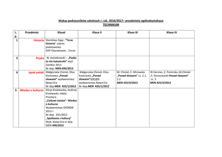 Wykaz podręczników szkolnych r. szk. 2016/2017– przedmioty ogólnokształcące TECHNIKUM L. p. 1 Przedmiot KlasaI Klasa II Klasa III Klasa IV Historia Stanisław Zając .”Teraz historia”-zakres podstawowy. SOP Oświatowiec ,Toruń 3 Fizyka W. Kwiatkowski – „Fizyka to nie katastrofa” wyd. ZamKor 2013 Nr dop. MEN 694/2013 4 Język polski Małgorzata Chmiel, Eliza Kostrzewa „Ponad słowami” wydawnictwo Nowa Era Nr dop.MEN 425/1/2012 5 Wiedza o kulturze Alicja Kisielewska, Andrzej Kisielewski, Adela Prochyra „Ciekawi świata”- Wiedza o kulturze Wydawnictwo OPERON 2012 r. Nr dop. 631/2012 „Spotkania z kulturą” Wyd. Nowa Era nr dop. MEN 449/2012 Małgorzata Chmiel, Eliza Kostrzewa „Ponad słowami”1/2,2/1 wydawnictwo Nowa Era Nr dop.MEN 425/1/2012 M. Chmiel, E. Mirowska „Ponad słowami” cz. 2.1, 2.2 MEN 425/4/2013 W.Hermes ,Z. Pomirska ,M.Chmiel ,P, Doroszewski Ponad słowami” cz. 3 MEN 425/4/2013 6 Język niemiecki S. Mróz-Dwornikowska, K. szachowska - „Meine Welttour 1”- poziom podstawowy – Nowa Era 2012 Nr ew. 459/1/2012. J. Korba, Z. Smutek – 7 Podstawy Przedsiębiorczości Podstawy przedsiębiorczości „odkrywamy na nowo” Wyd. OPERON 2012 Nr dop. 483/2012 8 Matematyka 9 Biologia Będzie podany we wrześniu E. Bonar, W. KrzeszowiecJeleń, St. Czachrowski – „Biologia na czasie” – Nowa Era – nr dop. 450/2012 S. Mróz-Dwornikowska, K. Szachowska - „Welttour 1”i „Welttour 2”- poziom podstawowy – Nowa Era 2012 Nr ew. 459/1/2012. S. Mróz-Dwornikowska, S. Mróz-Dwornikowska, K. K. Szachowska- „Welttour Szachowska- „Welttour 2”- poziom 2”- poziom podstawowy – podstawowy – Nowa Era 2012 Nowa Era 2012 Nr ew. 459/1/2012. Nr ew. 459/1/2012. J. Korba, Z. Smutek – Podstawy przedsiębiorczości „odkrywamy na nowo” Wyd. OPERON 2012 Nr dop. 483/2012 W. Babiański, L. Chańko, „Matematyka 1” i „Matematyka 2”wyd. Nowa Era nr ew. 360/1/2011 i 360/2/2013 Poziom rozszerzony W. Babiański, L. Chańko, „Matematyka 2”wyd. Nr ew. 360/2/2013 Nowa Era, p. rozrzeszony Ne ew. MEN 360/2/2013 W. Babiański, L. Chańko, J. Czarnowska, G. Janocha – „Matematyka 3”wyd. Nowa Era, 10 Chemia R. Hassa, A. Mrzigod, J. Mrzigod “To jest chemia” Wyd. Nowa Era 2012 M. Litwin, Sz.StykaWlazło, J. Szymońska „To jest chemia 1” Chemia ogólna i nieorganiczna zakres rozszerz. Wydawnictwo "Nowa Era". M. Litwin, Sz. Styka – „To jest chemia 1 „ Chemia ogólna i nieorganiczna’ zakres rozszerz. Wyd. Nowa Era 2012 Nr ew. MEN 581/1/2012 M. Litwin, Sz. StykaWlazło, J. Szymońska – „To jest chemia 1”Chemia ogólna i nieorganiczna” zakres rozszerz. M. Litwin, Sz. StykaWlazło, J. Szymońska – „To jest chemia ”Chemia organiczna zakres rozszerz. Wyd. Nowa Era Nr ew. MEN 581/1/2012 M. Litwin, Sz. Styka-Wlazło, J. Szymońska – Chemia organiczna. Zakres rozszerzony Nr dop. MEN 438/2012 11 12 Geografia Język angielski Będzie podane informacja we wrześniu R.Malarz ,M.Więckowski„Oblicza Geografii” Nowa Era Nr dop MEN 501/1/2012. Zakres rozszerzony T. Falla, P.A. Davis, J.Sosnowska Oxford University Press NEW Matura Solutions – T.Falla,P.Davies J.Mordawski ,w .Wiecki„Geografia Polski” Operon T.Rachwał „Oblicza geografii cz.2 Nowa Era Nr dop.MEN 501/2/2013 NEW Matura Solutions – T.Falla,P.Davies R.Malarz ,M.Więckowski-„Oblicza Geografii 3” Nowa Era Nr dop MEN 501/3/2014. Zakres rozszerzony Oxford University Press Oxford University Press Oxford University Press Nr ewid. 315/2/2011 Nr ewid. 315/2/2011 Nr ewid. 315/2/2011 NEW Matura Solutions – T.Falla,P.Davies Pre – Intermediate Nr ewid. 315/2/2011 13 Edukacja dla bezpieczeństwa B. Boniek, A. Kruczyński, Ł. Wrycz-Rekowski – Ciekawi świata- Edukacja dla bezpieczeństwa – OPERON + zeszyt ćwiczeń Nr dop. MEN 409/2012 14 Wiedza o społeczeństwie Z. Smutek, J. Maleska Odkrywamy na nowo – wiedza o społeczeństwie Nr dop. MEN 407/2012 15 Informatyka 16 Wychowanie do życia w rodzinie 17 Historia i społeczeństwo A.Gawełek - Odkrywamy na nowo – informatyka – zakres podstawowy Nr dop. MEN 452/2012 „Wędrując ku dorosłości” „Wędrując ku dorosłości” wyd. Rubikon wyd. Rubikon O. Pytlińska, A. Wyroda „Ojczysty panteon i ojczyste spory” WSiP 644/1/2013 „Wędrując ku dorosłości” wyd. Rubikon O. Pytlińska, A. Wyroda „Ojczysty panteon i ojczyste spory” WSiP 644/1/2013 Wykaz podręczników szkolnych w r. szk. 2016/2017– przedmioty ogólnokształcące ZASADNICZA SZKOŁA ZAWODOWA Przedmiot 1 Klasa I Język polski E. Nowosielska, U. Szydłowska – „Zrozumieć świat” cz. 1 – język polski Wyd. Nowa Era Nr dop. MEN 584/1/2012 2 Fizyka W. Kwiatkowski – „Fizyka to nie katastrofa” wyd. ZamKor 2013 Nr dop. MEN 694/2013 Klasa II E. Nowosielska, U. Szydłowska – „ Zrozumieć świat (2) „ Wyd. Nowa Era Nr dop. MEN 584/1/2012 Klasa III E. Nowosielska, U. Szydłowska – „ Zrozumieć świat cz. 2 „ Wyd. Nowa Era Nr dop. MEN 584/1/2012 3 Podstawy J. Korba, Z. Smutek – Podstawy przedsiębiorczości przedsiębiorczości „odkrywamy na nowo” Wyd. OPERON 2012 Nr dop. 483/2012 4 5 6 Biologia E. Bonar, W. Krzeszowiec-Jeleń, St. Czachrowski „Biologia na czasie” Nowa Era nr dop. 450/2012 Matematyka L.E. Wojciechowska, M. Bryński, K. Szymański – „Matematyka dla ZSZ” WSiP Nr dop.MEN 580/1/2012 L.E. Wojciechowska, M. Bryński, K.Szymański – „Matematyka dla ZSZ” WSiP nr Ew. 580/1/2012 L.E. Wojciechowska, M. Bryński, K. Szymański – „Matematyka dla ZSZ” WSiP Nr dop.MEN 580/1/2012 In English – P. Viney – Oxford New Horizons – poziom elementarny DKOS-4015/118/02 MEN Historia Stanisław Zając .”Teraz historia”-zakres podstawowy. SOP Oświatowiec ,Toruń 7 8 9 Wiedza o Z. Smutek, J. Maleska – społeczeństwie Odkrywamy na nowo – wiedza o społeczeństwie Wyd. OPERON 2012 MEN 407/2012 Geografia Będzie podany we wrześniu Język angielski In English – Peter &K. Viney 
