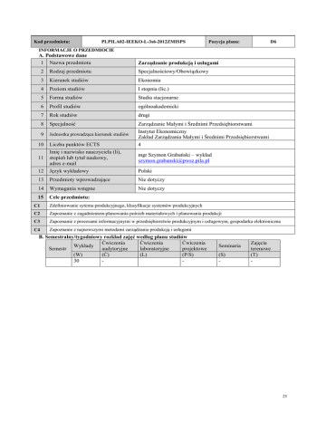 Kod przedmiotu: PLPILA02-IEEKO-L-3s6-2012ZMISPS Pozycja planu: D6 INFORMACJE O PRZEDMIOCIE A. Podstawowe dane 1 Nazwa przedmiotu Zarządzanie produkcją i usługami 2 Rodzaj przedmiotu Specjalnościowy/Obowiązkowy 3 Kierunek studiów Ekonomia 4 Poziom studiów I stopnia (lic.) 5 Forma studiów Studia stacjonarne 6 Profil studiów ogólnoakademicki 7 Rok studiów drugi 8 Specjalność 9 Jednostka prowadząca kierunek studiów Zarządzanie Małymi i Średnimi Przedsiębiorstwami Instytut Ekonomiczny Zakład Zarządzania Małymi i Średnimi Przedsiębiorstwami 4 12 Liczba punktów ECTS Imię i nazwisko nauczyciela (li), stopień lub tytuł naukowy, adres e-mail Język wykładowy 13 Przedmioty wprowadzające Nie dotyczy 14 Wymagania wstępne Nie dotyczy 15 Cele przedmiotu: 10 11 mgr Szymon Grabański – wykład [email protected] Polski C1 Zdefiniowanie sytemu produkcyjnego, klasyfikacje systemów produkcyjnych C2 Zapoznanie z zagadnieniem planowania potrzeb materiałowych i planowania produkcji C3 Zapoznanie z procesami informacyjnymi w przedsiębiorstwie produkcyjnym i usługowym, gospodarka elektroniczna C4 Zapoznanie z najnowszymi metodami zarządzania produkcją i usługami B. Semestralny/tygodniowy rozkład zajęć według planu studiów Ćwiczenia Ćwiczenia Ćwiczenia Wykłady audytoryjne laboratoryjne projektowe Semestr (W) (Ć) (L) (P/S) 30 - Seminaria (S) - Zajęcia terenowe (T) - 25 PRZEDMIOTOWE EFEKTY KSZTAŁCENIA (wg KRK) Efekt EP1 EP2 EP3 Po zakończeniu przedmiotu i potwierdzeniu osiągnięcia efektów kształcenia student: Objaśnia podstawowe definicje związane z zarządzaniem produkcją i usługami, wymienia podstawowe systemy produkcyjne i potrafi je opisać, graficznie odwzorowuje system jakim jest przedsiębiorstwo Samodzielnie określa zapotrzebowanie materiałowe wymagane do produkcji oraz planuje proces produkcyjny Samodzielnie analizuje procesy produkcyjne i i informacyjne w firmie, potrafi odwzorować proces produkcyjny i informacyjny Odniesienie przedmiotowych efektów kształcenia do efektów kształcenia dla celów kierunku obszaru C1 K_W29 C2 K_U32 C3 K_U32 EP4 Rozumie ekonomiczne i społeczne aspekty organizacji systemów produkcyjnych C1, C4 K_K21 EP5 Rozumie i wyjaśnia nowoczesne metody zarządzania produkcją i usługami C4 K_W29 S1A_W07 S1A_W11 S1A_U02 S1A_U07 S1A_U02 S1A_U07 S1A_K04 S1A_K05 S1A_K07 S1A_W07 S1A_W11 TREŚCI PROGRAMOWE ODNIESIONE DO EFEKTÓW KSZTAŁCENIA T liczba godzin Treści programowe EP Forma: wykład T1W T2W T3W T4W T5W T6W T7W T8W T9W T10W T11W T12W T13W T14W T15W Przedsiębiorstwo, a łańcuch dostaw (Podstawowe definicje, przedsiębiorstwo produkcyjne w ujęciu systemowym, logistyka przedsiębiorstwa przemysłowego) Zarządzanie produkcją (Podstawowe definicje, poziomy zarządzania, zarządzanie, a sterowanie, decyzje w zarządzaniu) System produkcyjny (Struktura systemu produkcyjnego, elementy składowe systemu produkcyjnego, uogólniony model systemu produkcyjnego, otoczenie systemu produkcyjnego) Klasyfikacja systemów produkcyjnych (charakterystyka liniowego, gniazdowego układu produkcyjnego oraz specjalizacji przedmiotowej) Strategie projektowania struktur produkcyjnych (Oparte o kryterium technicznoekonomiczne, socjologiczno-psychologiczne, zaawansowanej techniki wytwarzania AMT i zaawansowanej/wysokiej techniki HT) Struktura organizacyjna przedsiębiorstwa (Struktura produkcyjno-administracyjna, omówienie czynników kształtujących strukturę administracyjną przedsiębiorstwa) Zarządzanie zapasami I (Podstawowy model zapasów, optymalna wielkość dostawy, wzór Wilsona, omówienie modeli szacowania popytu, koncepcja VMI w planowaniu produkcji, analiza ABC w zarządzaniu zapasami) Zarządzanie zapasami II (Koncepcja VMI w planowaniu produkcji, analiza ABC w zarządzaniu zapasami) Planowanie produkcji I (Struktura i hierarchia planów w przedsiębiorstwie, planowanie, a sterowanie, charakterystyka planów operacyjnych, taktycznych i strategicznych w planowaniu produkcji) Planowanie produkcji II (Charakterystyka systemów produkcyjnych: produkcja na zamówienie (make to order); produkcja na magazyn (make to stock), złożenie na zamówienie (assembly to order)) Informacja w przedsiębiorstwie (Analiza procesów w przedsiębiorstwie produkcyjnym, mapowanie procesów, pętla zarządzania w procesach produkcyjnych) Funkcjonalność Zintegrowanych Systemów Informatycznych (Informacja w przedsiębiorstwie, omówienie podstawowych funkcji systemów klasy ERP, MRP i WMS) Nowoczesne systemu zarządzania produkcją I (Elastyczne systemy wytwórcze FMS, zintegrowane systemy wytwórcze) Nowoczesne systemu zarządzania produkcją II (Zarządzanie przez jakość TQM, reengineering, X-engineering) Nowoczesne systemu zarządzania produkcją III (Uszczuplone zarządzanie – Lean Manufacturing, Kaizen) 2 EP1 2 EP1 2 EP1 2 EP1 3 EP1, EP4 1 EP1 2 EP2 2 EP2 2 EP2, EP3 2 EP2, EP3 2 EP3 2 EP3 2 EP4, EP5 2 EP4, EP5 2 EP4, EP5 26 LITERATURA Literatura podstawowa Literatura uzupełniająca D. BURCHART-KOROL, J. FURMAN: Zarządzanie produkcją i usługami, Wydawnictwo Politechniki Śląskiej, Gliwice 2007 S. KRZYŻANIAK: Podstawy zarządzania zapasami w przykładach, Biblioteka Logistyka, Poznań 2002 M. FERTSCH (Red.): Logistyka produkcji, Biblioteka Logistyka, Poznań 2003 J. ŁAŃCUCKI: Podstawy kompleksowego zarządzania jakością TQM, Akademia Ekonomiczna w Poznaniu, Poznań 2006 Z. MARTYNIAK: Organizacja i zarządzanie. 70 problemów teorii i praktyki., Oficyna Wydawnicza: Drukarnia ANTYKWA s.c., Kraków-Kluczbork 2001 METODY DYDAKTYCZNE Forma kształcenia Metody dydaktyczne Wykład informacyjny wsparty prezentacją mulitmedialną, wykład konwersatoryjny, metody aktywizujące – metoda przypadków, dyskusja dydaktyczna wykład METODY WERYFIKACJI PRZEDMIOTOWYCH EFEKTÓW KSZTAŁCENIA Przedmiotowy efekt kształcenia EP1 EP2 EP3 EP4 EP5 Forma oceny E P X E U T K S W S U P R O D S E P S K I X X X X EP – egzamin pisemny EU – egzamin us