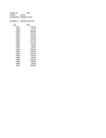 Temat_nr 105 Rzeka Narew wodowskaz Strękowa Góra Przepływy rok 1951 1952 1953 1954 1955 1956 1957 1958 1959 1960 1961 1962 1963 1964 1965 1966 1967 1968 1969 1970 charakterystyczne WQ 184.00 71.70 256.00 64.00 161.00 153.00 142.00 371.00 57.00 119.00 69.40 240.00 94.90 207.00 156.00 94.90 215.00 186.00 58.20 348.00