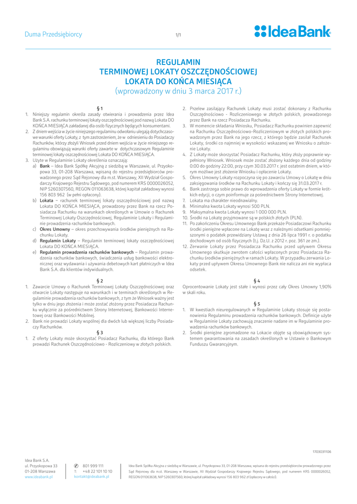 Duma Przedsiębiorcy 1/1 Regulamin TERMINOWEJ LOKATY OSZCZĘDNOŚCIOWEJ Lokata DO KOŃCA MIESIĄCA (wprowadzony w dniu 3 marca 2017 r.) §1 1. Niniejszy regulamin określa zasady otwierania i prowadzenia przez Idea Bank S.A. rachunku terminowej lokaty oszczędnościowej pod nazwą Lokata DO KOŃCA MIESIĄCA zakładanej dla osób fizycznych będących konsumentami. 2. Z dniem wejścia w życie niniejszego regulaminu odwołaniu ulegają dotychczasowe warunki oferty Lokaty, z tym zastrzeżeniem, że w odniesieniu do Posiadaczy Rachunków, którzy złożyli Wniosek przed dniem wejścia w życie niniejszego regulaminu obowiązują warunki oferty zawarte w dotychczasowym Regulaminie terminowej lokaty oszczędnościowej Lokata DO KOŃCA MIESIĄCA. 3. Użyte w Regulaminie Lokaty określenia oznaczają: a) Bank – Idea Bank Spółkę Akcyjną z siedzibą w Warszawie, ul. Przyokopowa 33, 01-208 Warszawa, wpisaną do rejestru przedsiębiorców prowadzonego przez Sąd Rejonowy dla m.st. Warszawy, XII Wydział Gospodarczy Krajowego Rejestru Sądowego, pod numerem KRS 0000026052, NIP 5260307560, REGON 011063638, której kapitał zakładowy wynosi 156 803 962 (w pełni opłacony). b) Lokata − rachunek terminowej lokaty oszczędnościowej pod nazwą Lokata DO KOŃCA MIESIĄCA, prowadzony przez Bank na rzecz Posiadacza Rachunku na warunkach określonych w Umowie o Rachunek Terminowej Lokaty Oszczędnościowej, Regulaminie Lokaty i Regulaminie prowadzenia rachunków bankowych. c) Okres Umowny – okres przechowywania środków pieniężnych na Rachunku Lokaty. d) Regulamin Lokaty – Regulamin terminowej lokaty oszczędnościowej Lokata DO KOŃCA MIESIĄCA. e) Regulamin prowadzenia rachunków bankowych – Regulamin prowadzenia rachunków bankowych, świadczenia usług bankowości elektronicznej oraz wydawania i używania debetowych kart płatniczych w Idea Bank S.A. dla klientów indywidualnych. 2. Przelew zasilający Rachunek Lokaty musi zostać dokonany z Rachunku Oszczędnościowo - Rozliczeniowego w złotych polskich, prowadzonego przez Bank na rzecz Posiadacza Rachunku. 3. W momencie składania Wniosku, Posiadacz Rachunku powinien zapewnić na Rachunku Oszczędnościowo-Rozliczeniowym w złotych polskich prowadzonym przez Bank na jego rzecz, z którego będzie zasilał Rachunek Lokaty, środki co najmniej w wysokości wskazanej we Wniosku o założenie Lokaty. 4. Z Lokaty może skorzystać Posiadacz Rachunku, który złoży poprawnie wypełniony Wniosek. Wniosek może zostać złożony każdego dnia od godziny 0:00 do godziny 22:00, przy czym 30.03.2017 r. jest ostatnim dniem, w którym możliwe jest złożenie Wniosku i opłacenie Lokaty. 5. Okres Umowny Lokaty rozpoczyna się po zawarciu Umowy o Lokatę w dniu zaksięgowania środków na Rachunku Lokaty i kończy się 31.03.2017 r. 6. Bank zastrzega sobie prawo do wprowadzenia oferty Lokaty w formie krótkich edycji, o czym poinformuje za pośrednictwem Strony Internetowej. 7. Lokata ma charakter nieodnawialny. 8. Minimalna kwota Lokaty wynosi 500 PLN. 9. Maksymalna kwota Lokaty wynosi 1 000 000 PLN. 10.Środki na Lokatę przyjmowane są w polskich złotych (PLN). 11. Po zakończeniu Okresu Umownego Bank przekaże Posiadaczowi Rachunku środki pieniężne wpłacone na Lokatę wraz z należnymi odsetkami pomniejszonymi o podatek przewidziany Ustawą z dnia 26 lipca 1991 r. o podatku dochodowym od osób fizycznych (t.j. Dz.U. z 2012 r. poz. 361 ze zm.). 12.Zerwanie Lokaty przez Posiadacza Rachunku przed upływem Okresu Umownego skutkuje zwrotem całości wpłaconych przez Posiadacza Rachunku środków pieniężnych w ramach Lokaty. W przypadku zerwania Lokaty przed upływem Okresu Umownego Bank nie nalicza ani nie wypłaca odsetek. §2 1. Zawarcie Umowy o Rachunek Terminowej Lokaty Oszczędnościowej oraz otwarcie Lokaty następuje na warunkach i w terminach określonych w Regulaminie prowadzenia rachunków bankowych, z tym że Wniosek ważny jest tylko w dniu jego złożenia i może zostać złożony przez Posiadacza Rachunku wyłącznie za pośrednictwem Strony Internetowej, Bankowości Internetowej oraz Bankowości Mobilnej. 2. Bank nie prowadzi Lokaty wspólnej dla dwóch lub większej liczby Posiadaczy Rachunków. §3 1. Z oferty Lokaty może skorzystać Posiadacz Rachunku, dla którego Bank prowadzi Rachunek Oszczędnościowo - Rozliczeniowy w złotych polskich. §4 Oprocentowanie Lokaty jest stałe i wynosi przez cały Okres Umowny 1,90% w skali roku. §5 1. W kwestiach nieuregulowanych w Regulaminie Lokaty stosuje się postanowienia Regulaminu prowadzenia rachunków bankowych. Definicje użyte w Regulaminie Lokaty zachowują znaczenie nadane im w Regulaminie prowadzenia rachunków bankowych. 2. Środki pieniężne zgromadzone na Lokacie objęte są obowiązkowym systemem gwarantowania na zasadach określonych w Ustawie o Bankowym Funduszu Gwarancyjnym. 1703031106 Idea Bank S.A. ul. Przyokopowa 33 01-208 Warszawa www.ideabank.pl 801 999 111 +48 22 101 10 10 [email protected] T: Idea Bank Spółka Akcyjna z siedzibą w Warszawie, ul. Przyokopowa 33, 01-208 Warszawa, wpisana do rejestru przedsiębiorców prowadzonego przez Sąd Rejonowy dla m.st. Warszawy w Warszawie, XII Wydział Gospodarczy Krajowego Rejestru Sądowego, pod numerem KRS 0000026052, REGON 011063638, NIP 5260307560, której kapitał zakładowy wynosi 156 803 962 zł (opłacony w całości).