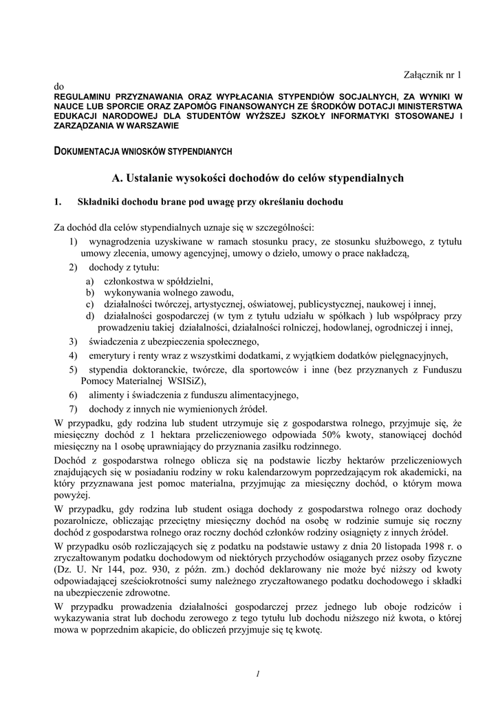 Załącznik nr 1 do REGULAMINU PRZYZNAWANIA ORAZ WYPŁACANIA STYPENDIÓW SOCJALNYCH, ZA WYNIKI W NAUCE LUB SPORCIE ORAZ ZAPOMÓG FINANSOWANYCH ZE ŚRODKÓW DOTACJI MINISTERSTWA EDUKACJI NARODOWEJ DLA STUDENTÓW WYŻSZEJ SZKOŁY INFORMATYKI STOSOWANEJ I ZARZĄDZANIA W WARSZAWIE DOKUMENTACJA WNIOSKÓW STYPENDIANYCH A. Ustalanie wysokości dochodów do celów stypendialnych 1. Składniki dochodu brane pod uwagę przy określaniu dochodu Za dochód dla celów stypendialnych uznaje się w szczególności: 1) wynagrodzenia uzyskiwane w ramach stosunku pracy, ze stosunku służbowego, z tytułu umowy zlecenia, umowy agencyjnej, umowy o dzieło, umowy o prace nakładczą, 2) dochody z tytułu: a) członkostwa w spółdzielni, b) wykonywania wolnego zawodu, c) działalności twórczej, artystycznej, oświatowej, publicystycznej, naukowej i innej, d) działalności gospodarczej (w tym z tytułu udziału w spółkach ) lub współpracy przy prowadzeniu takiej działalności, działalności rolniczej, hodowlanej, ogrodniczej i innej, 3) świadczenia z ubezpieczenia społecznego, 4) emerytury i renty wraz z wszystkimi dodatkami, z wyjątkiem dodatków pielęgnacyjnych, 5) stypendia doktoranckie, twórcze, dla sportowców i inne (bez przyznanych z Funduszu Pomocy Materialnej WSISiZ), 6) alimenty i świadczenia z funduszu alimentacyjnego, 7) dochody z innych nie wymienionych źródeł. W przypadku, gdy rodzina lub student utrzymuje się z gospodarstwa rolnego, przyjmuje się, że miesięczny dochód z 1 hektara przeliczeniowego odpowiada 50% kwoty, stanowiącej dochód miesięczny na 1 osobę uprawniający do przyznania zasiłku rodzinnego. Dochód z gospodarstwa rolnego oblicza się na podstawie liczby hektarów przeliczeniowych znajdujących się w posiadaniu rodziny w roku kalendarzowym poprzedzającym rok akademicki, na który przyznawana jest pomoc materialna, przyjmując za miesięczny dochód, o którym mowa powyżej. W przypadku, gdy rodzina lub student osiąga dochody z gospodarstwa rolnego oraz dochody pozarolnicze, obliczając przeciętny miesięczny dochód na osobę w rodzinie sumuje się roczny dochód z gospodarstwa rolnego oraz roczny dochód członków rodziny osiągnięty z innych źródeł. W przypadku osób rozliczających się z podatku na podstawie ustawy z dnia 20 listopada 1998 r. o zryczałtowanym podatku dochodowym od niektórych przychodów osiąganych przez osoby fizyczne (Dz. U. Nr 144, poz. 930, z późn. zm.) dochód deklarowany nie może być niższy od kwoty odpowiadającej sześciokrotności sumy należnego zryczałtowanego podatku dochodowego i składki na ubezpieczenie zdrowotne. W przypadku prowadzenia działalności gospodarczej przez jednego lub oboje rodziców i wykazywania strat lub dochodu zerowego z tego tytułu lub dochodu niższego niż kwota, o której mowa w poprzednim akapicie, do obliczeń przyjmuje się tę kwotę. 1 2. Lista dowodów potwierdzających dochody i ich wysokość Dowodami potwierdzającymi dochody i ich wysokość przy składaniu i uzupełnianiu wniosków o stypendium socjalne i zapomogi są: 1) zaświadczenia każdego członka rodziny o dochodzie podlegającym opodatkowaniu podatkiem dochodowym od osób fizycznych na zasadach ogólnych, wydane przez właściwy urząd skarbowy, zawierające informacje o: a) wysokości dochodu, b) wysokości składek na ubezpieczenia społeczne odliczonych od dochodu, c) wysokości składek na ubezpieczenie zdrowotne odliczonych od podatku, d) wysokości należnego podatku; 2) zaświadczenia lub oświadczenia dokumentujące wysokość innych dochodów; 3) oświadczenie o deklarowanych dochodach osiąganych przez osoby podlegające przepisom o zryczałtowanym podatku dochodowym od niektórych przychodów osiąganych przez osoby fizyczne, zawierające w szczególności informacje o: a) wysokości dochodu, b) wysokości należnych składek na ubezpieczenia społeczne, c) wysokości należnych składek na ubezpieczenie zdrowotne, d) wysokości i formie opłacanego podatku dochodowego, e) wysokości dochodu po odliczeniu należnych składek i podatku; • zaświadczenie urzędu skarbowego o wysokości należnego zryczałtowanego podatku, w roku kalendarzowym, z którego ustala się dochód, po odliczeniu składki na ubezpieczenie zdrowotne – w przypadku osób rozliczających się z podatku w formie ryczałtu ewidencjonowanego albo • decyzja lub decyzje urzędu skarbowego o wysokości karty podatkowej w roku kalendarzowym, z którego ustala się dochód – w przypadku osób rozliczających się z podatku w formie karty podatkowej, w tym przypadku należny podatek jest różnicą między wysokością karty podatkowej a wysokością składek na ubezpieczenie zdrowotne odliczonych od podatku. 4) inne zaświadczenia lub oświadczenia oraz dowody niezbędne do ustalenia prawa do stypendium socjalnego, w tym: a) orzeczenie o niepełnosprawności lub o stopniu niepełnosprawności, b) prawomocny wyrok sądu rodzinnego stwierdzający przysposobienie lub zaświadczenie sądu rodzinnego lub ośrodka adopcyjno-opiekuńczego o prowadzonym postępowaniu sądowym w sprawie o przysposobienie dziecka, c) prawomocny wyrok sądu rodzinnego orzekający rozwód lub separację, d) orzeczenie sądu rodzinnego o ustaleniu opiekuna prawnego dziecka, e) zaświadczenie o uczęszczaniu dziecka do szkoły lub szkoły wyższej, f) zaświadczenie z urzędu pracy. 5) wielkość gospodarstwa rolnego wyrażoną w hektarach przeliczeniowych ogólnej powierzchni w roku kalendarzowym, z którego ustala się dochód, dokumentuje się: a) zaświadczeniem właściwego organu gminy albo b) nakazem płatniczym za ten rok lub nakazami płatniczymi, jeżeli powierzchnia gospodarstwa uległa zmianie w roku, z którego ustala się dochód. 2 6) Przy ustalaniu dochodu rodziny fakt otrzymywania alimentów i wysokość otrzymywanych alimentów dokumentuje się kopią odpisu prawomocnego wyroku sądu lub kopią odpisu protokołu z posiedzenia zawierająceg